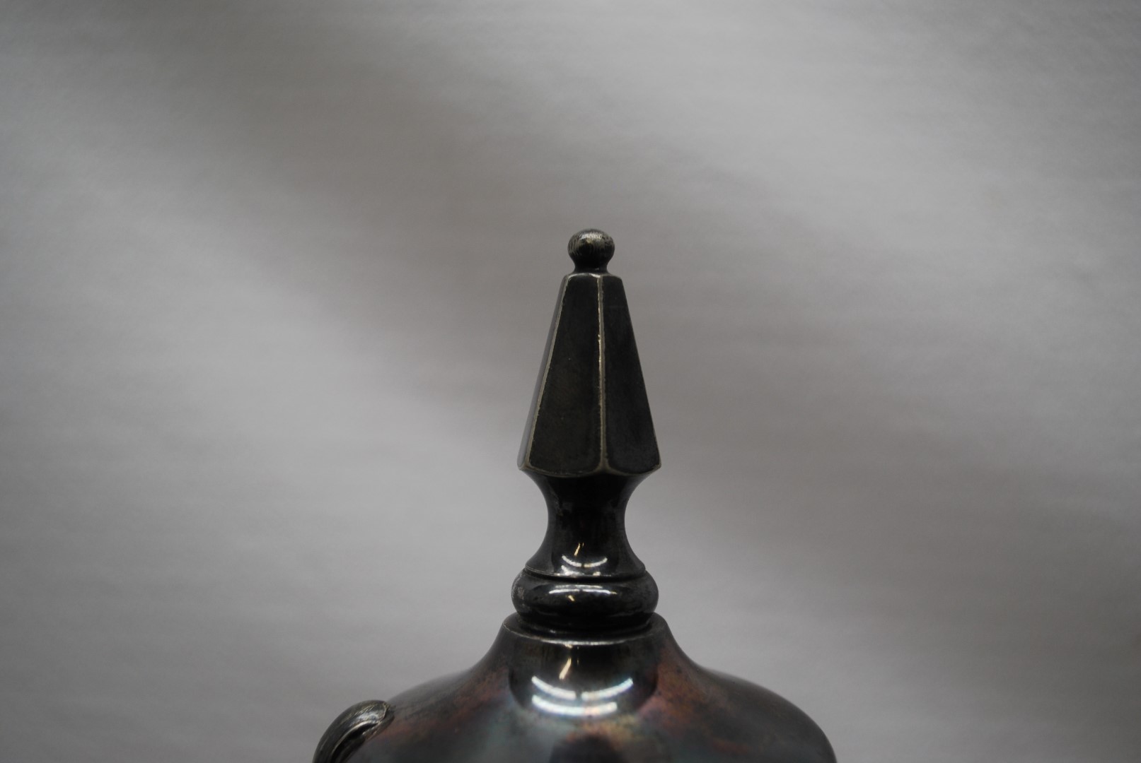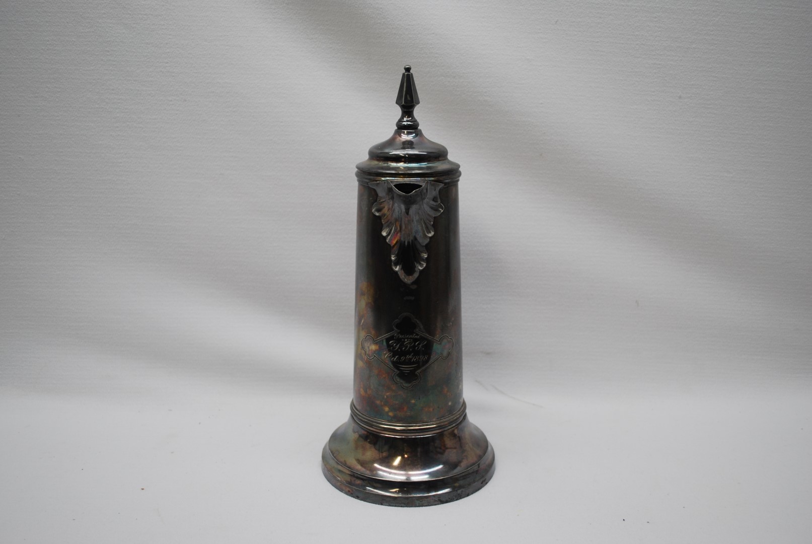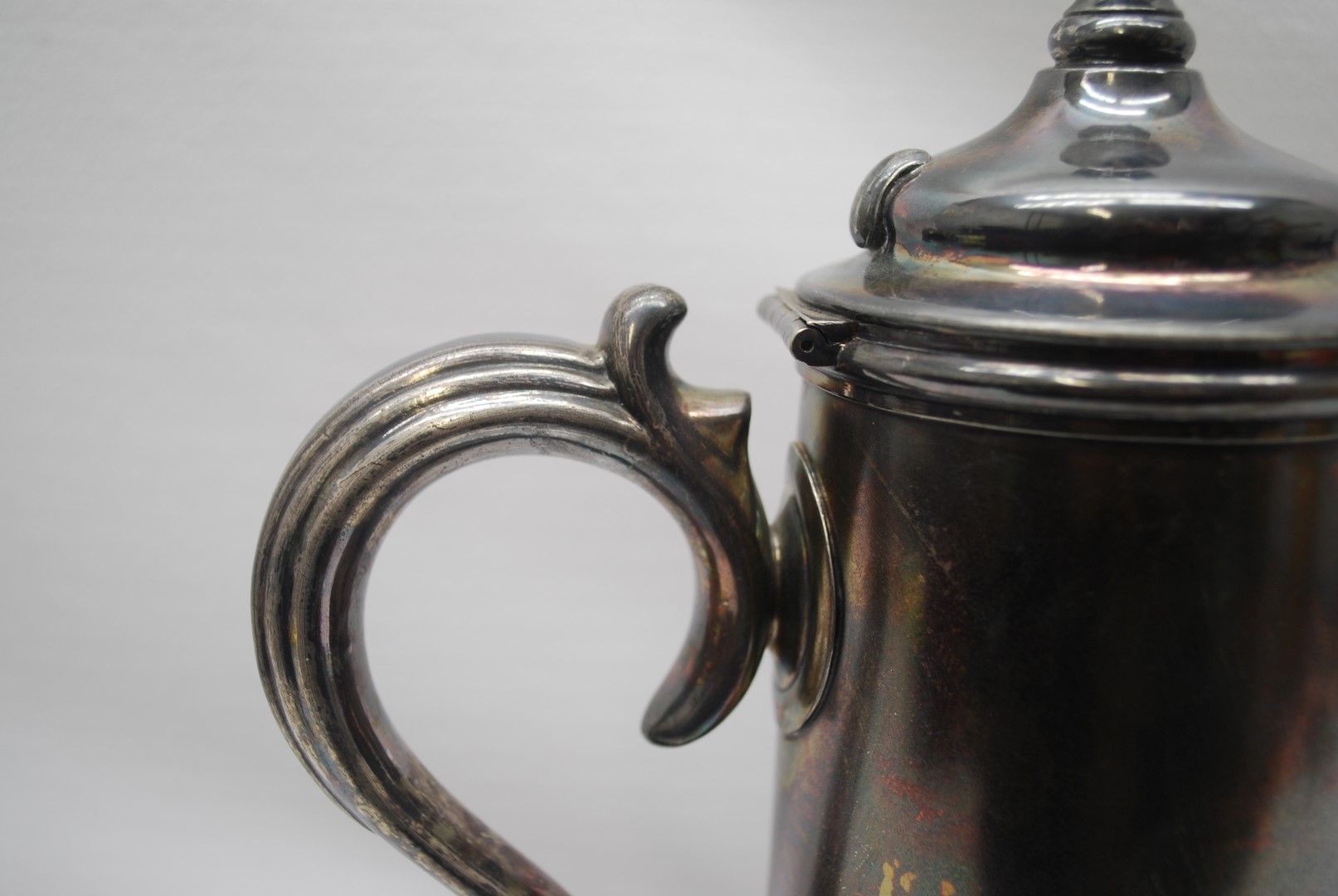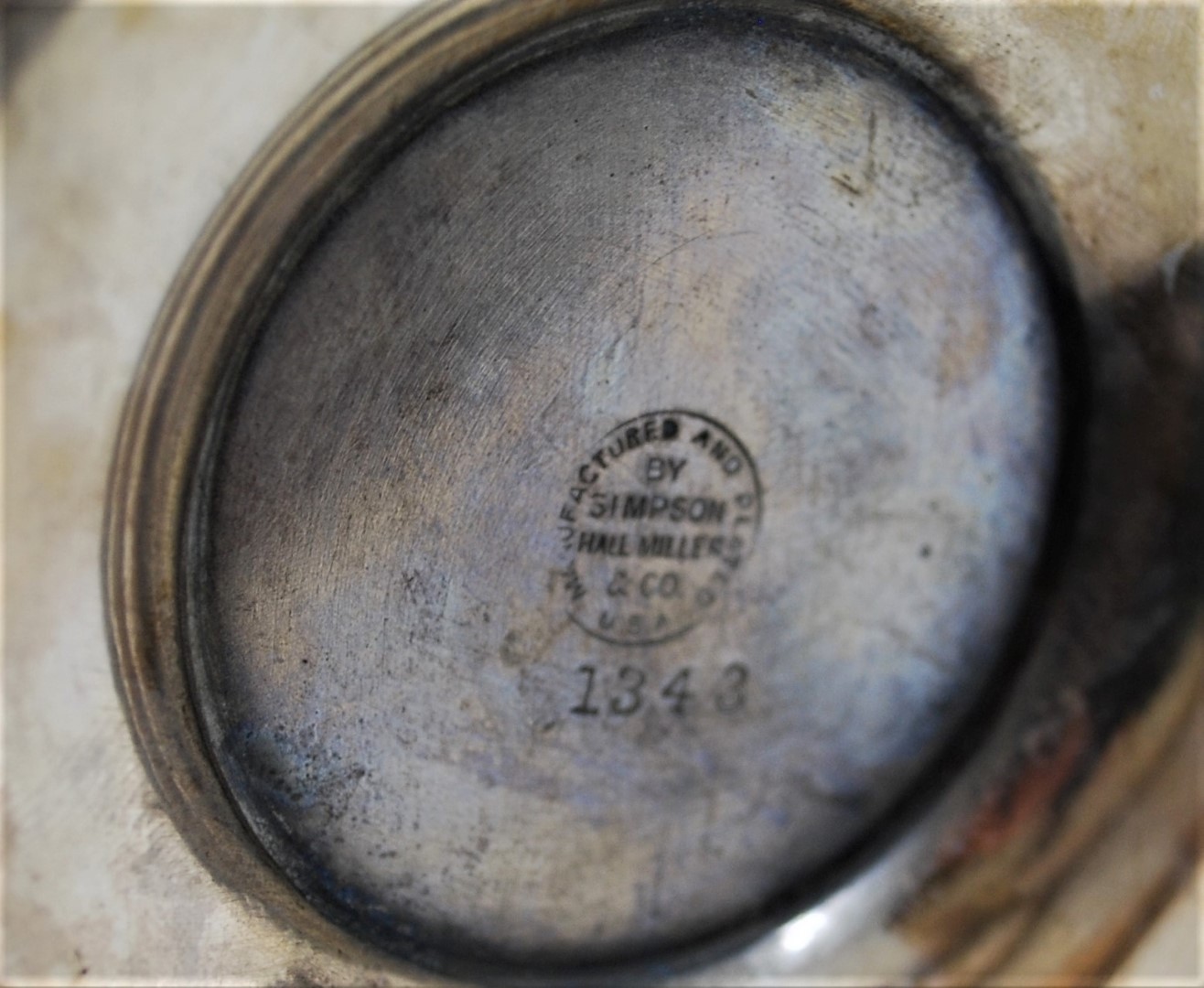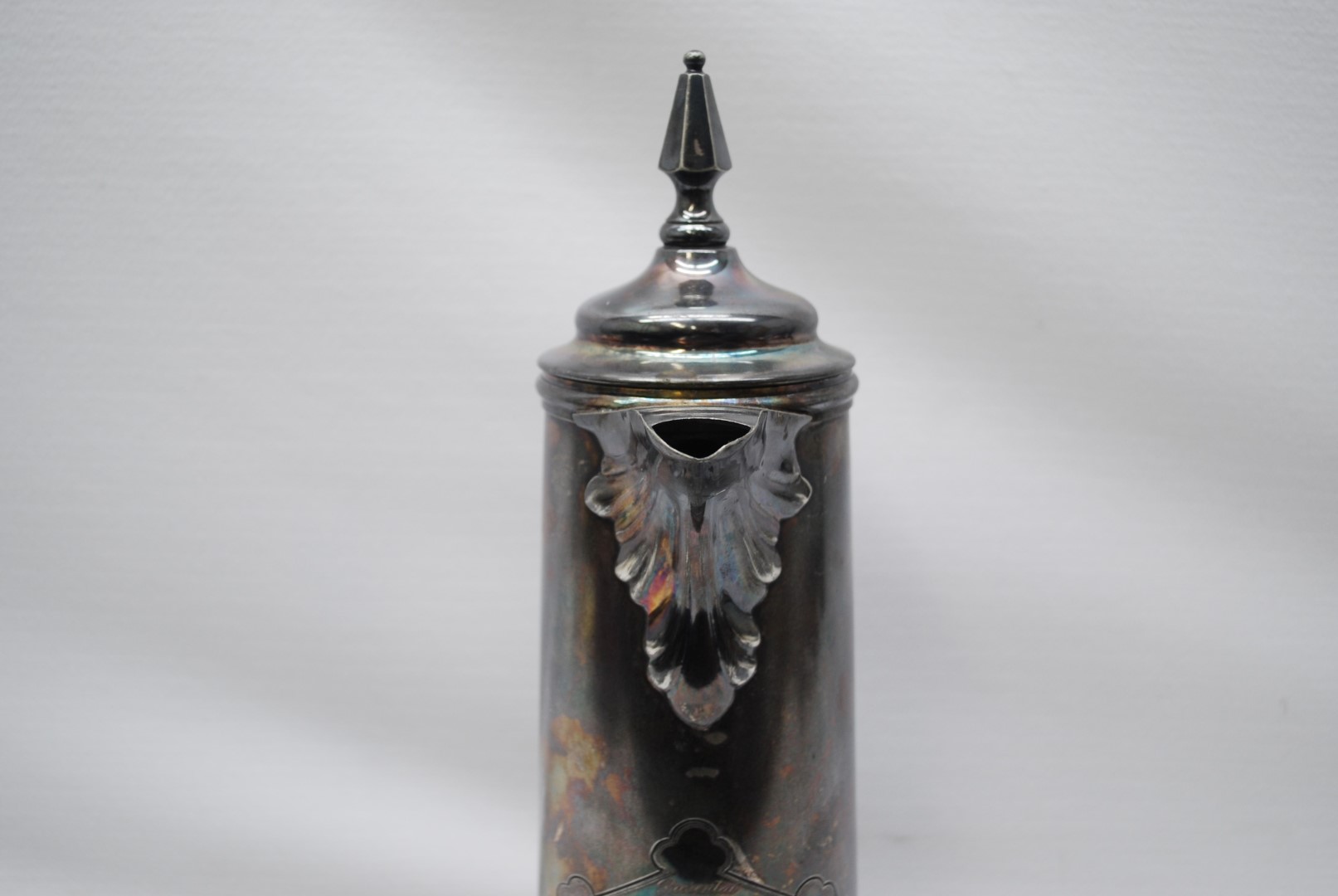 This is a used 14-1/2" Tall Plated Flagon Engraved in 1898. It has a Flip Top, is in good condition, and was Made by Simpson Hall Miller & Co.