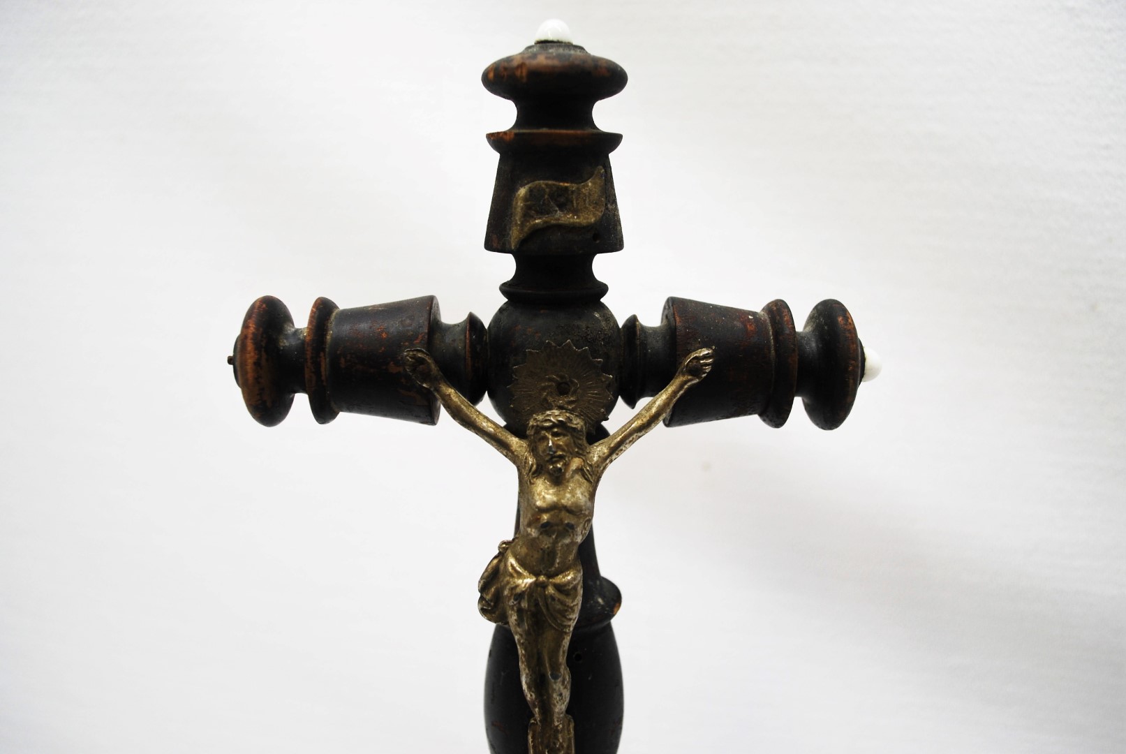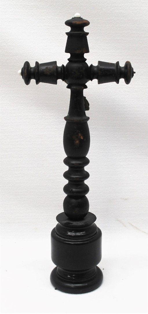 This is a previously used 13" Antique Wood Carved or spindled Altar Crucifix with Metal Corpus & Sunburst Halo/Crown of Thorns - There are 2 White Porcelain Pins attached to the two of three edges of the cross. This piece has a Round Base. This item has some wear and tear from time but is otherwise in ready to use condition, and would make a great addition to a good home.