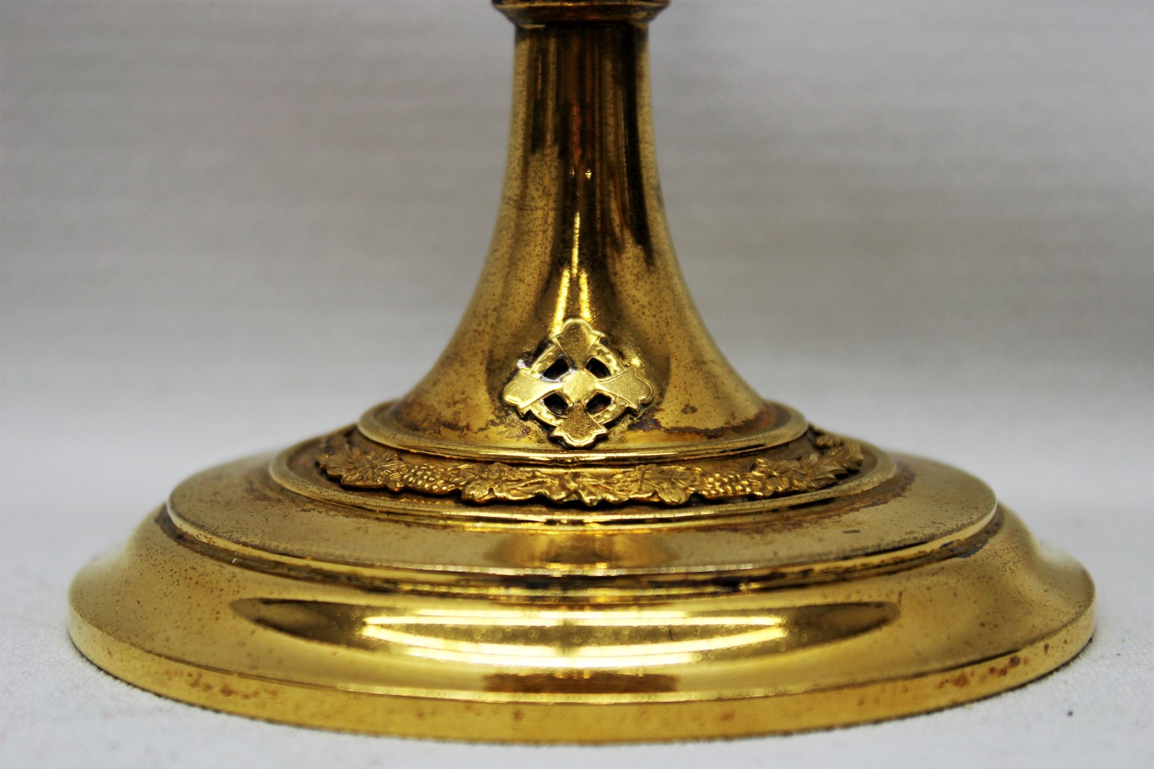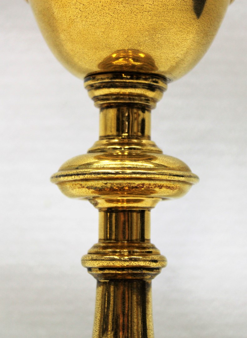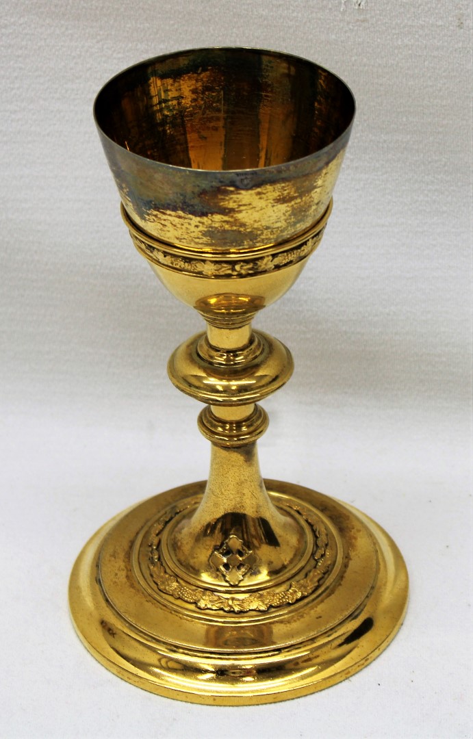 This is a previously used 8-1/4" Tall Sterling Cup Chalice originally Manufactured in the Late 1800s ("H" year marking on the stem when disassembled) - This historic chalice features a beautiful Matching Wheat and Grape Motif Banding on the Calyx and Rounded Base. This piece is in excellent shape for its age, and in fair condition overall with cosmetic flaws from general wear and tear. It is out for sale now, and ready for a new home.