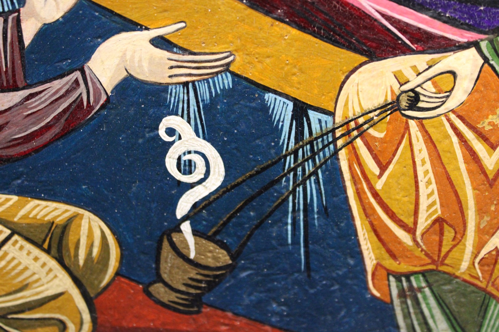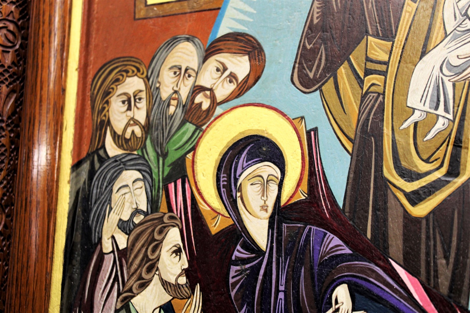 This is a previously owned 71" x 39" Original Painting of Icon which lay perfectly within a Large, ornate, Hand Carved Wooden Frame. The painting is Signed and Dated back to 1925. This piece is in good condition with very minor flaws.