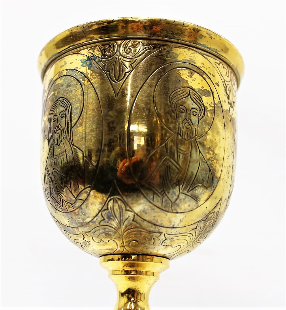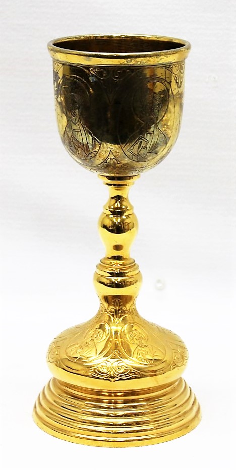 This is a previously used 10" tall Brass Orthodox Chalice with Gold Plating. It is in good condition and ready for a new home.