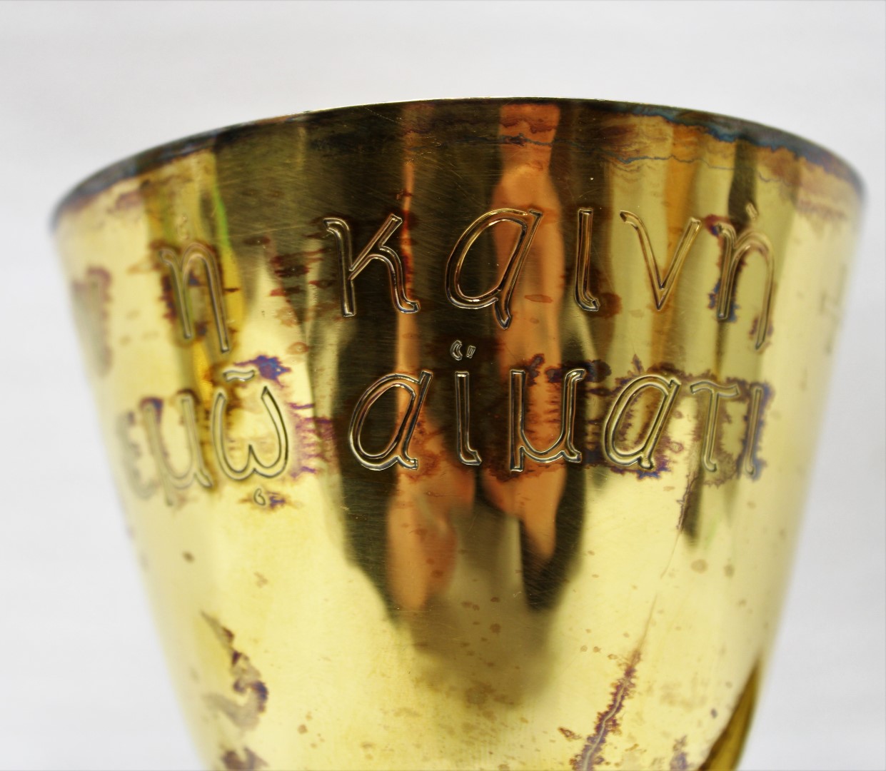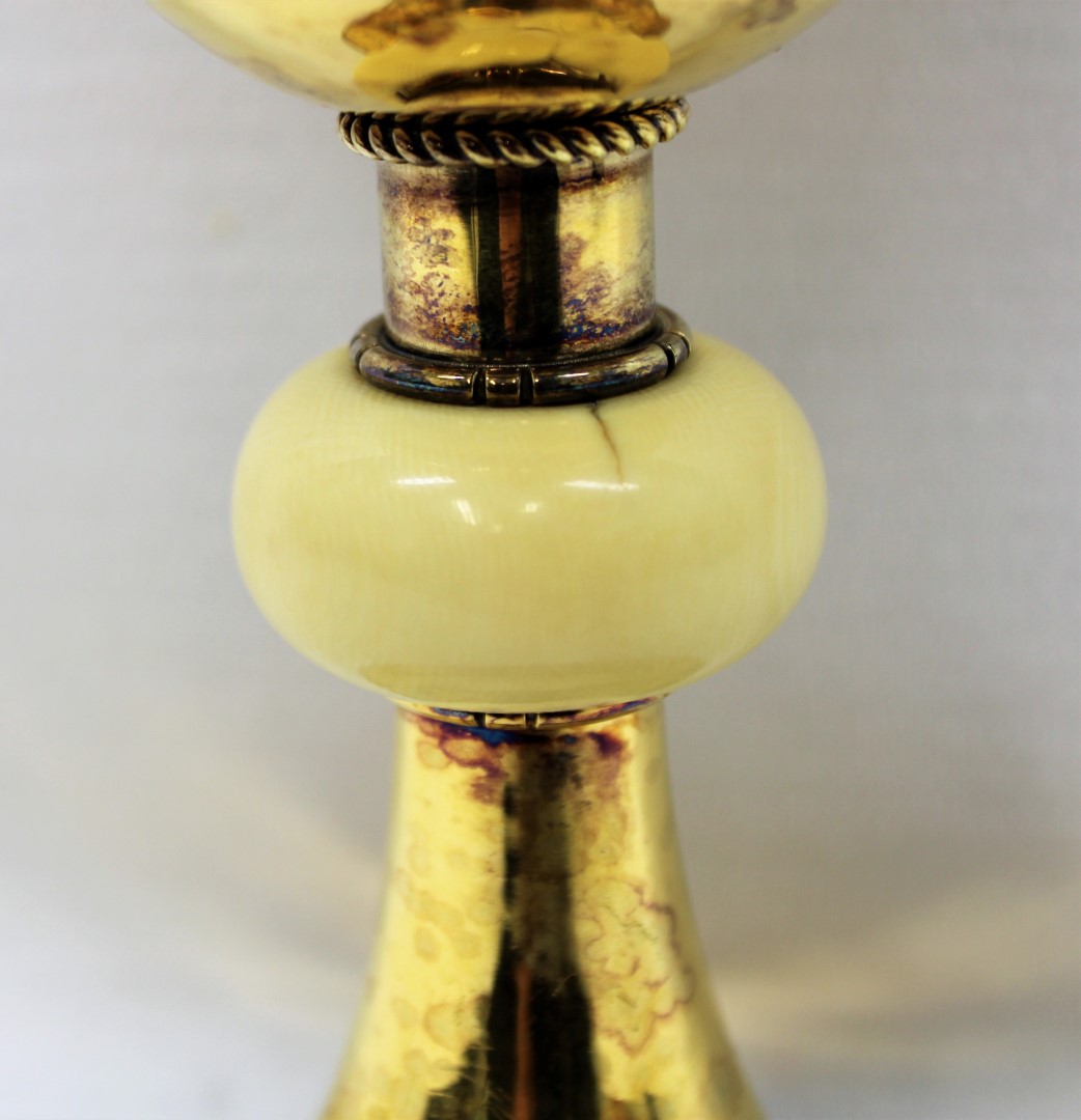 This is a previously used 8" tall Solid Sterling silver Chalice with a gorgeous Ivory Node. On the cup is engraved Hebrew Text, and the chalice features a delicate Cross on it's base. The chalice comes along with a matching 5-3/4" diameter Scale Paten with a Ring base.