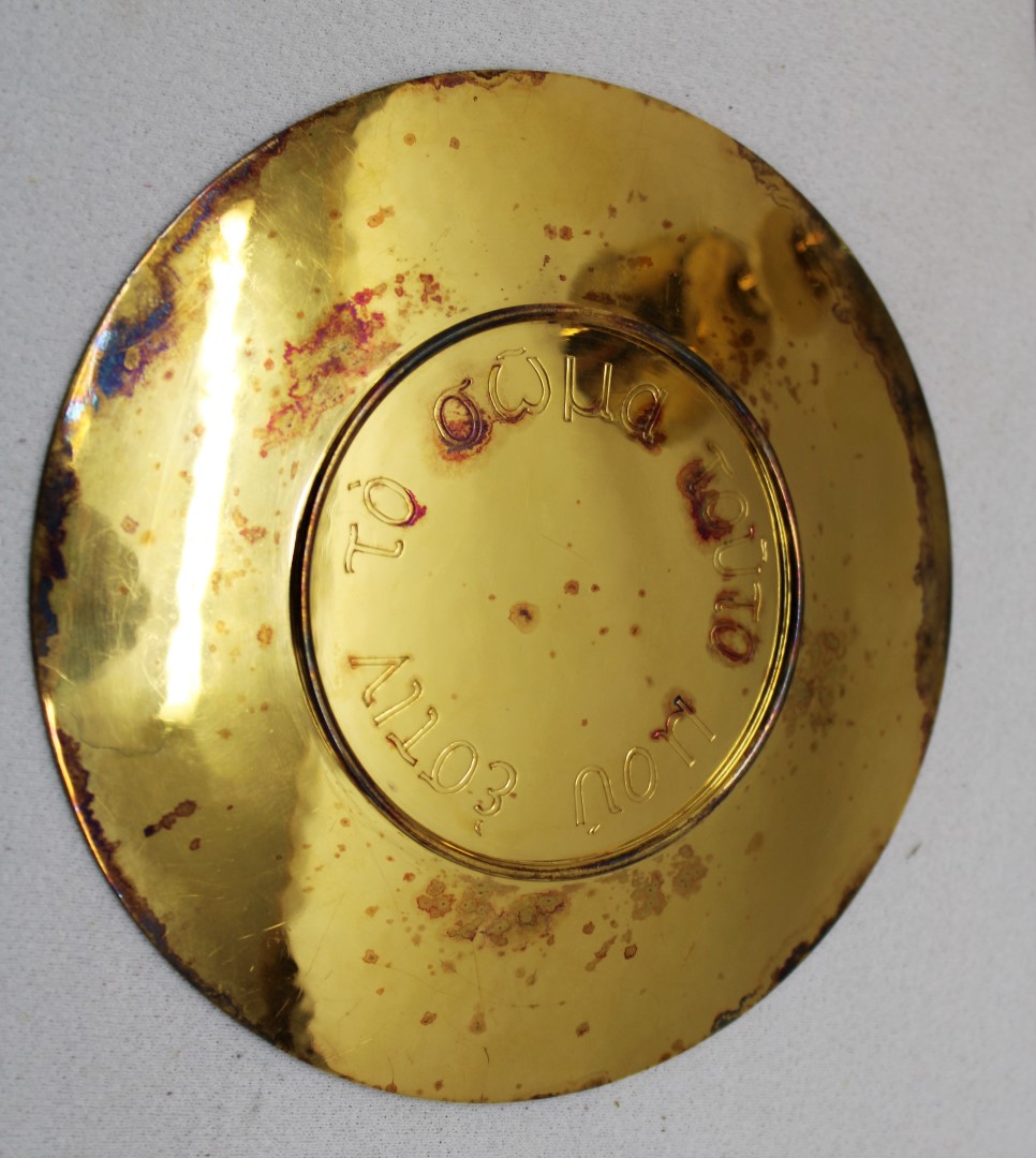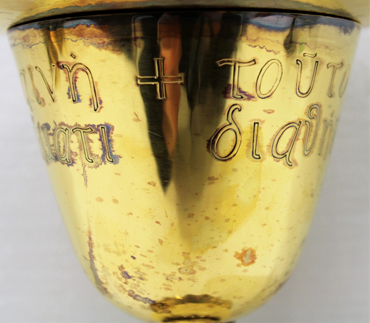 8" Solid Sterling Chalice w/ Ivory Node - Hebrew Text & Cross on base - 5-3/4" Scale Paten w/ Ring