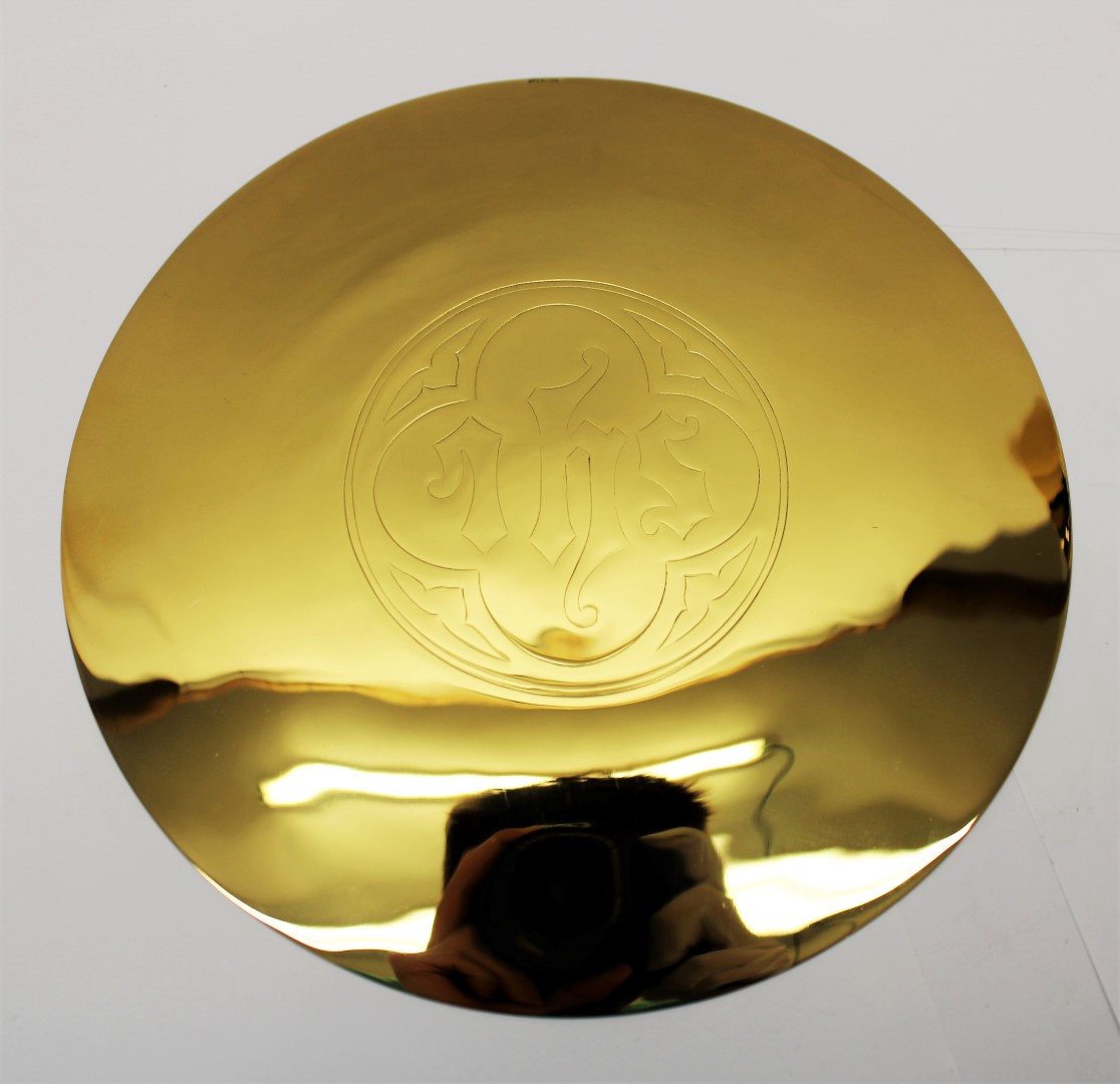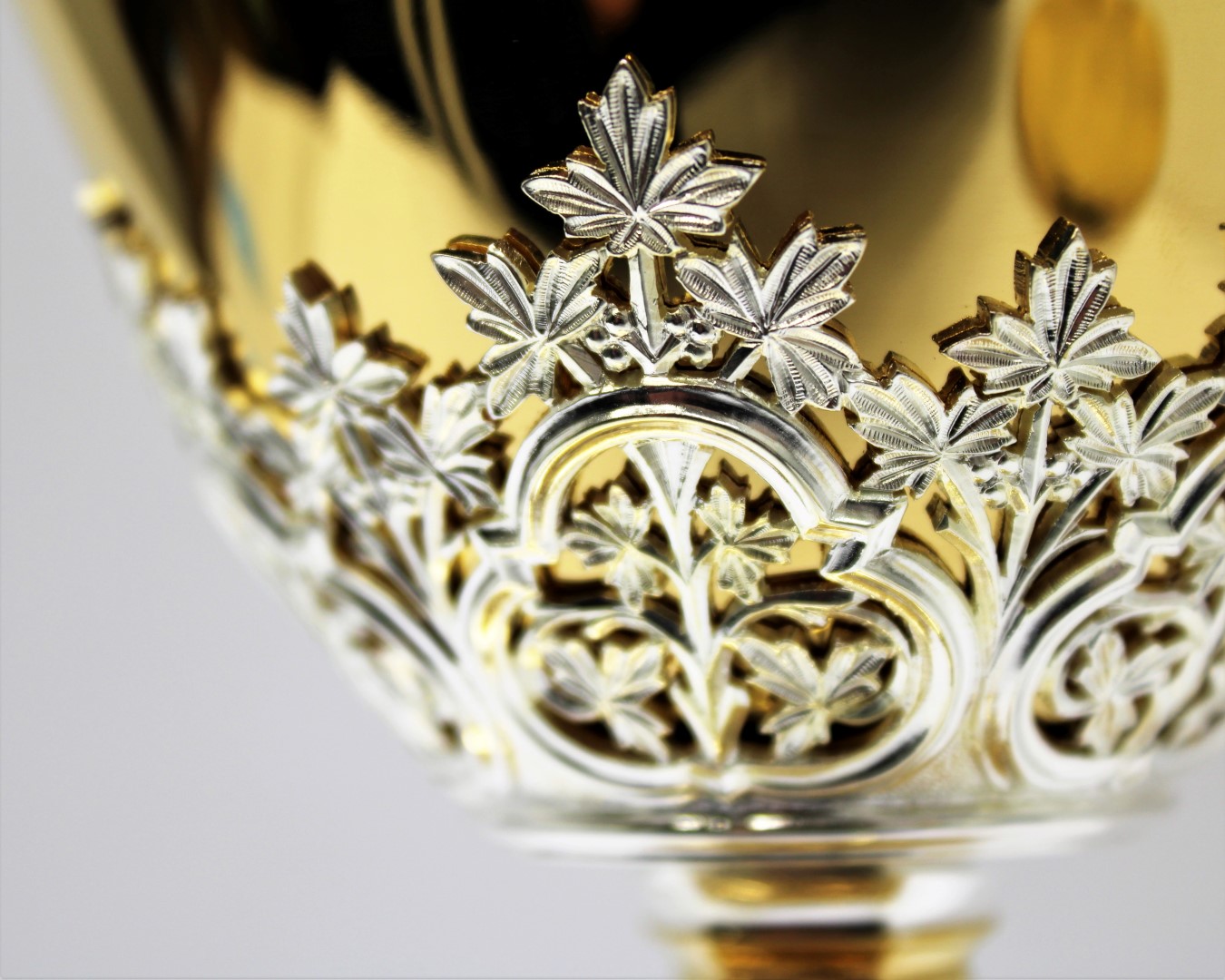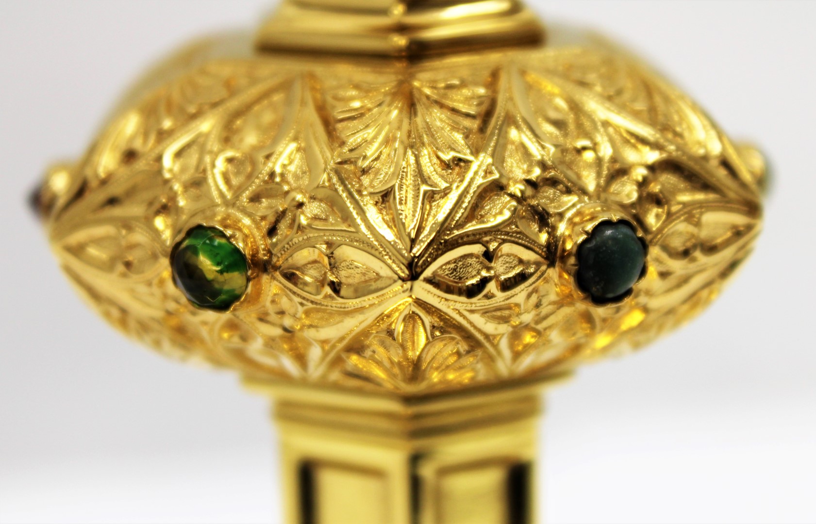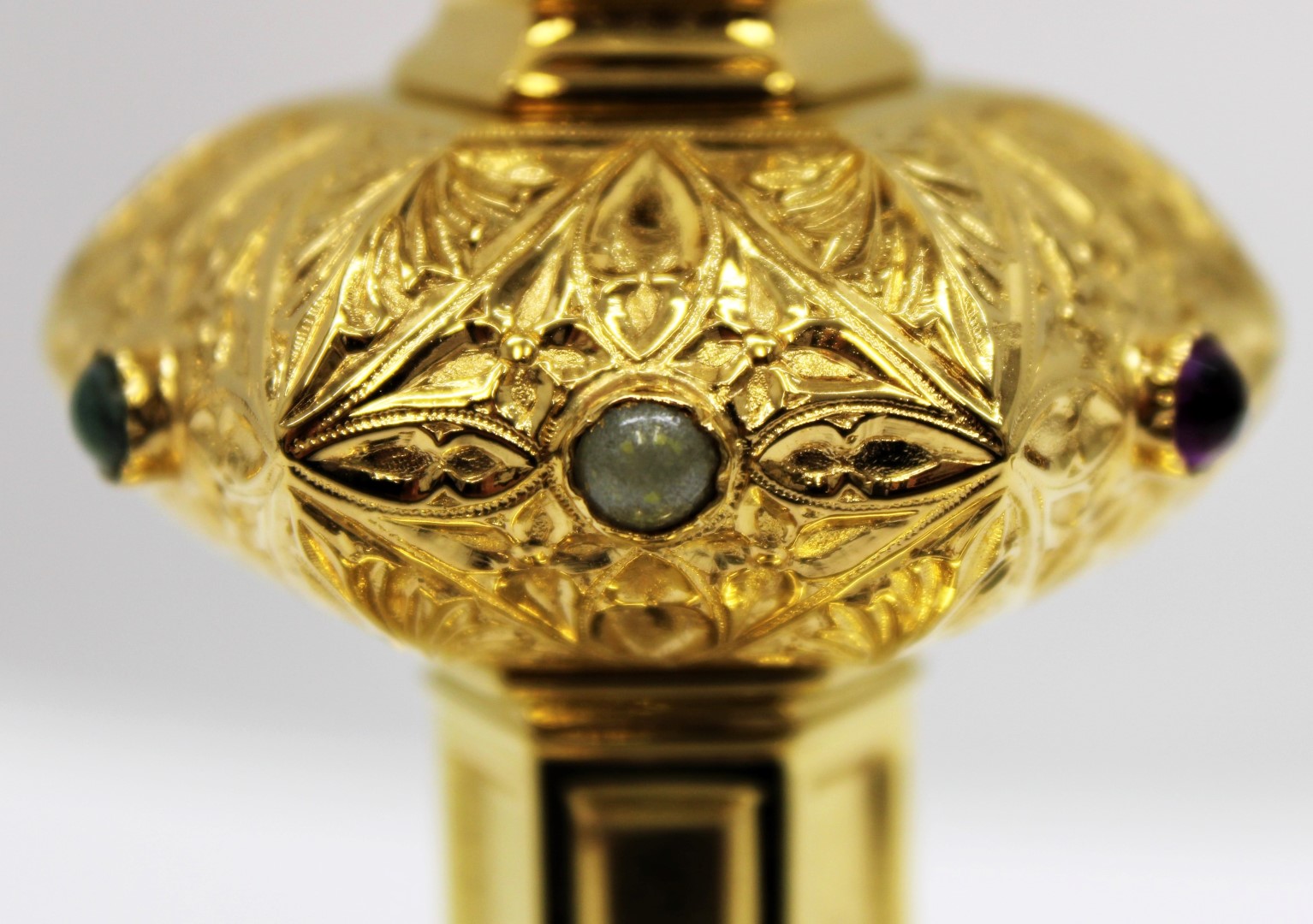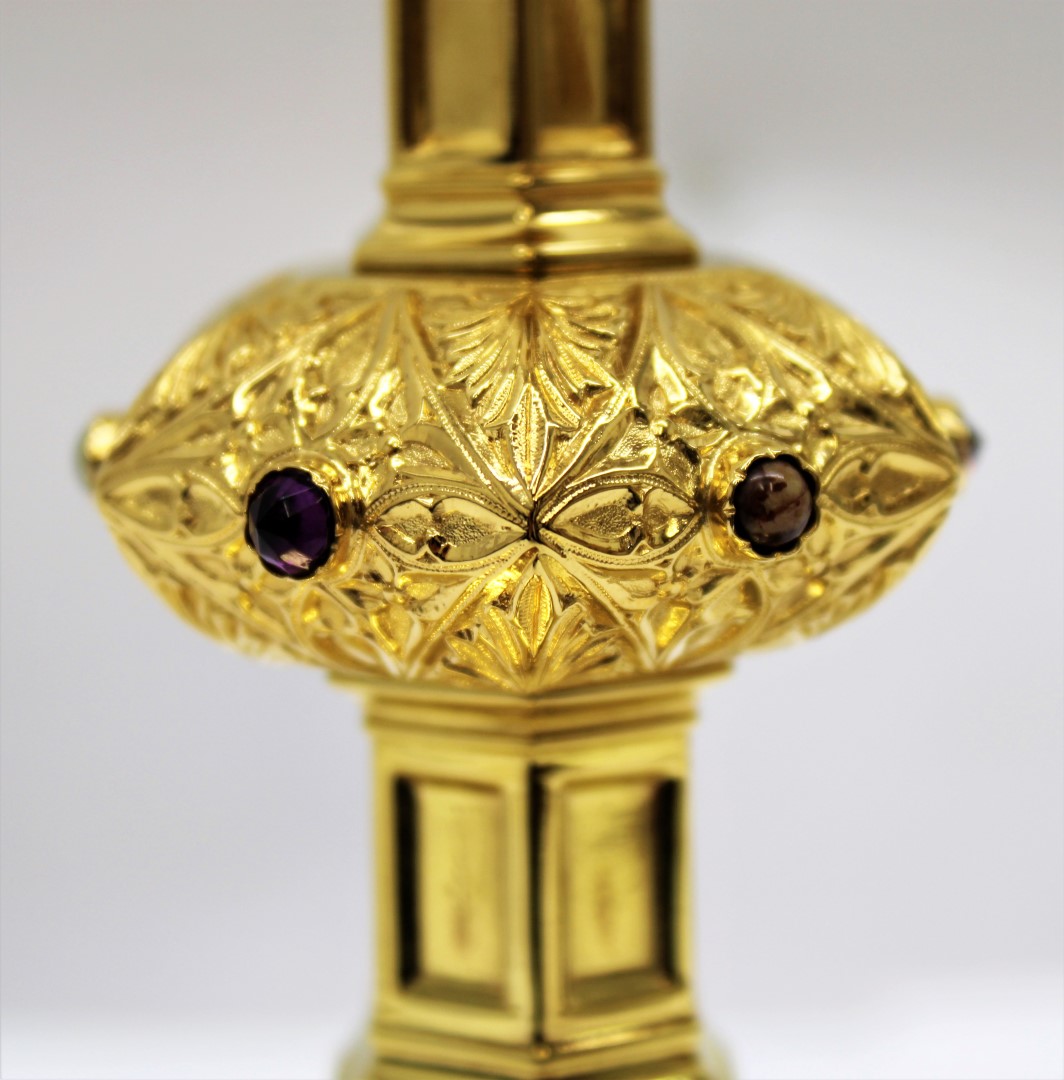 This is a restored German 800/1000 Sterling Chalice dated back to the 1800s. It has a 6 Pointed Base featuring a silver plated Crucifixion Scene. This chalice features a beautiful six pointed node which showcases 6 precious stones. The calyx is a hand chased silver plated detail that strikes the eye. This Chalice also comes with a 5-1/2" Sterling paten with an IHS engraving on the back.