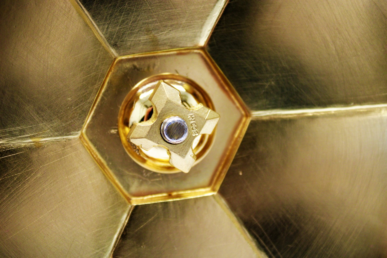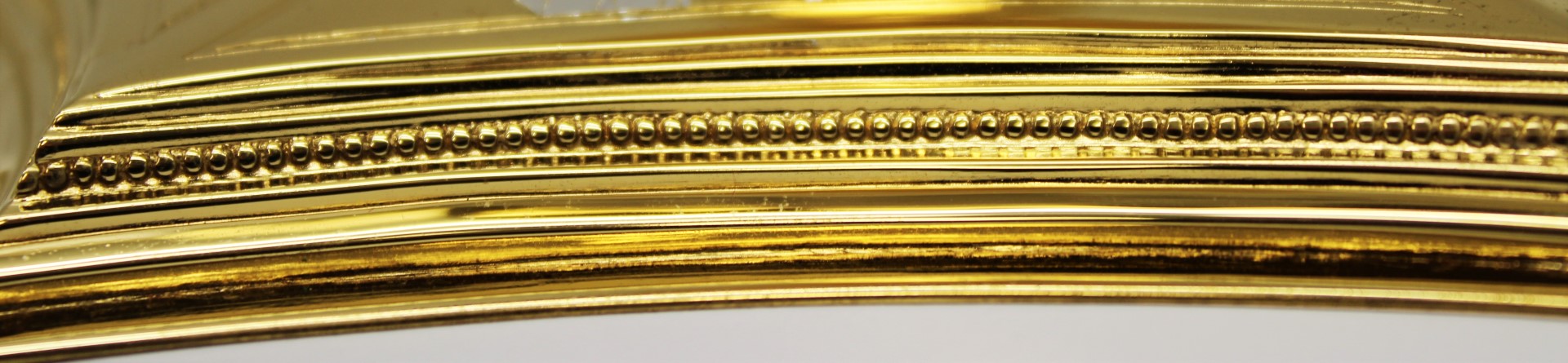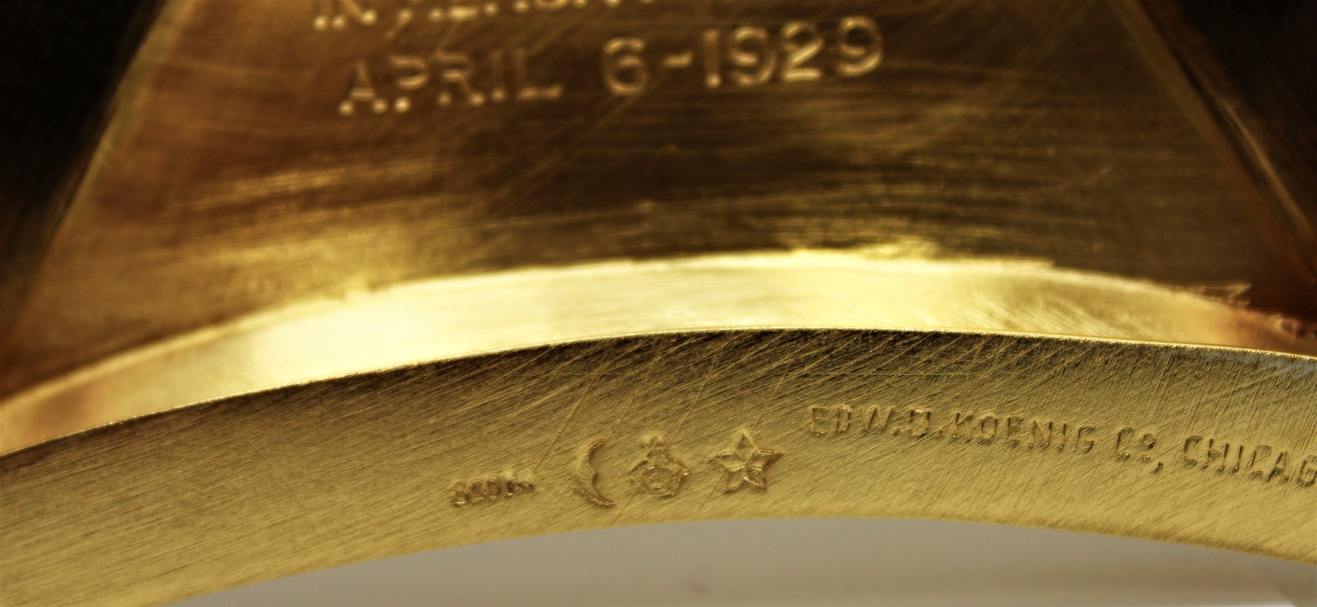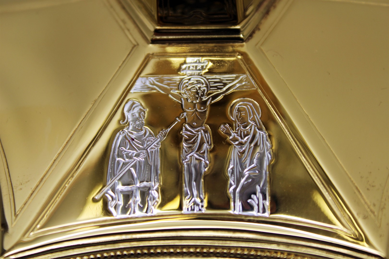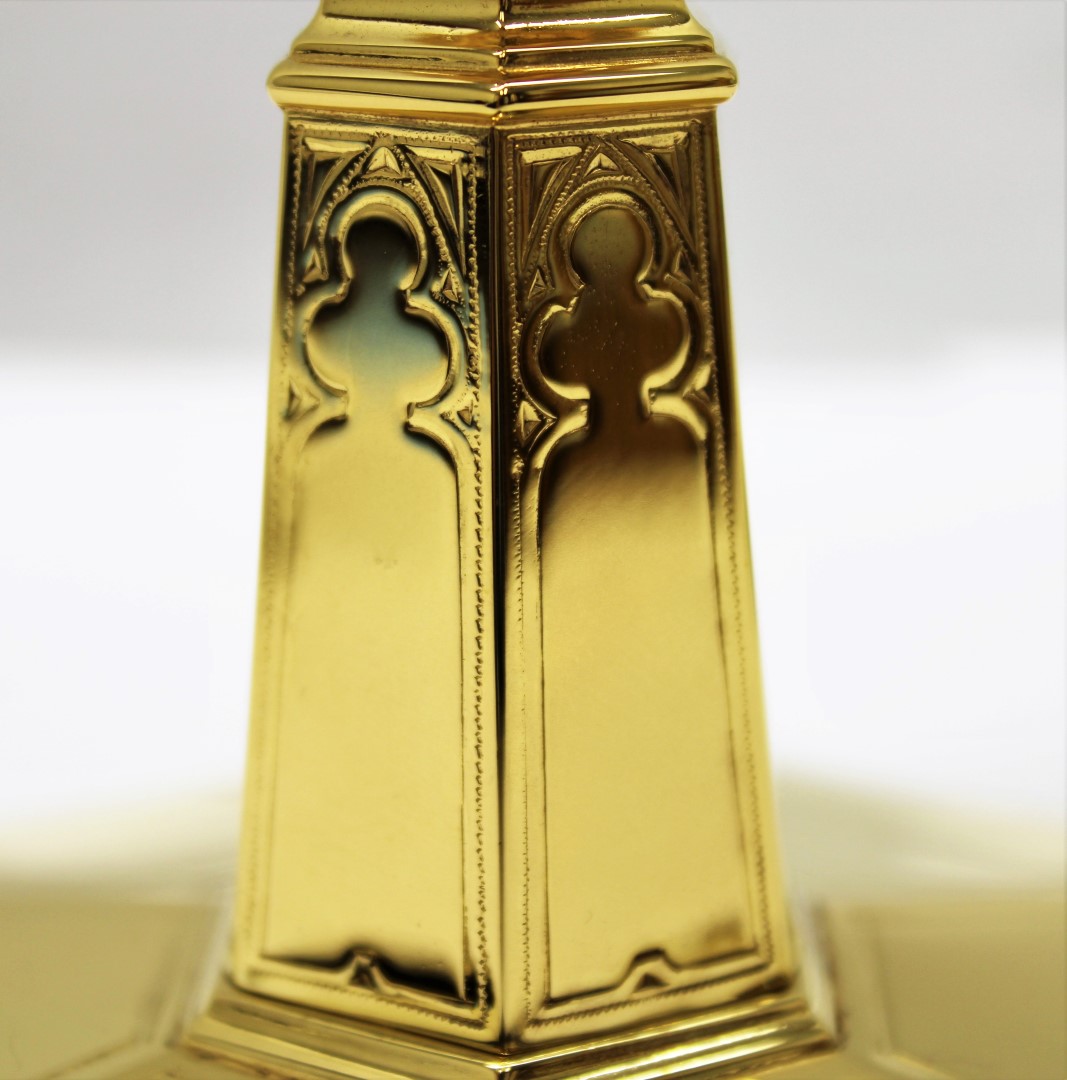 This is a restored German 800/1000 Sterling Chalice dated back to the 1800s. It has a 6 Pointed Base featuring a silver plated Crucifixion Scene. This chalice features a beautiful six pointed node which showcases 6 precious stones. The calyx is a hand chased silver plated detail that strikes the eye. This Chalice also comes with a 5-1/2" Sterling paten with an IHS engraving on the back.