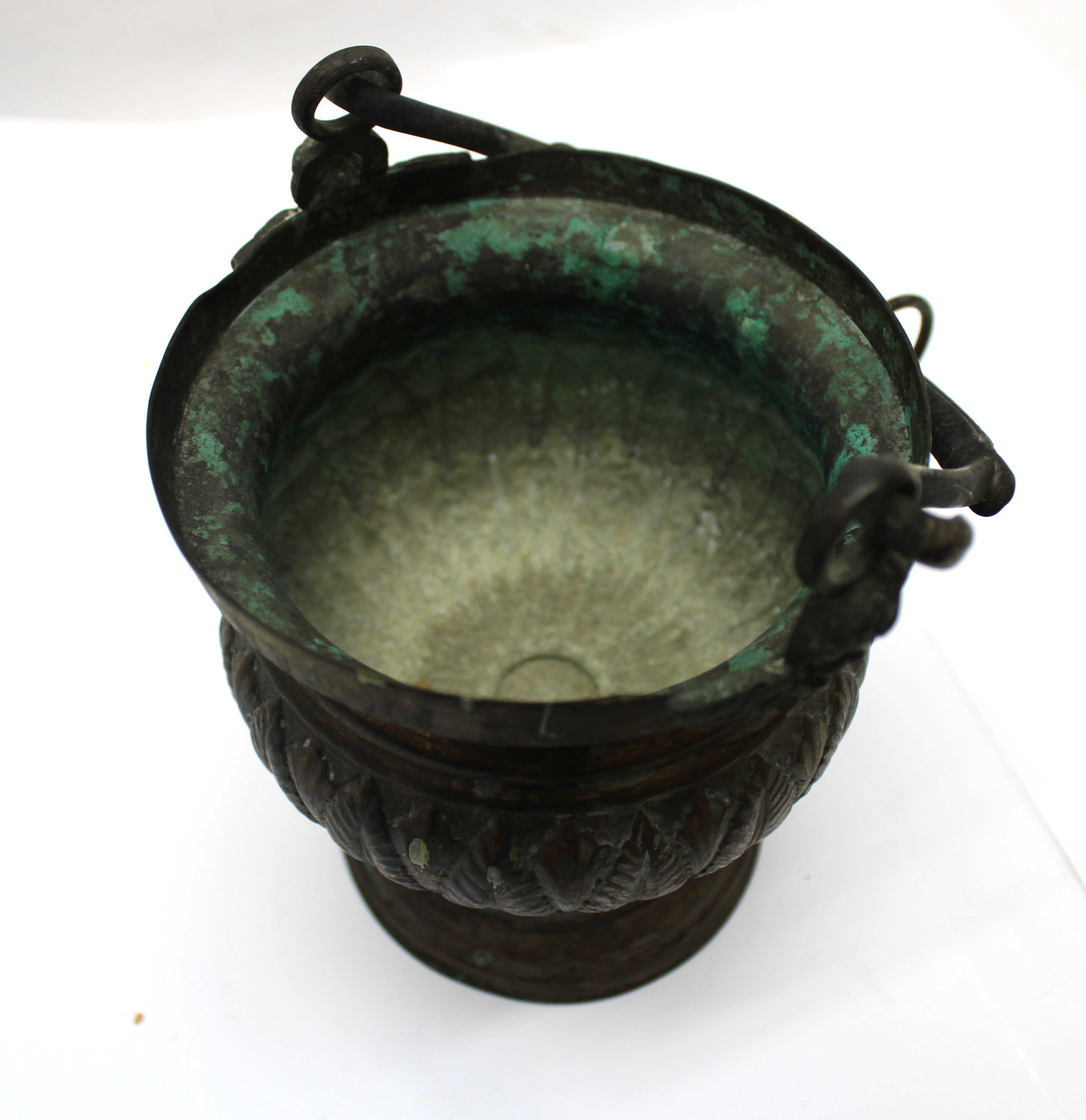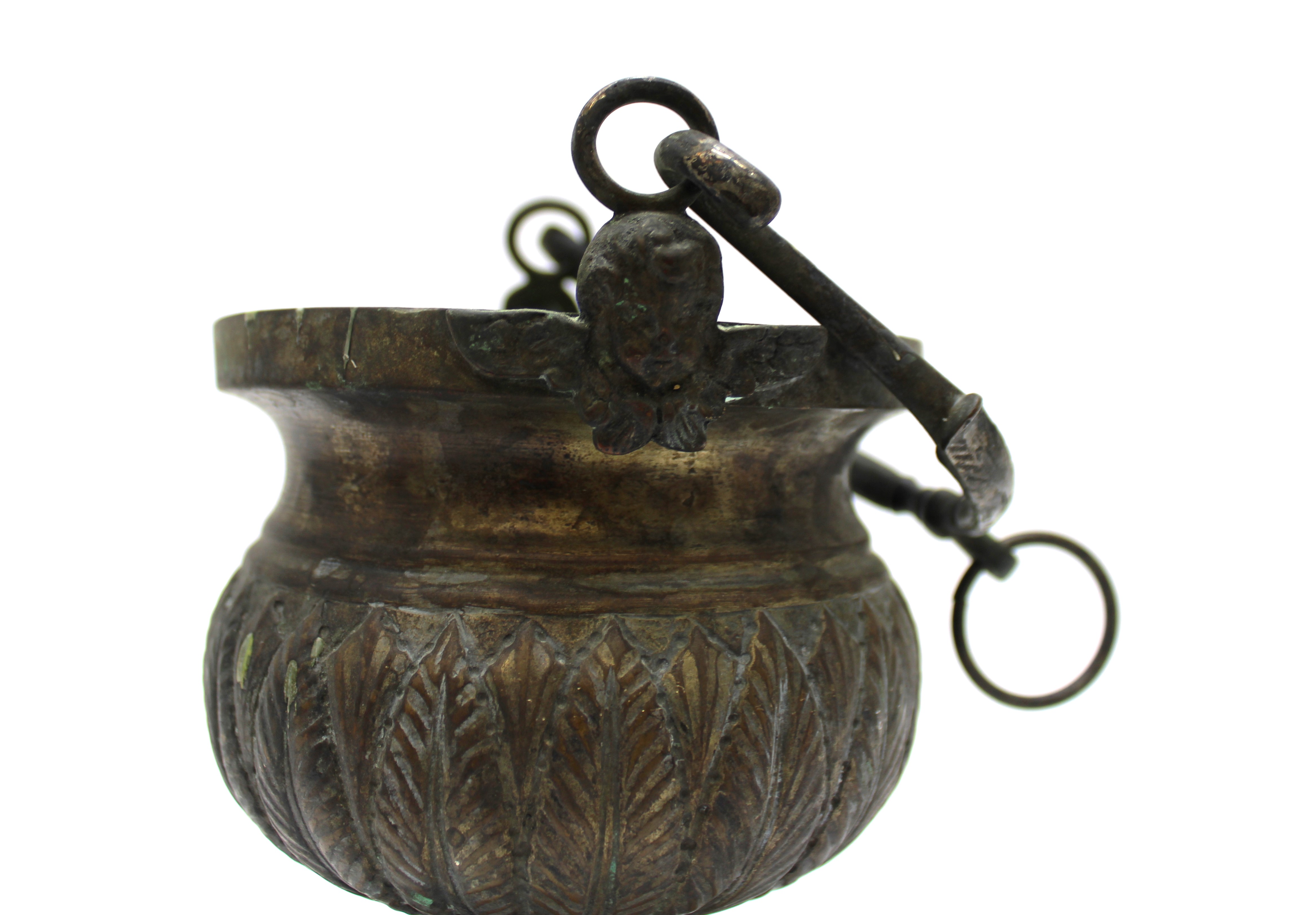 This is a previously used bronze Holy Water pot with cherub where the handle meets. This does not have a liner, but one could be purchased.