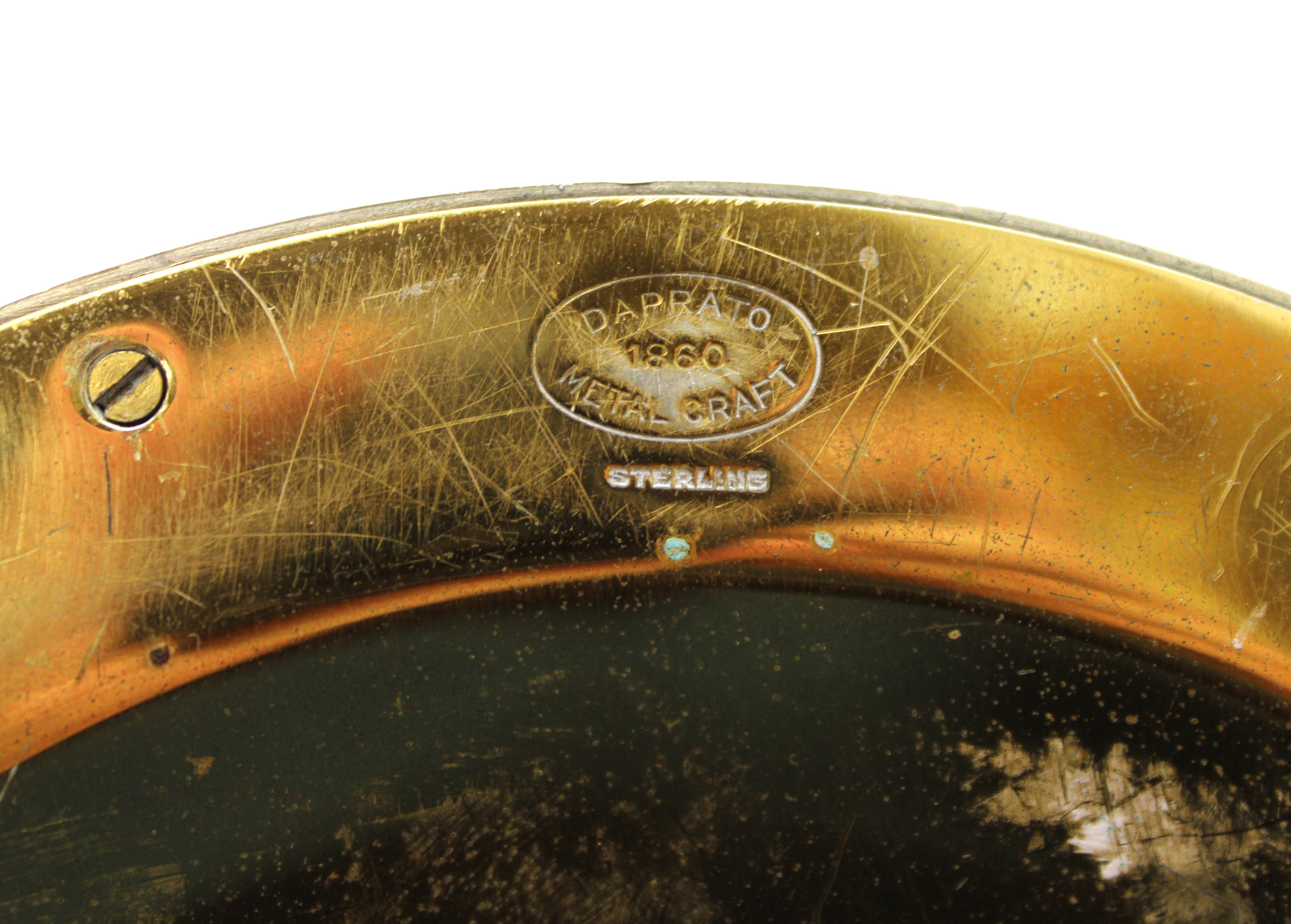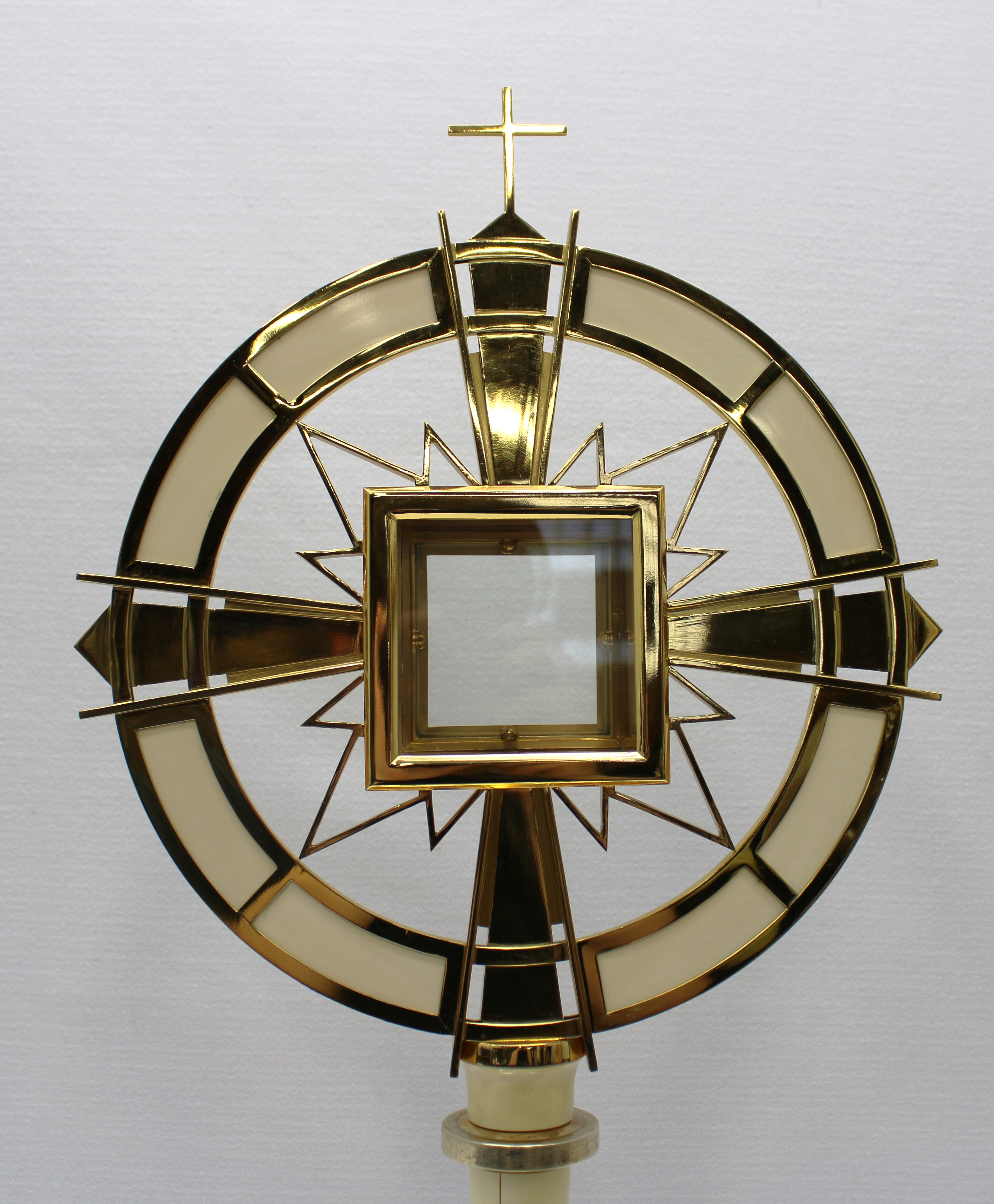 This is a previously used sterling monstrance that stands 23.5" tall. It is fully functional and is made by Daprato. This would be a great candidate for restoration. The piece is a touch wobbly and the center white is cracked.