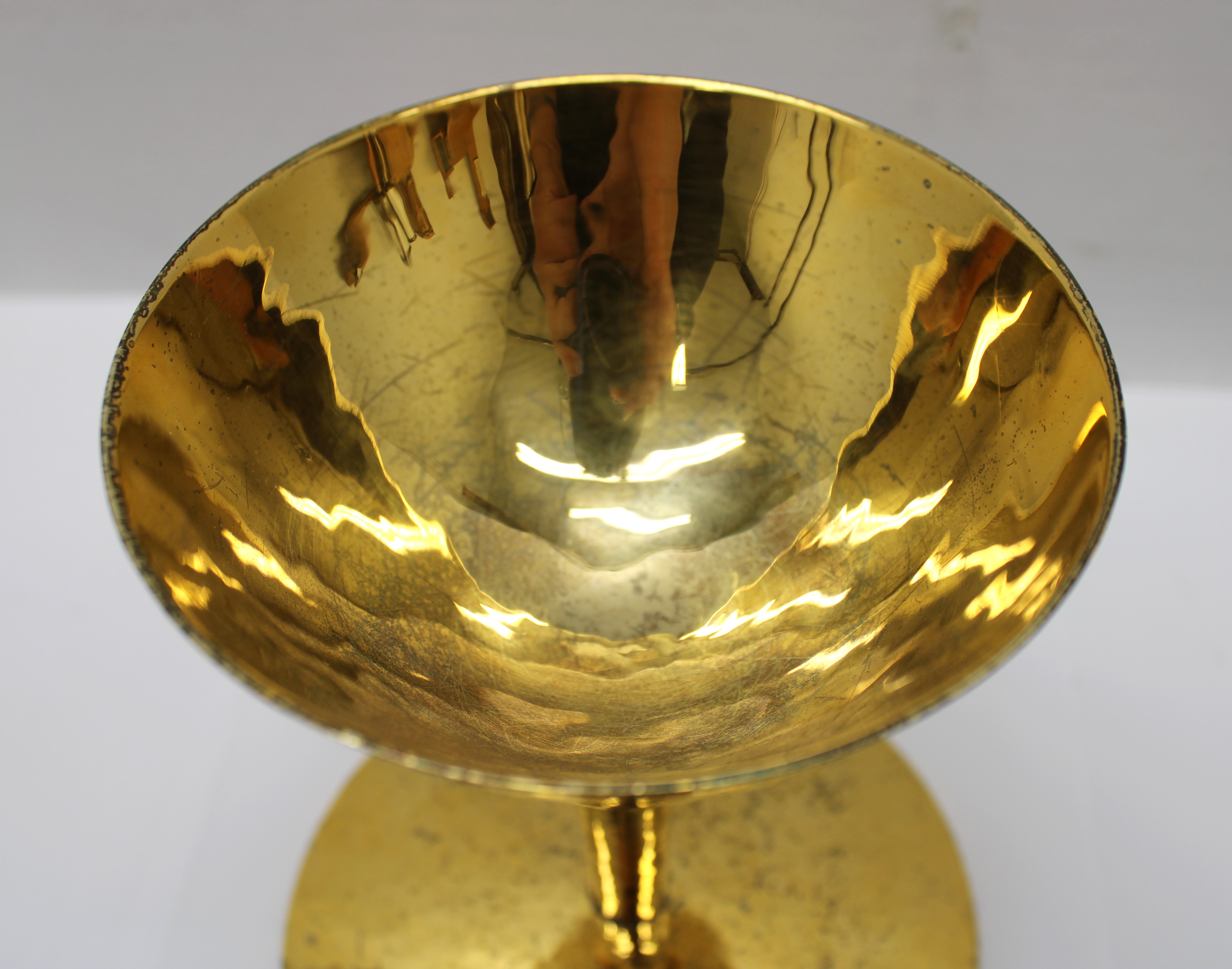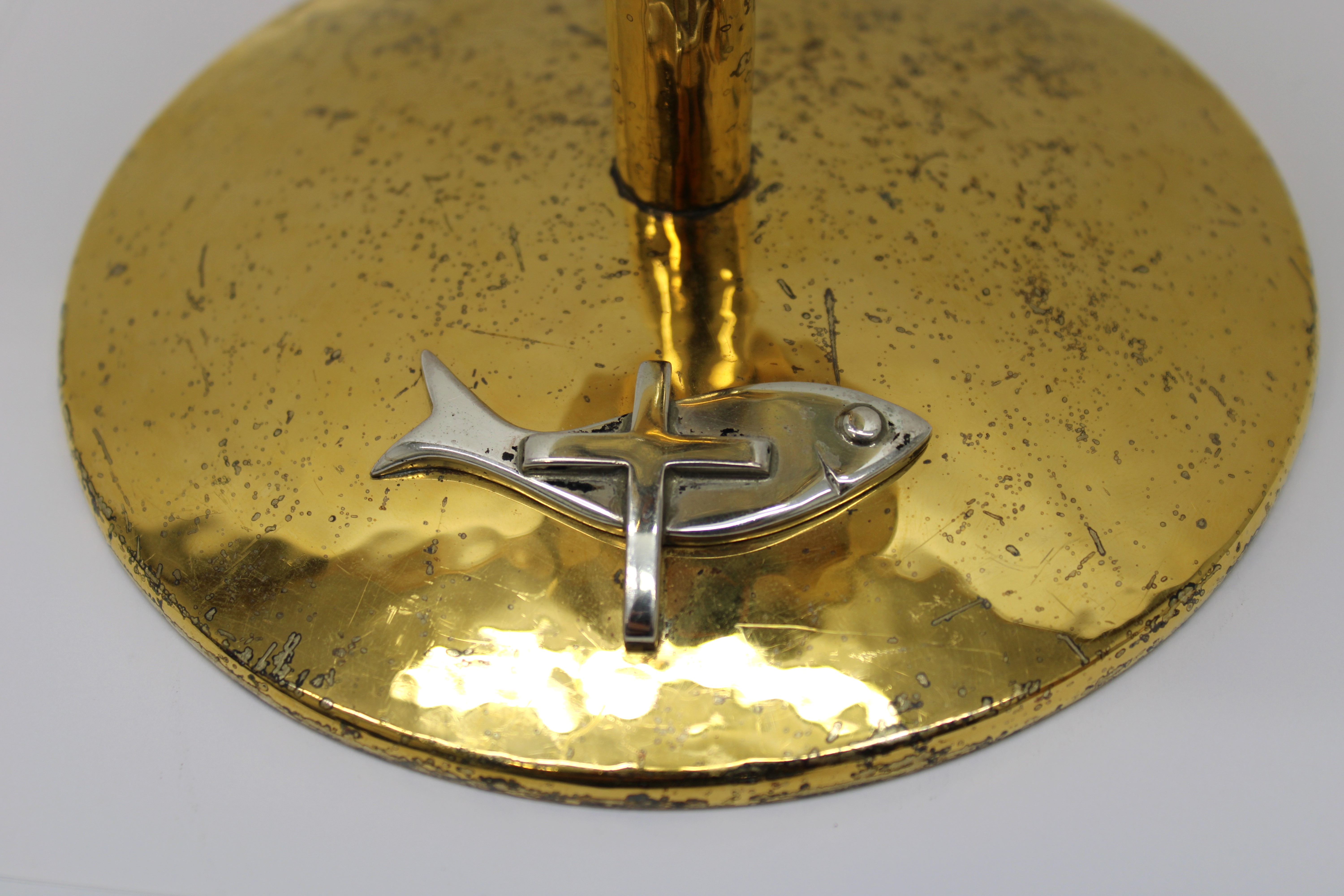This is a previously used Chalice. It is 7" tall and is made out of brass with fish and a cross on the base.