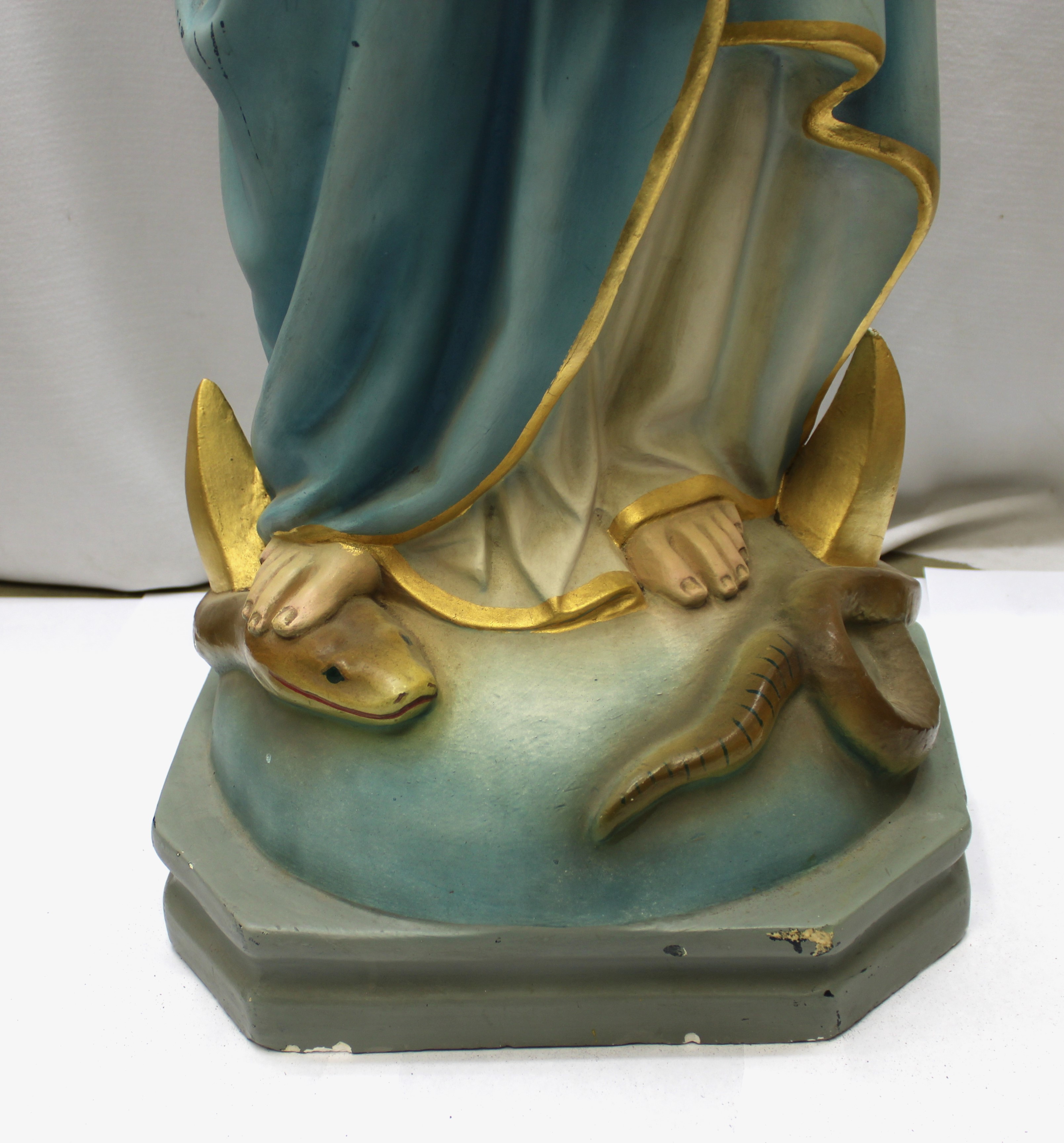 This is a previously owned Immaculate Conception statue. It stands 48" tall and is made out of plaster. The piece is in good condition.