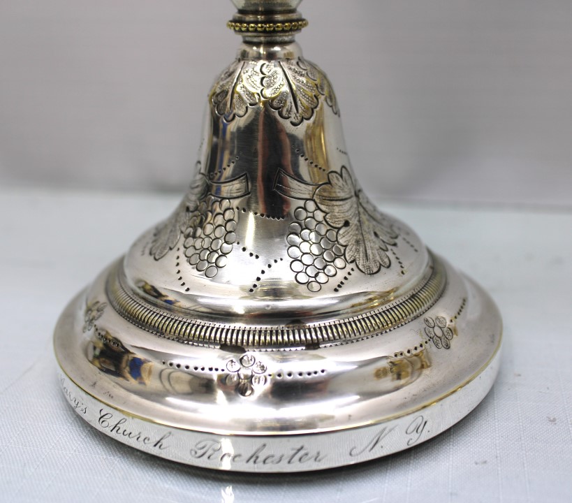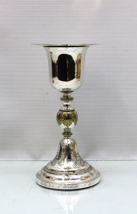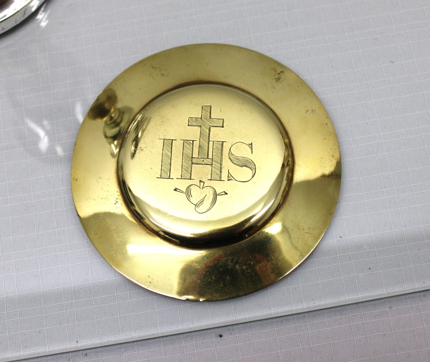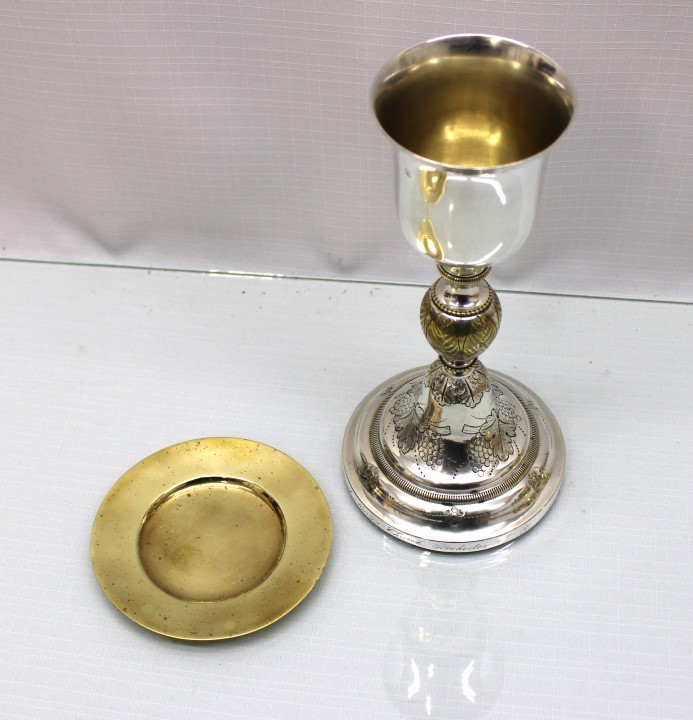 ***Polished 06/18/2025*** This is a previously used chalice with a French Sterling Silver tulip-style cup. It is 8 3/4" tall and has ornate, hand engraved design on the shaft and base. This item has a brass paten that measures 4 1/4". These pieces do come with a case.
