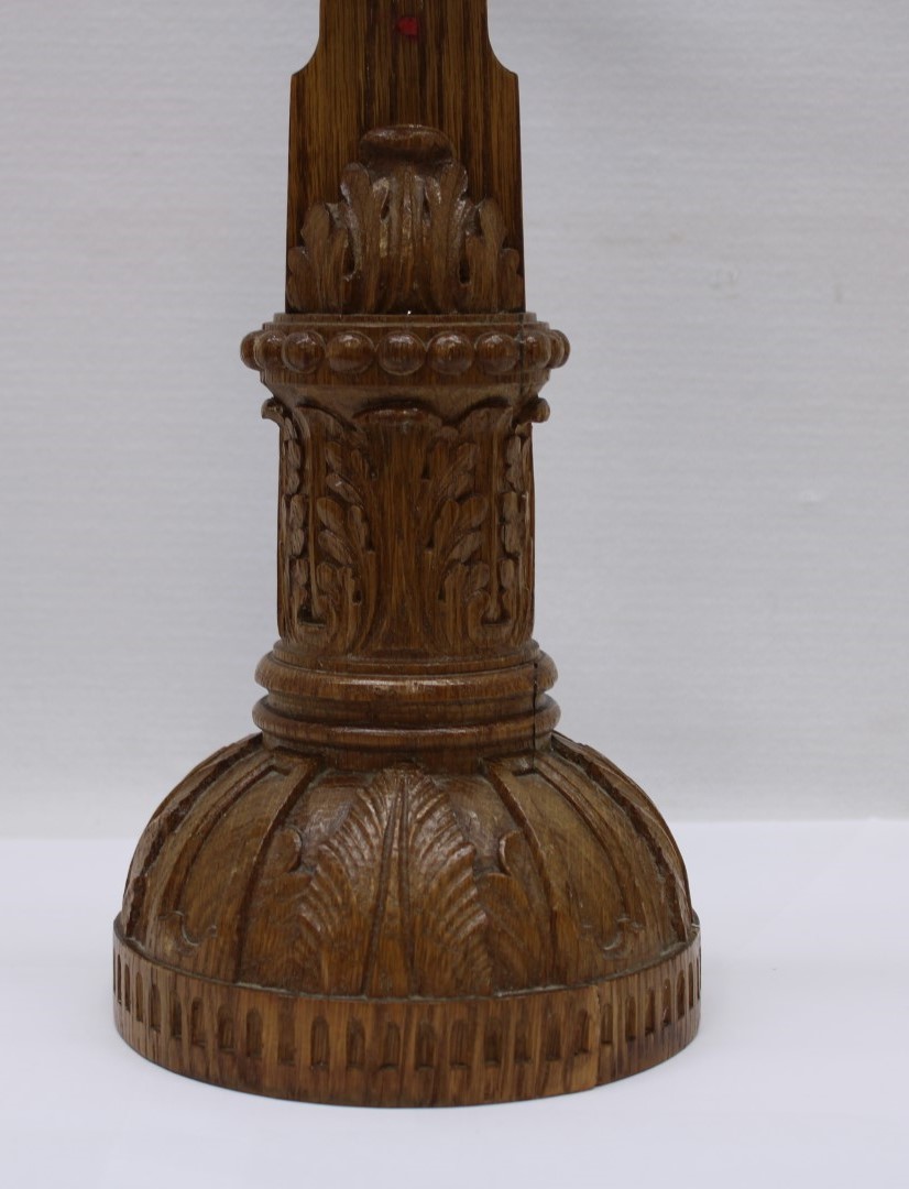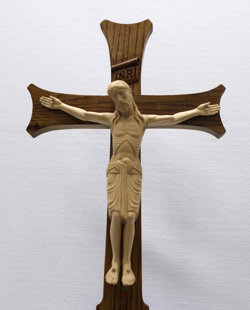 This is a previously owned wood carved altar crucifix. It measures 22" tall.