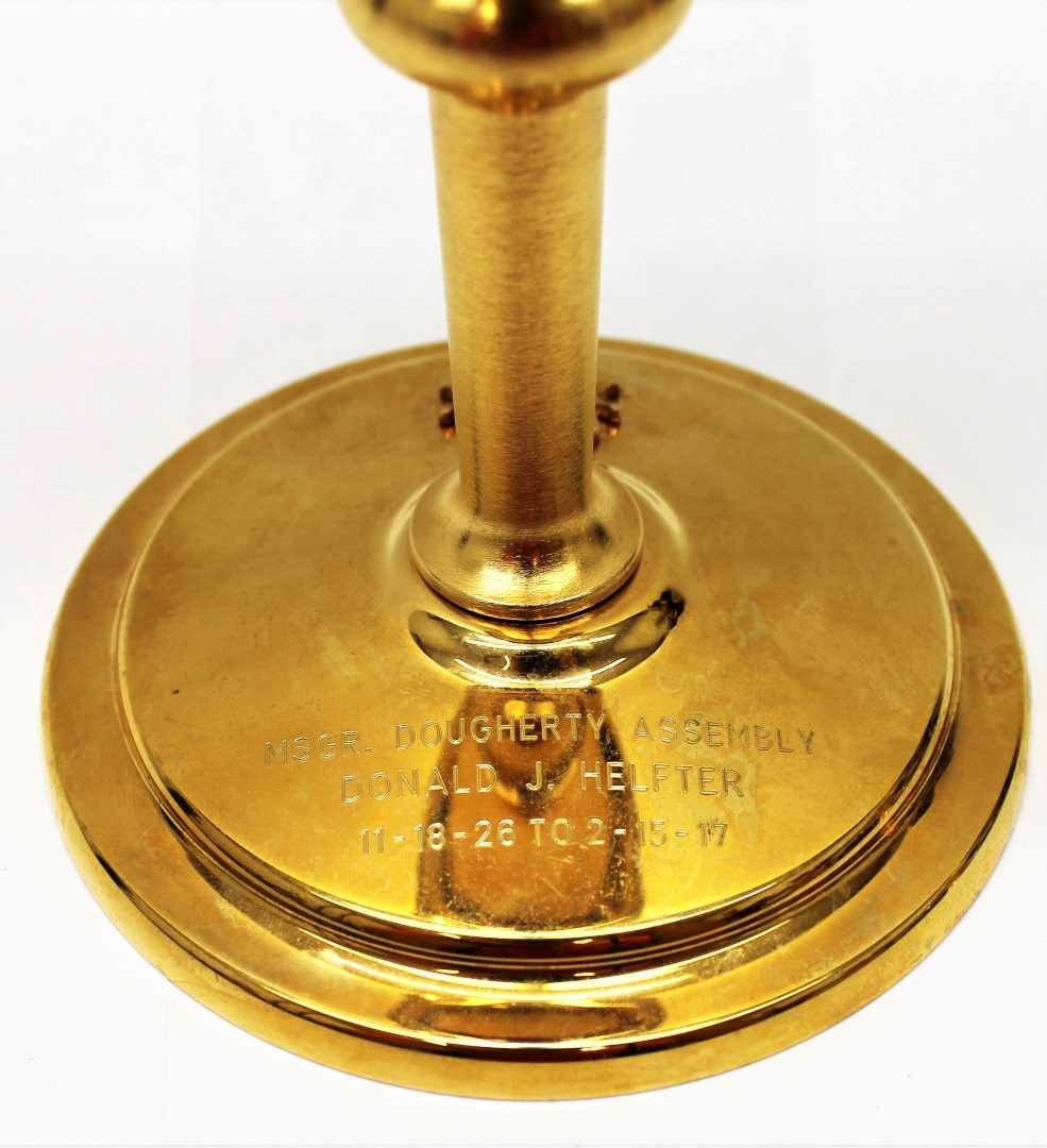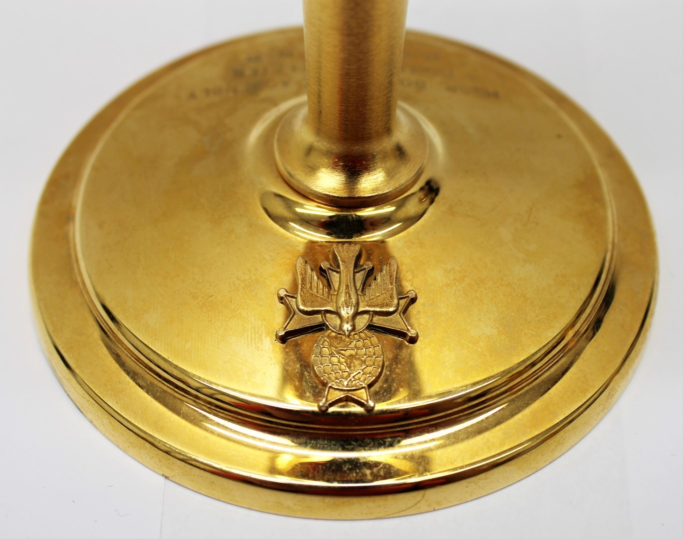 This is a previously owned brass chalice that is 8 1/4" tall, with a holy spirit medal on the base and prior memorial engraving. This item is in good condition.