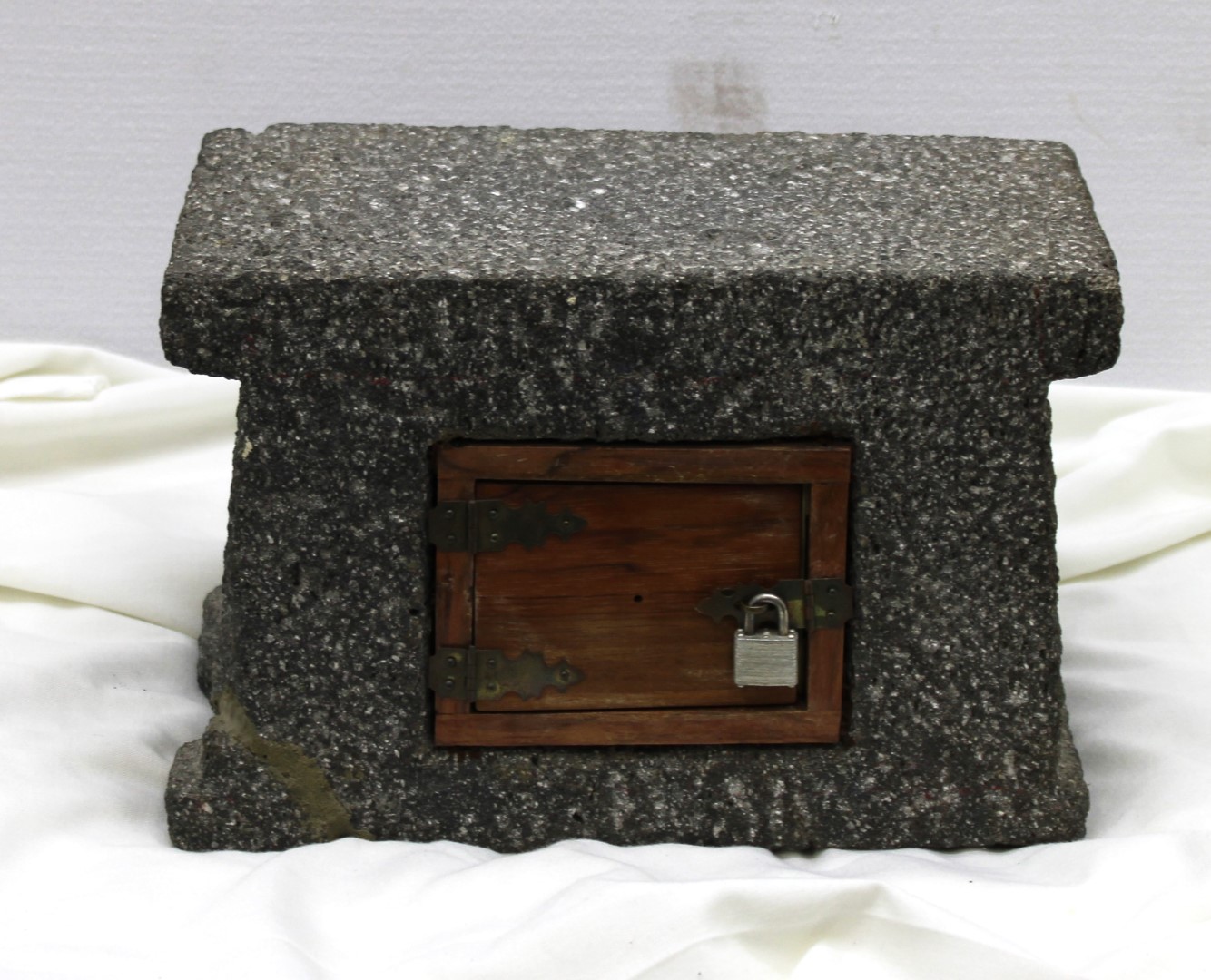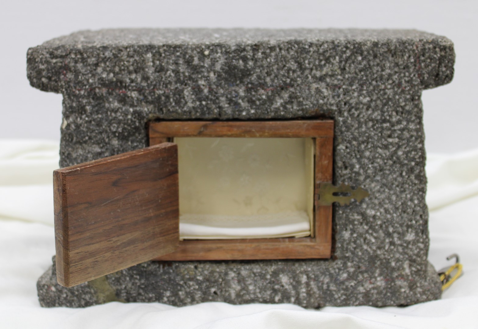 This is a previously owned chapel sized tabernacle made of stone. This piece is in fair condition and lined on the interior.