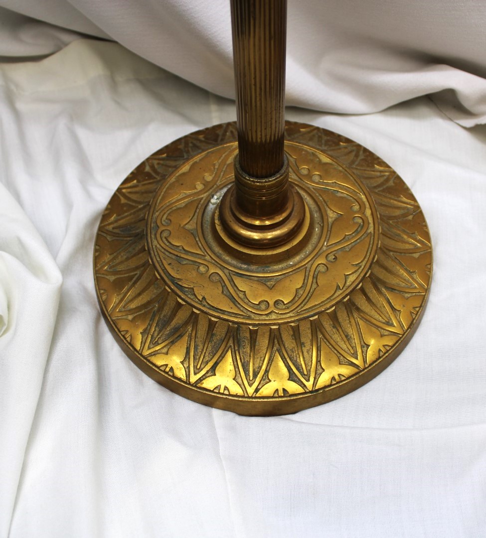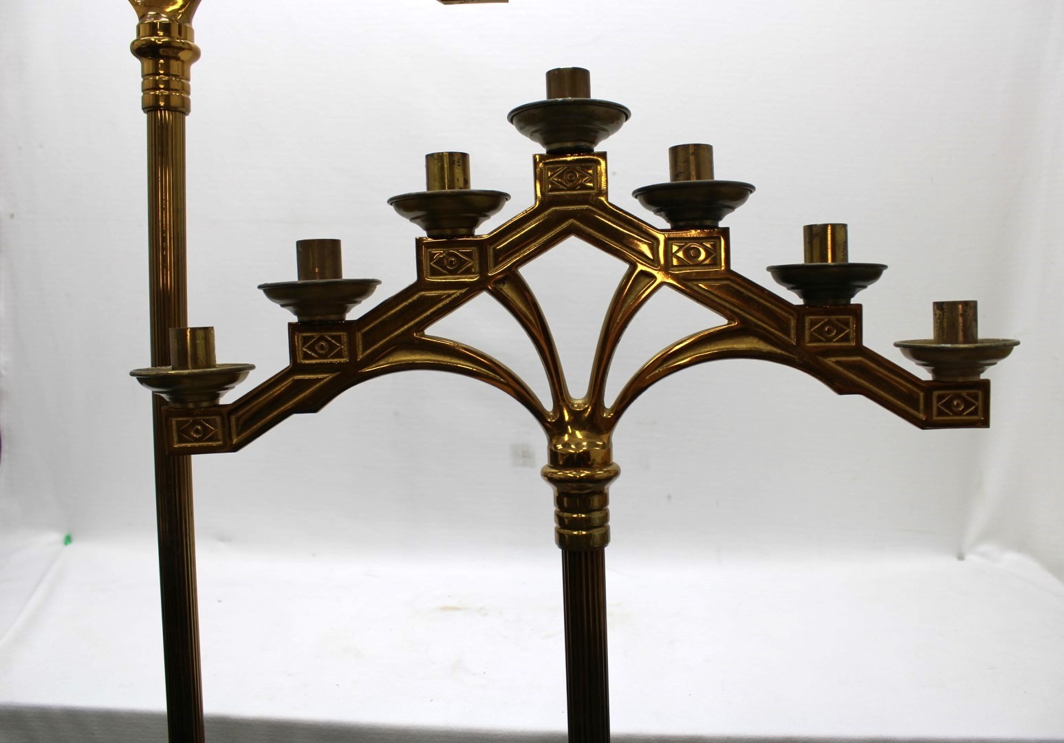 This is a pair of used floor-standing 7-lite candelabra' that are 51" tall. They are made out of brass. They are in fair, usable condition with very minor cosmetic flaws.