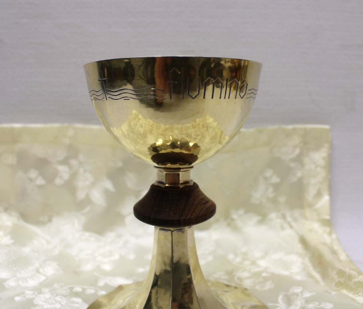 This is a previously used sterling chalice. The chalice is 6 3/4" tall and has a slight hammered finish on the base of the chalice. The dedication on the bottom of the chalice is in Latin.