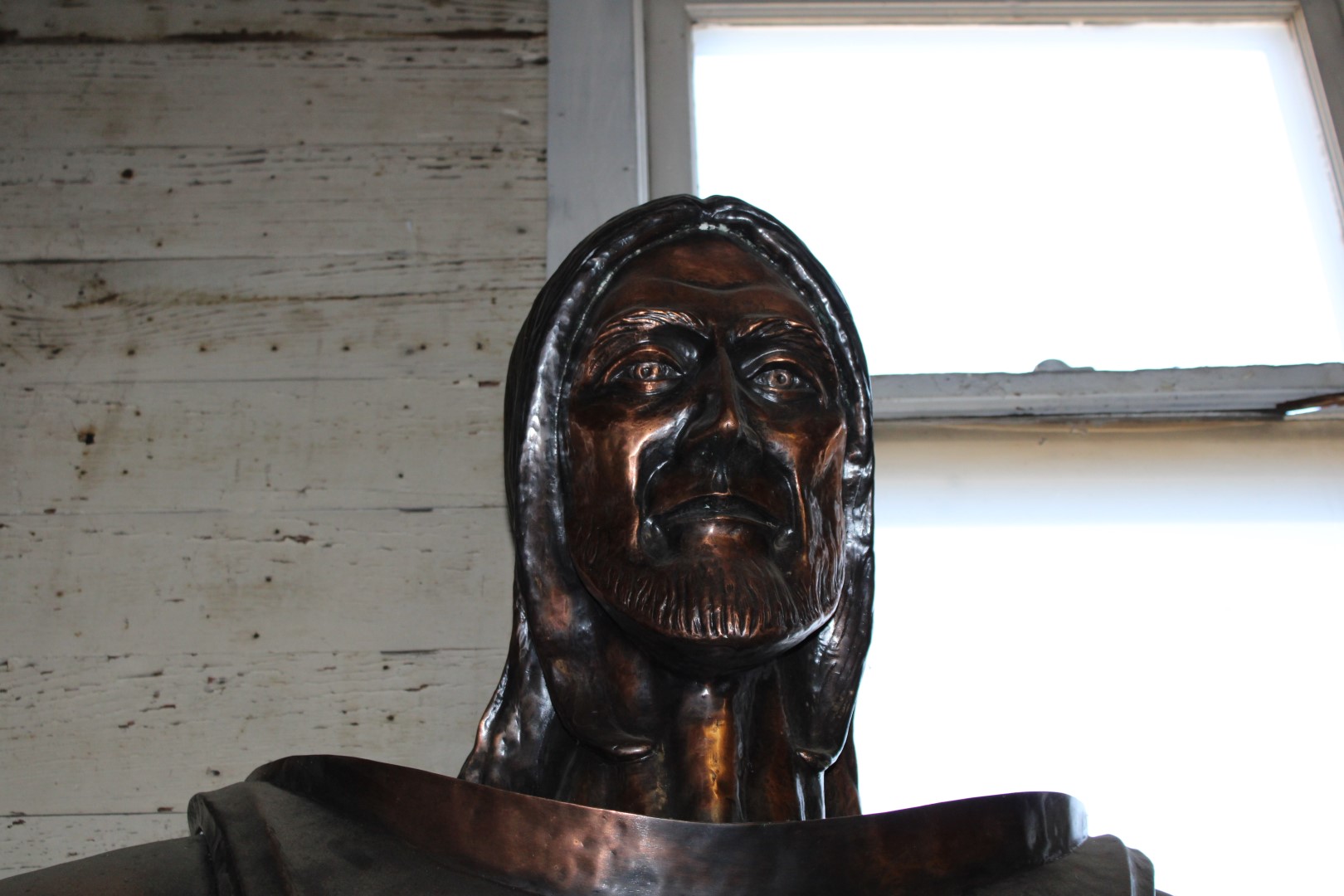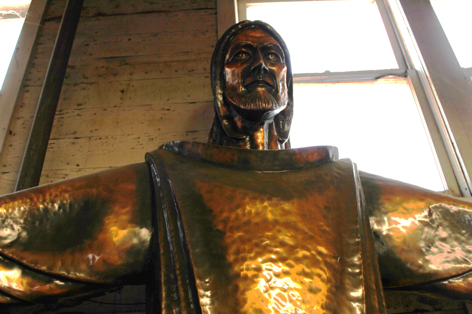 This is a previously owned statue of Risen Christ made out of copper. It is 9' (108") tall and in good condition, with some hammered pattern throughout.