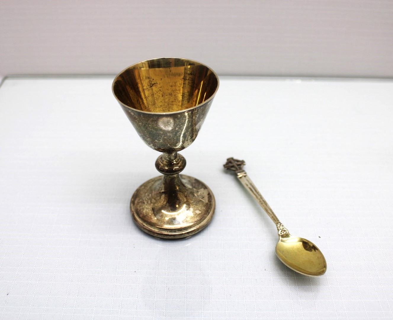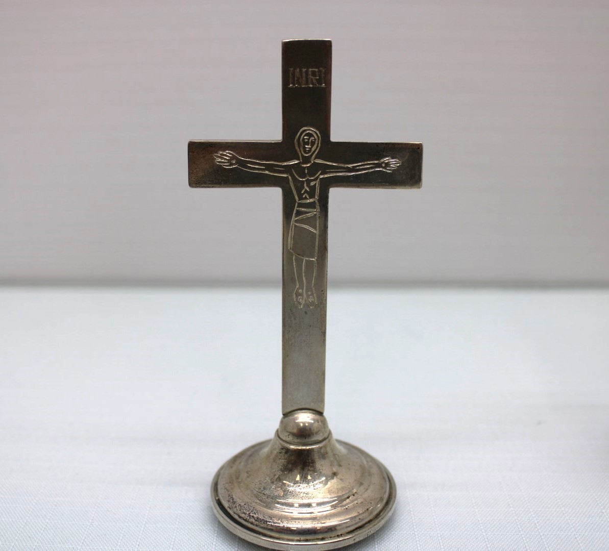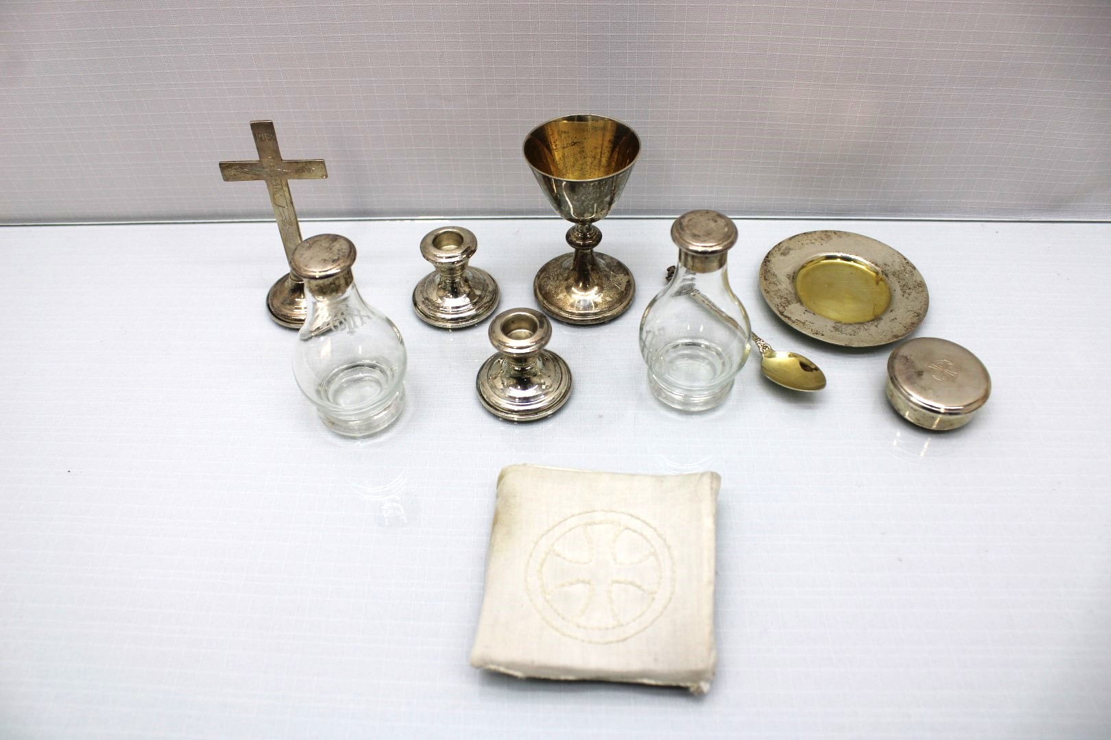 This is a previously used traveling mass kit. This is a 10 piece + case set in all sterling silver, with candlesticks, chalice and paten, and more.