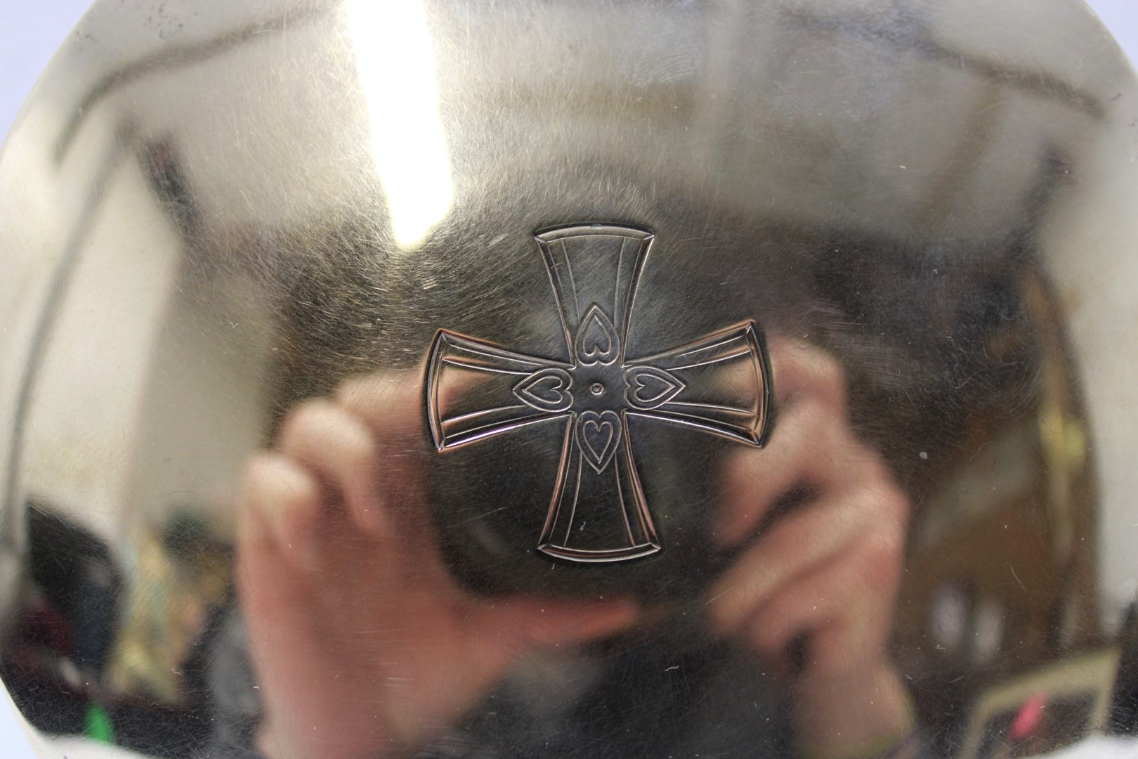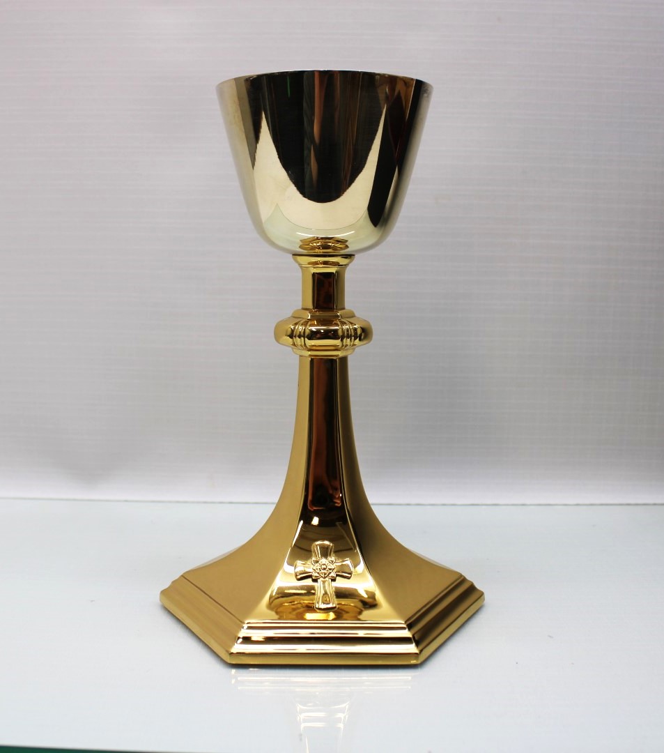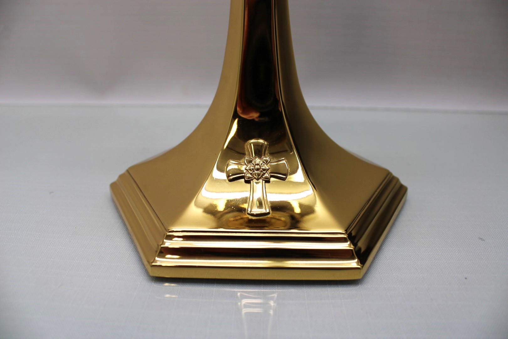 This is a previously owned full sterling chalice & paten set made by Gorham Manufacturing Company that includes a case. This piece features a hex base, base cross, and convex hex node. The paten features a deeply engraved cross.