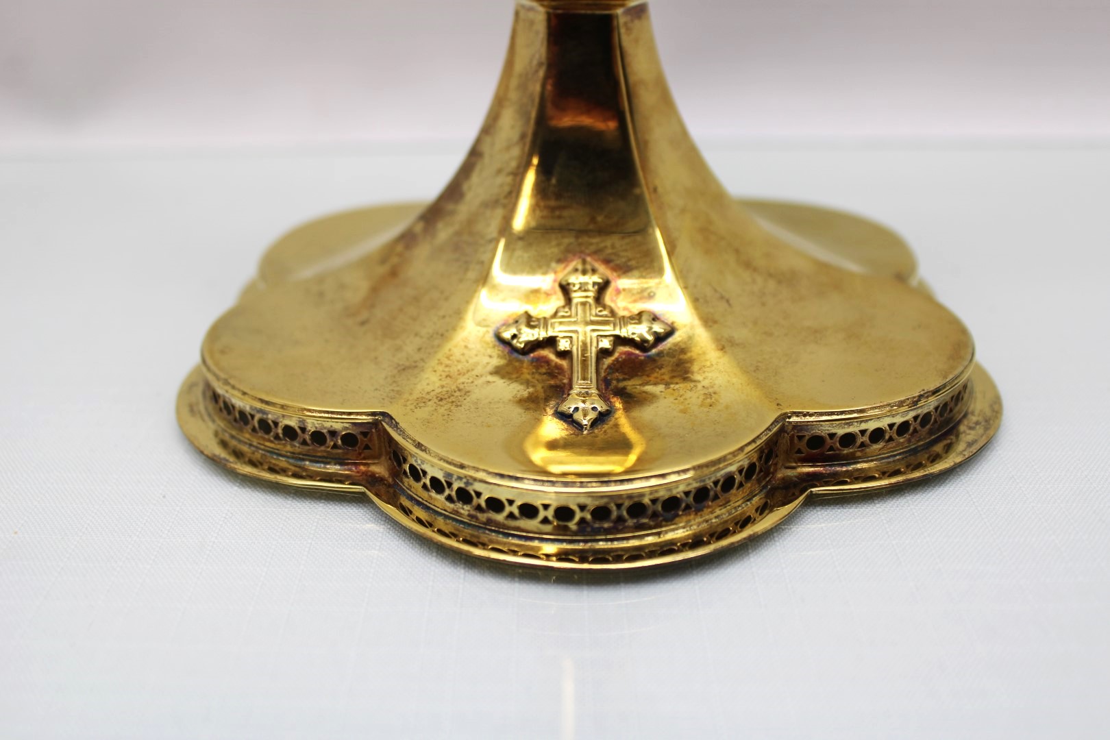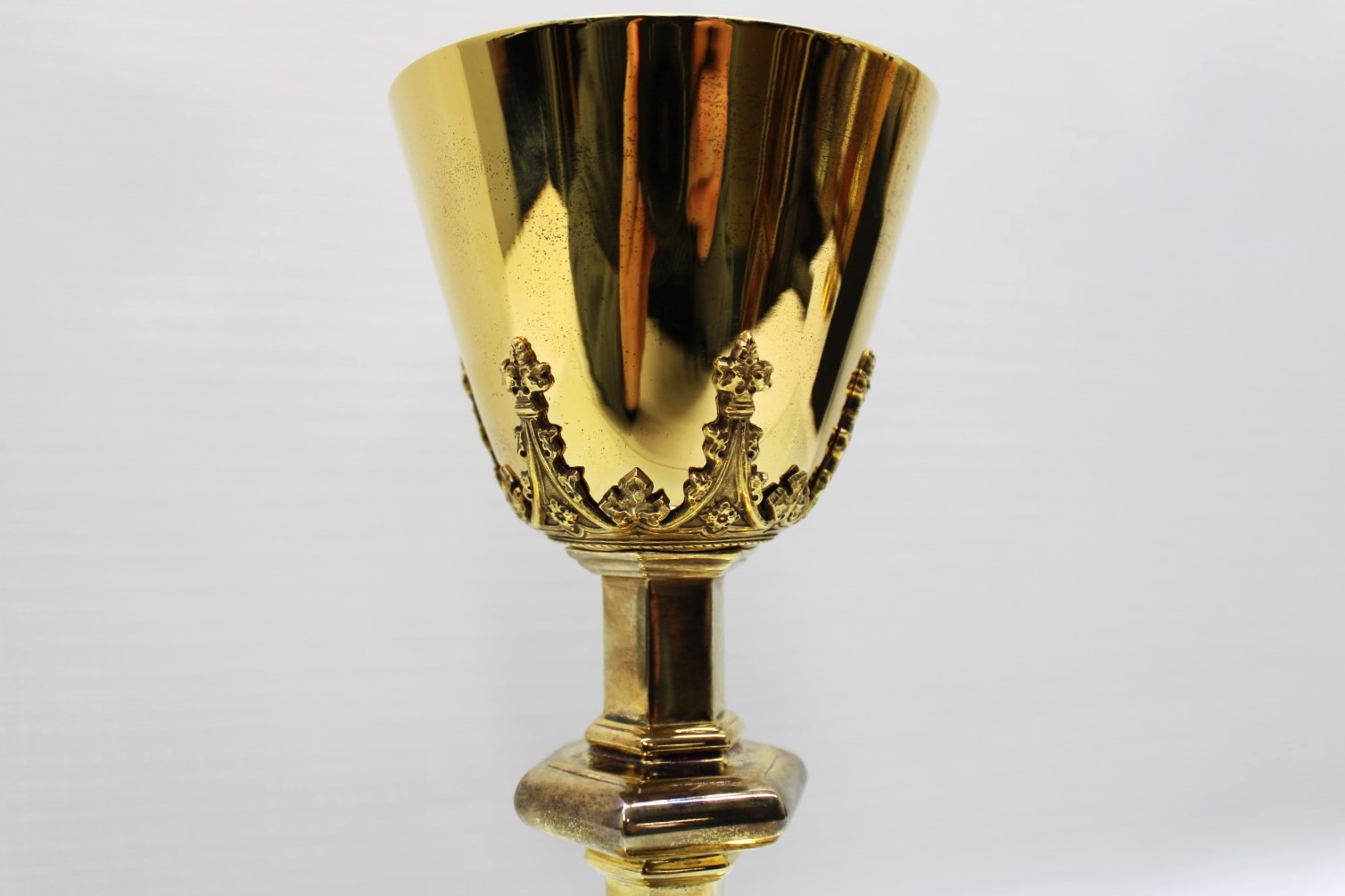 This is a previously owned sterling cup chalice featuring gothic calyx, 2-step hex nodes, scalloped raised base and filigree on the outer rim. This piece is in good condition.
