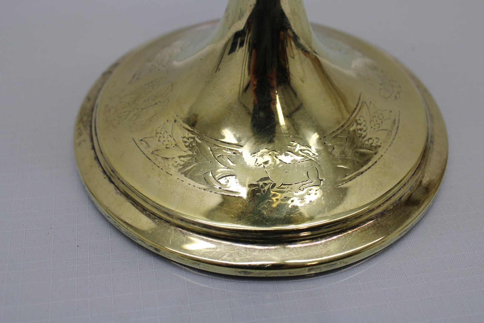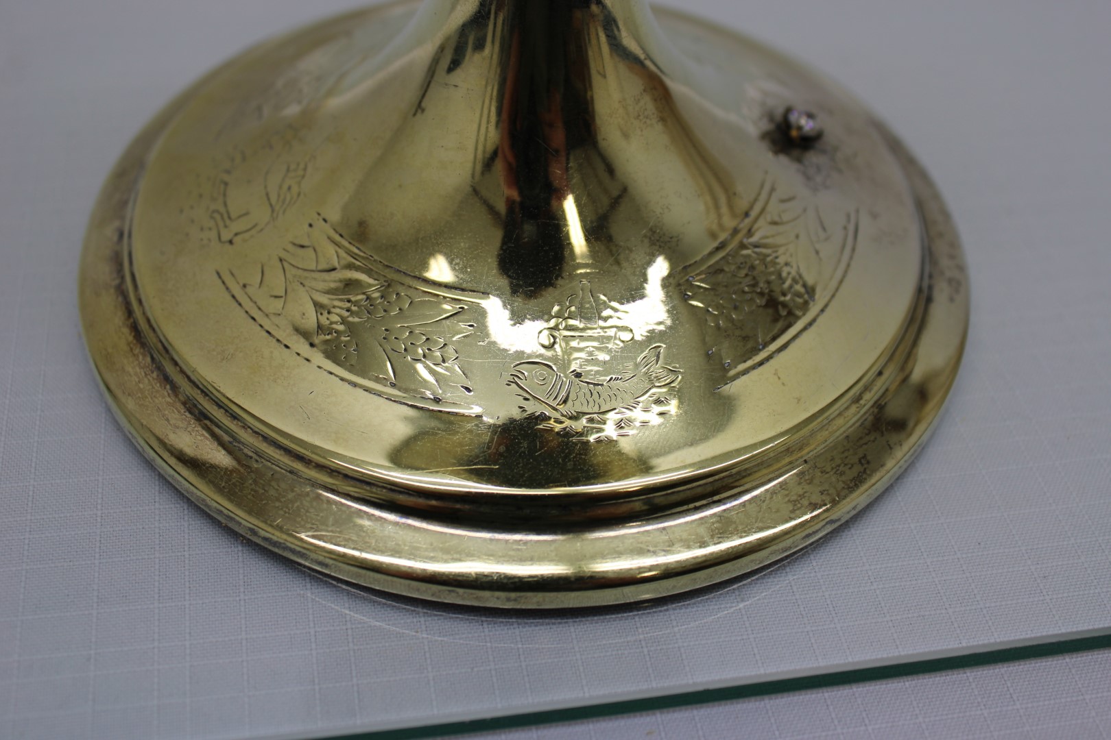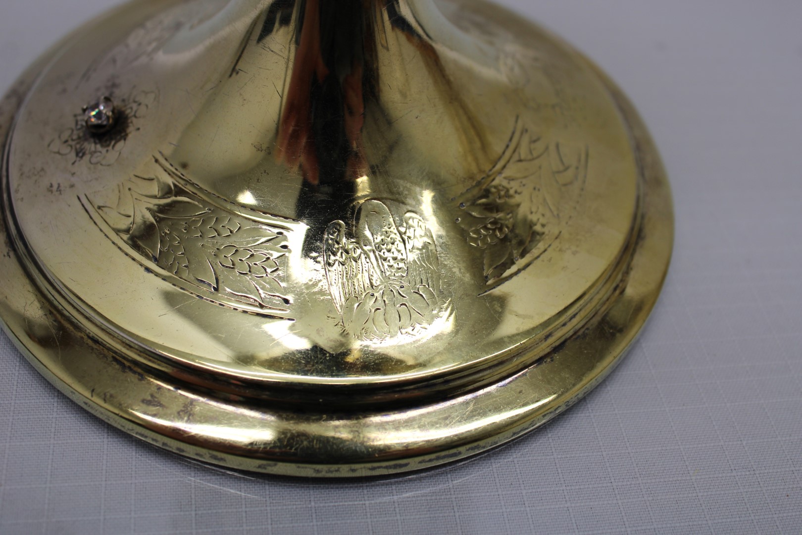 This is a previously used 7-1/4" Sterling cup chalice with a large cubic zirconia stone. The engraving throughout is all hand-done.