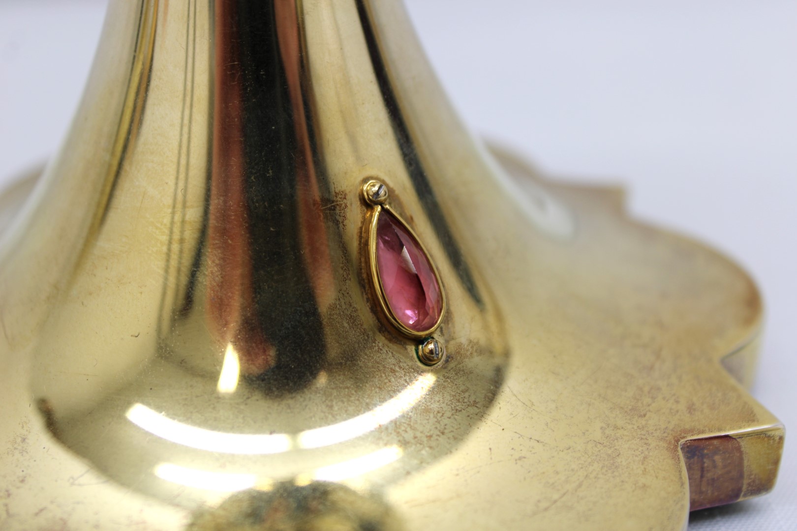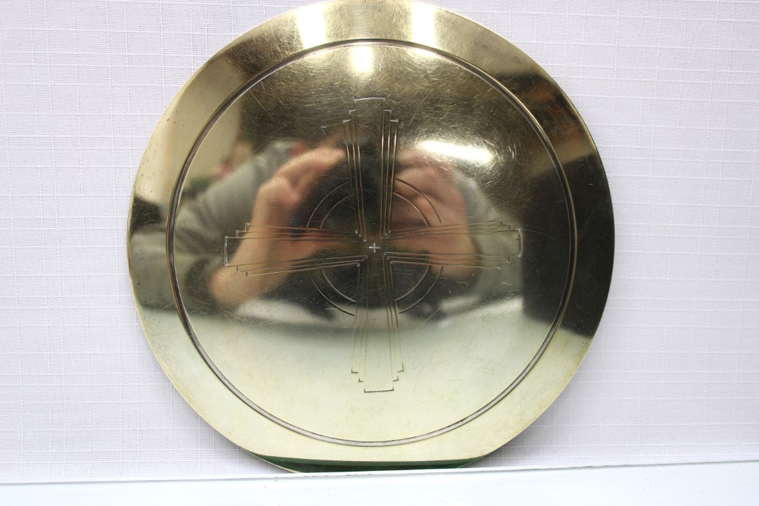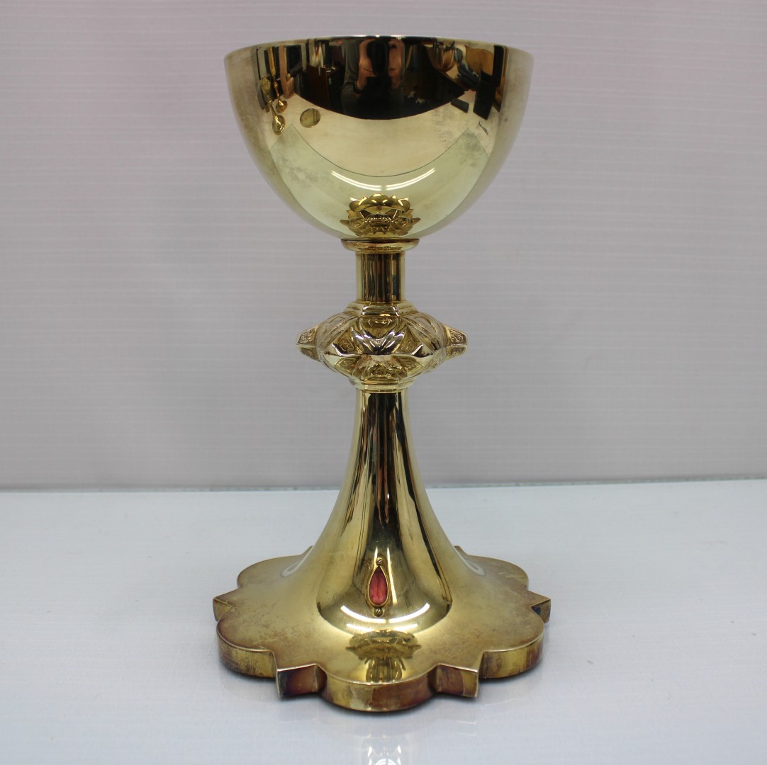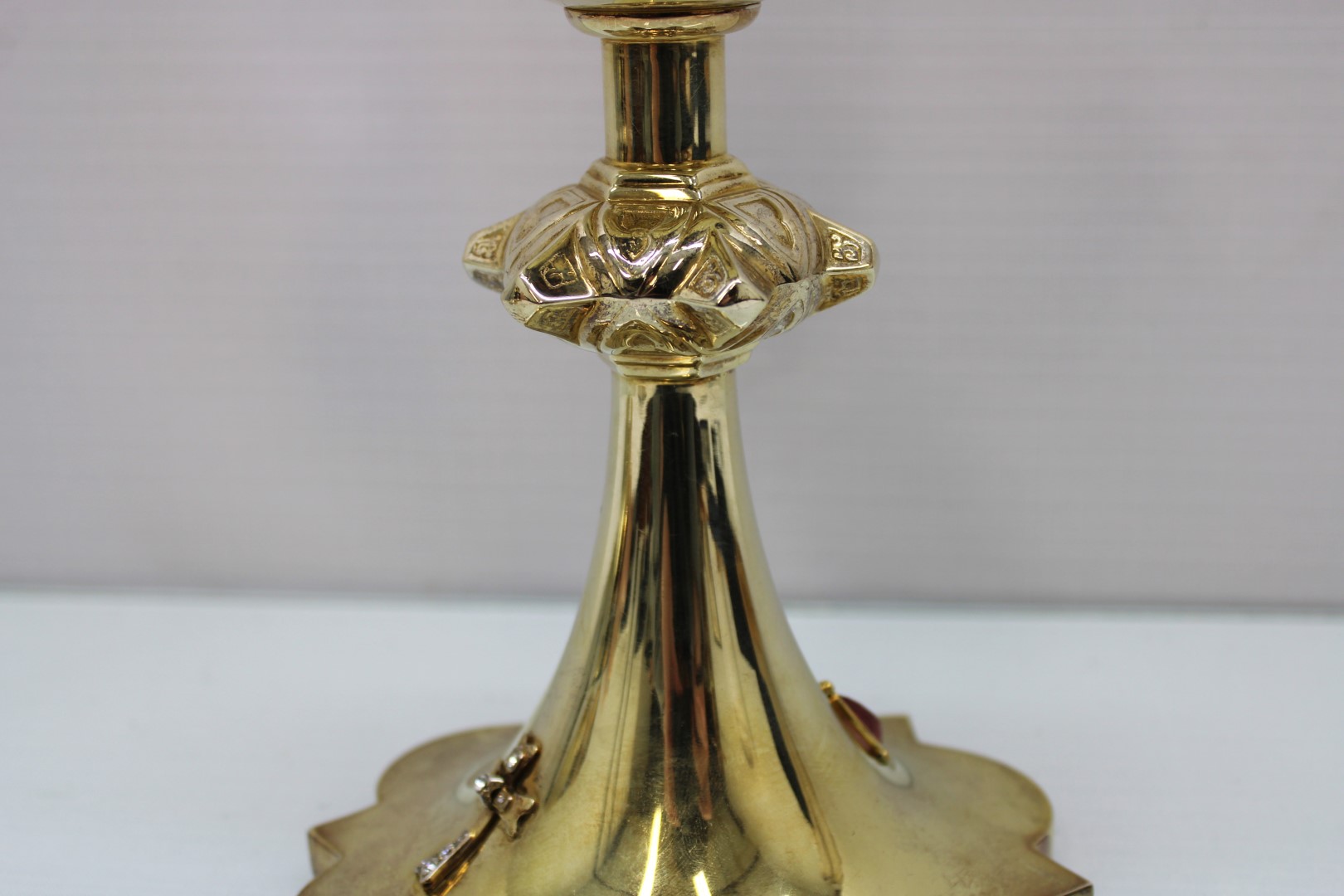 This is a previously used 8 3/4" Sterling Cup Chalice. This piece features 6 diamonds in a 14k gold cross and a pink tourmaline on the opposite side. Includes 5 3/4" sterling paten and case.