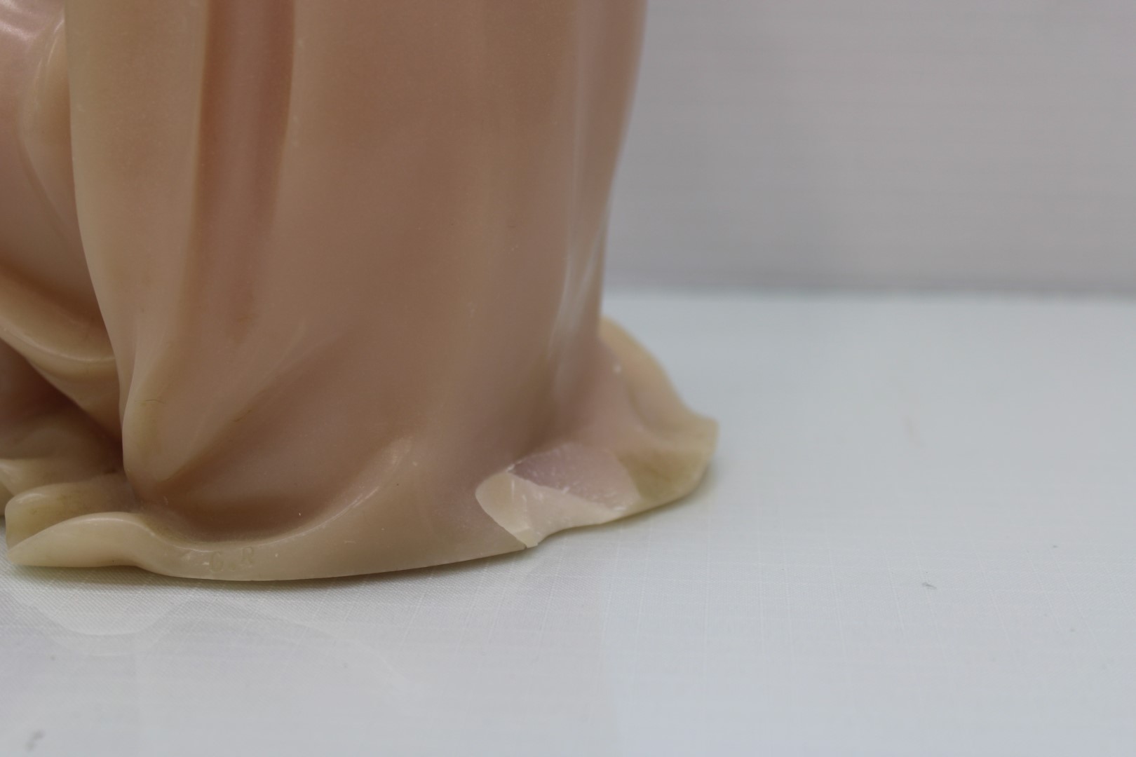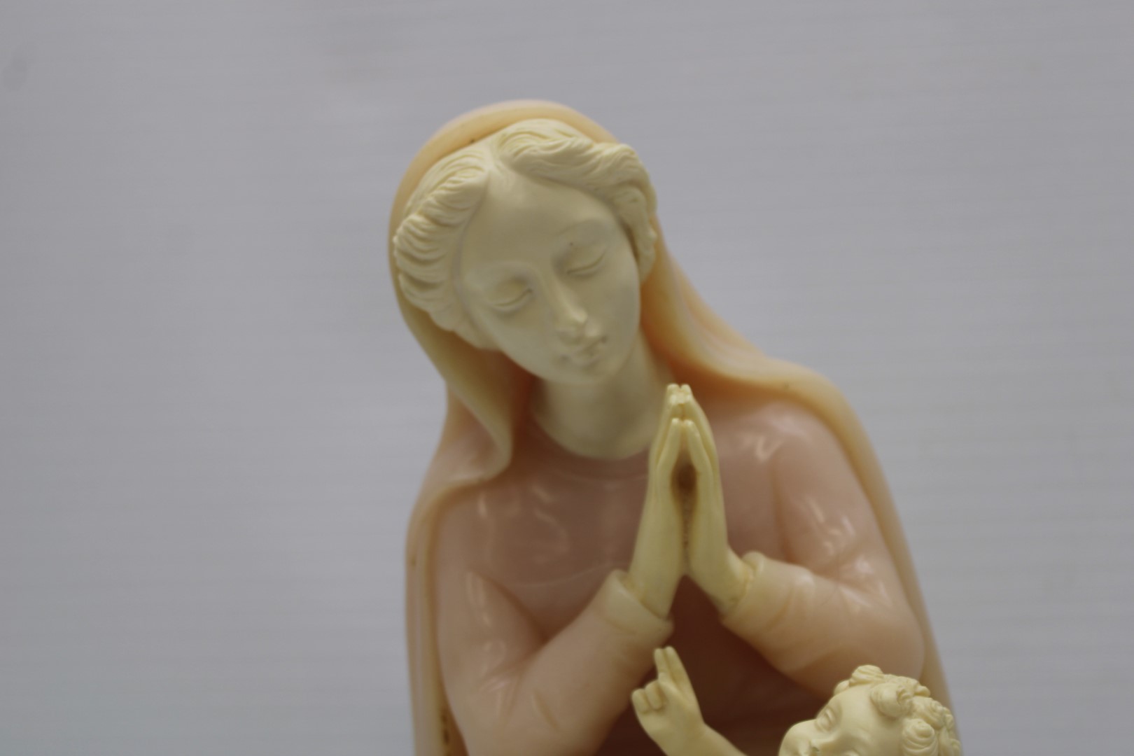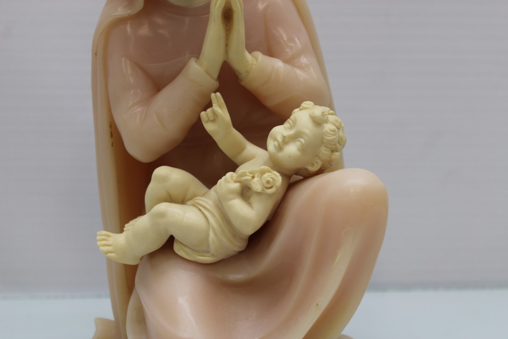 This is a previously owned soapstone statue of Madonna and Child and stands 9 1/2" tall. This item does have a small crack in the back (shown).