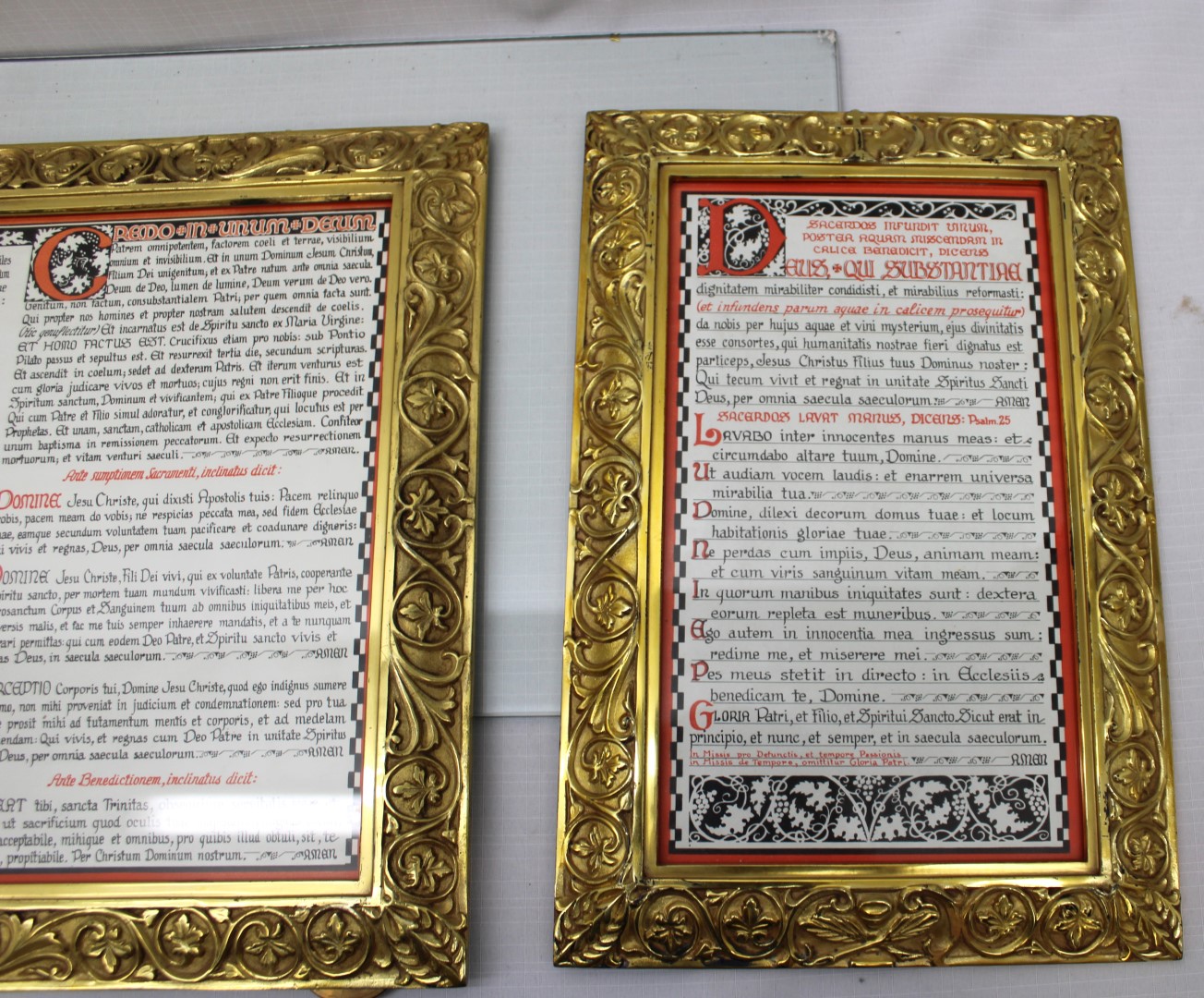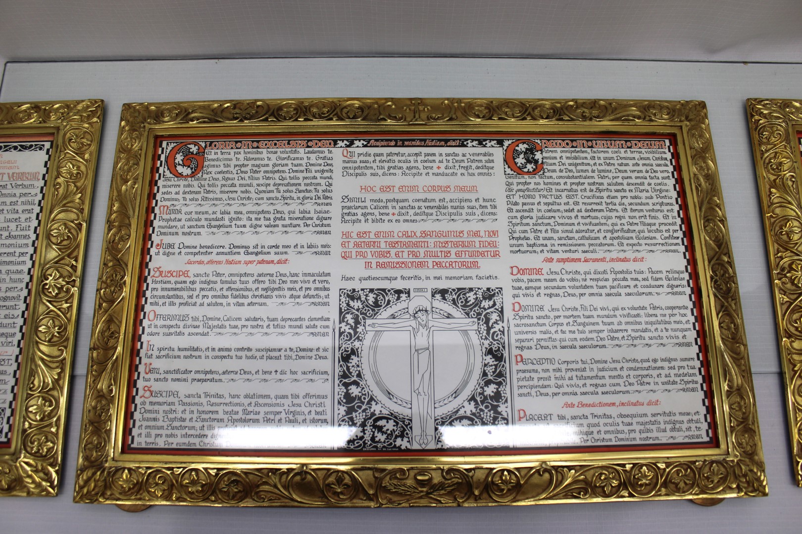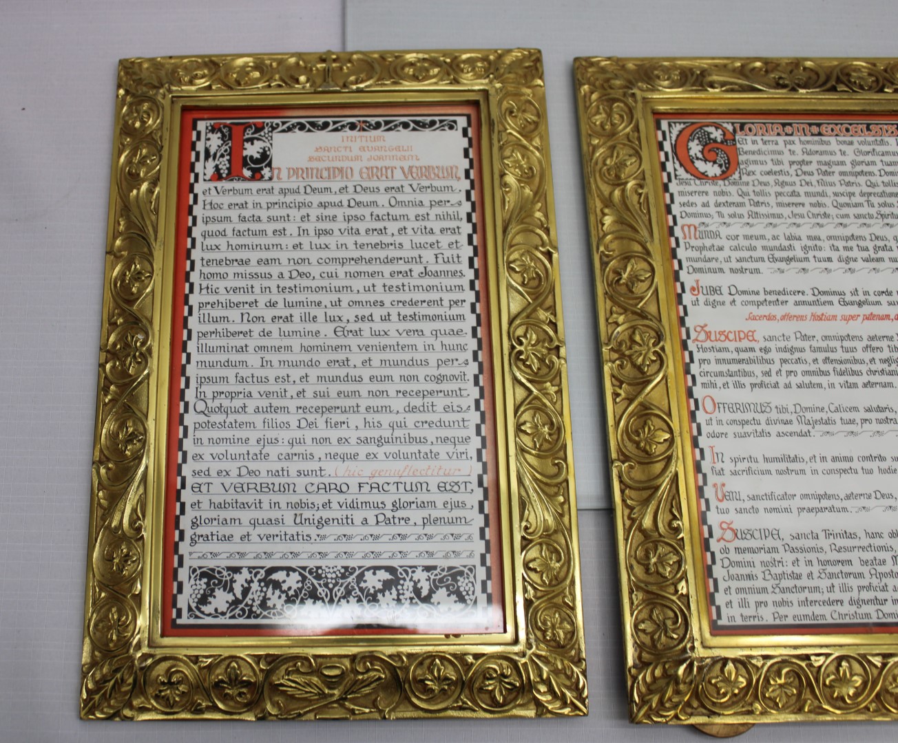 This is a previously owned mass card set with ornate cast brass frames. This set has a center card that measures 14" x 21 1/2" and features horizontal wheels for ease of movement in front of the tabernacle.