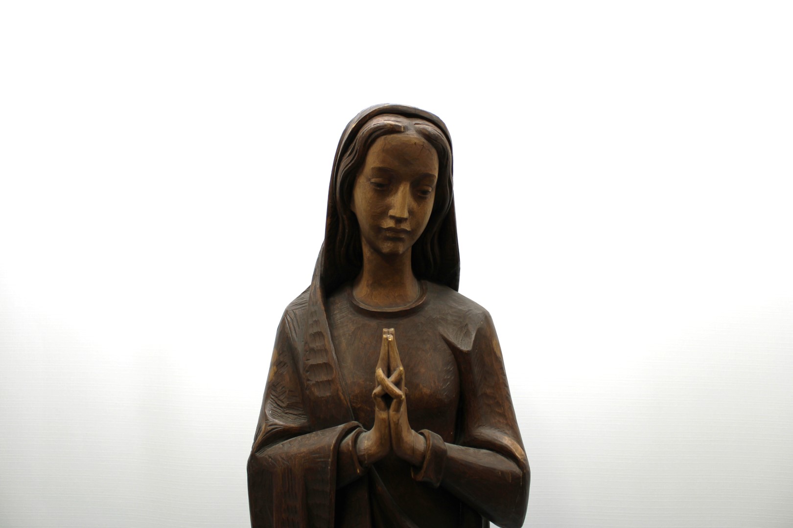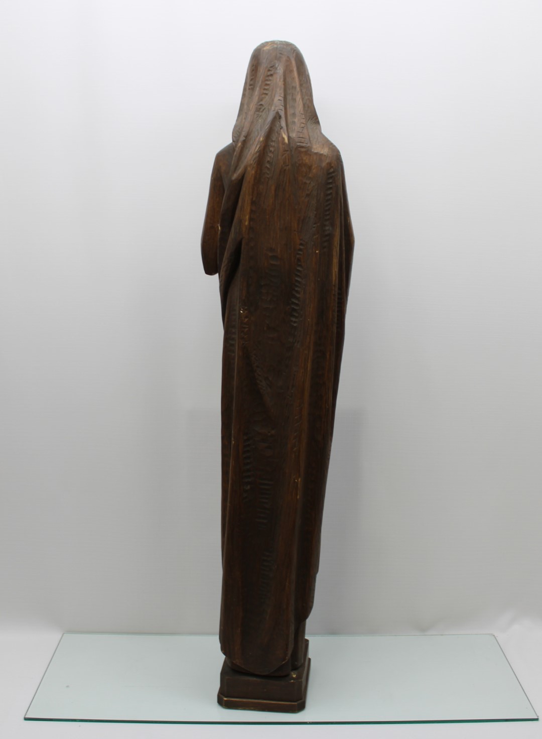 This is a previously owned wood carved Madonna statue. This item measures 42" tall and is in good condition.
