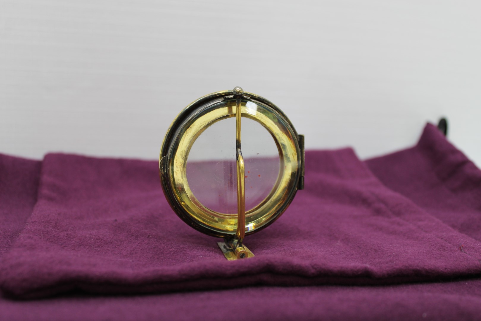 This is a previously owned luna. This piece is made of brass, features glass windows, and measures 2 1/2" across.
