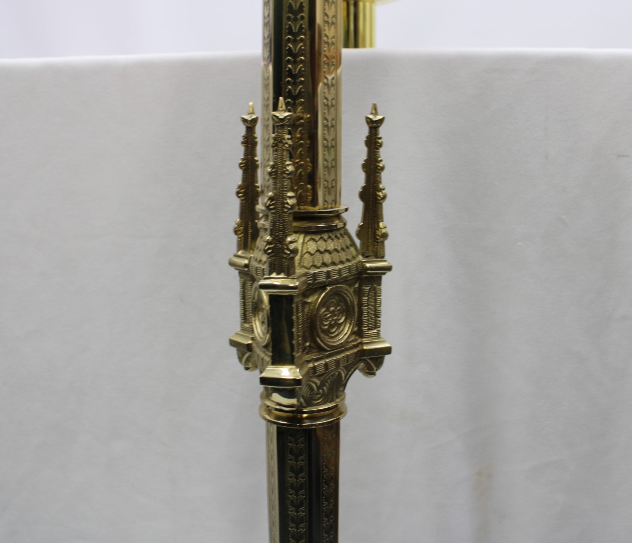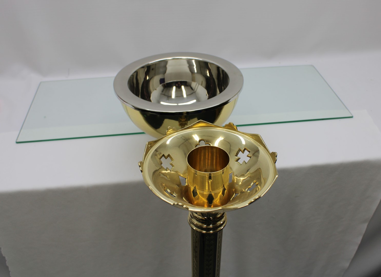 This is a previously owned 44 1/2" high polish brass holy water font with removable bowl. The socket has a diameter of 2 1/32" and can be used for candles also. This piece is in excellent condition.