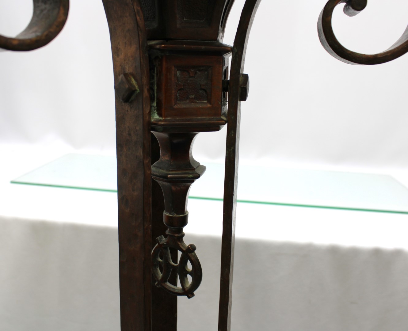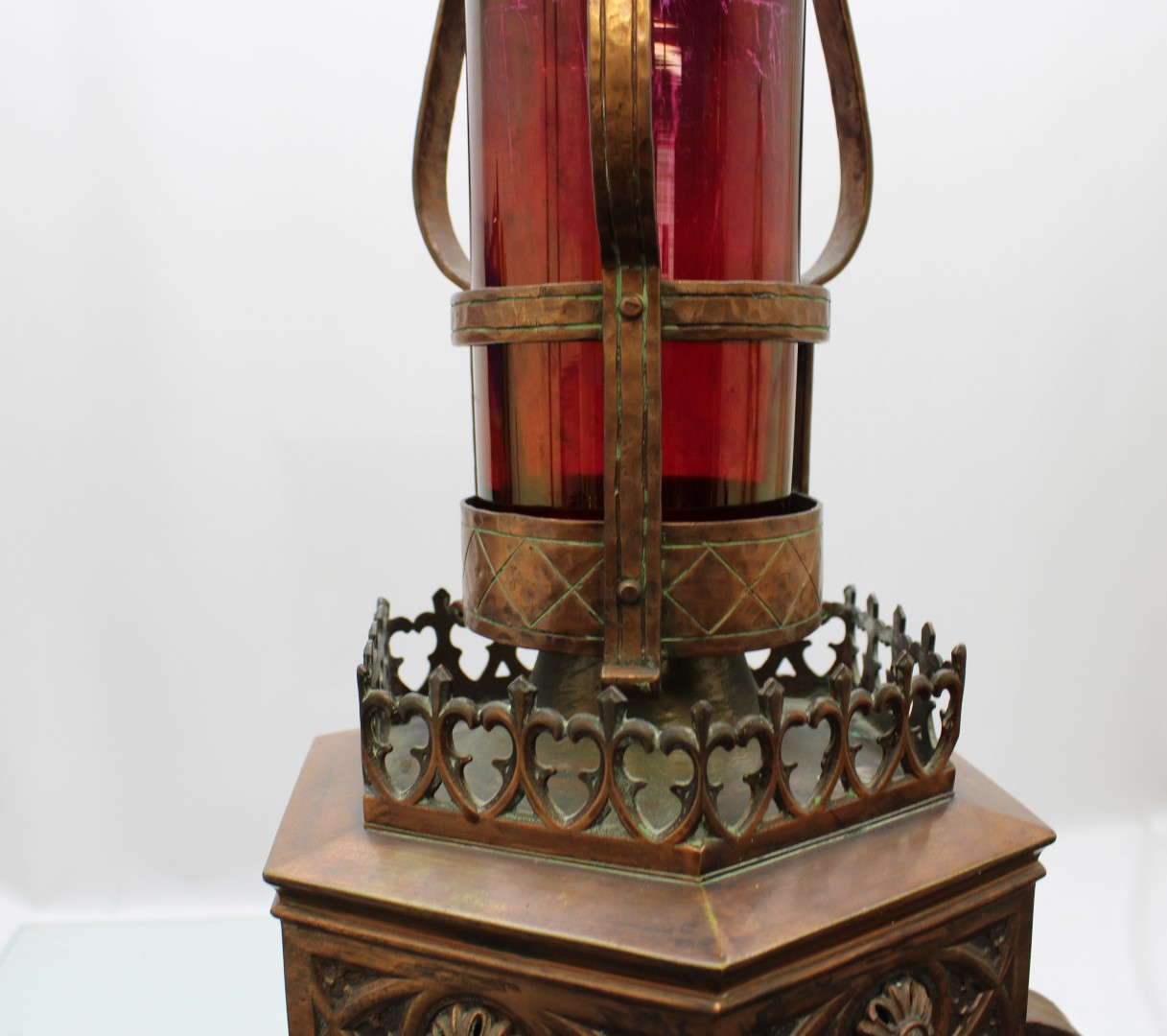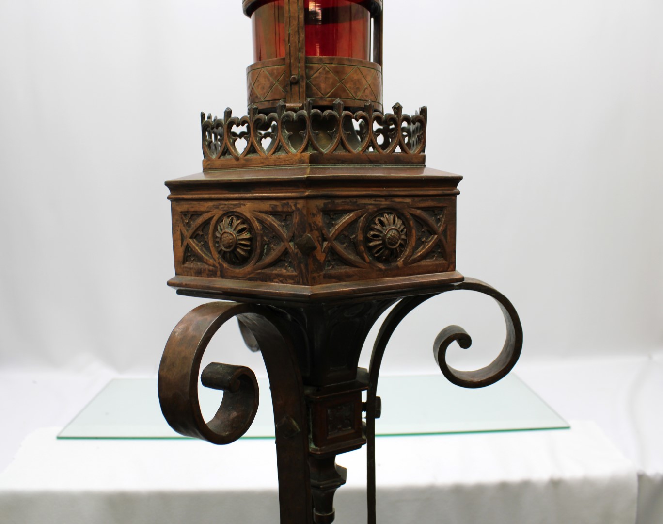 This is a previously used standing sanctuary light made of copper. This measures 58" in height and has ornate details throughout. Globe and globe top are included.