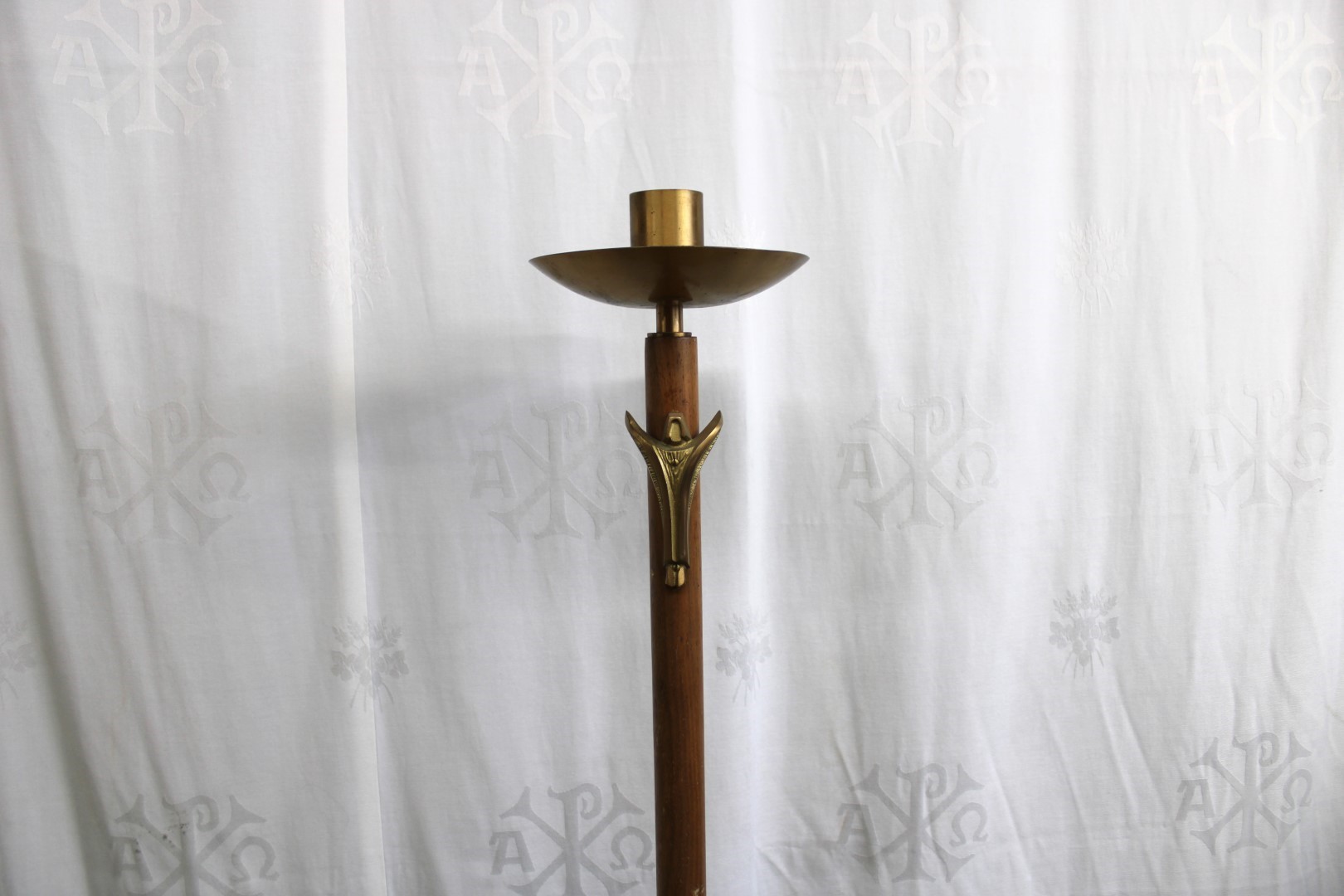 This is a previously owned processional candlestick. This features a small bronze risen Christ on the front.