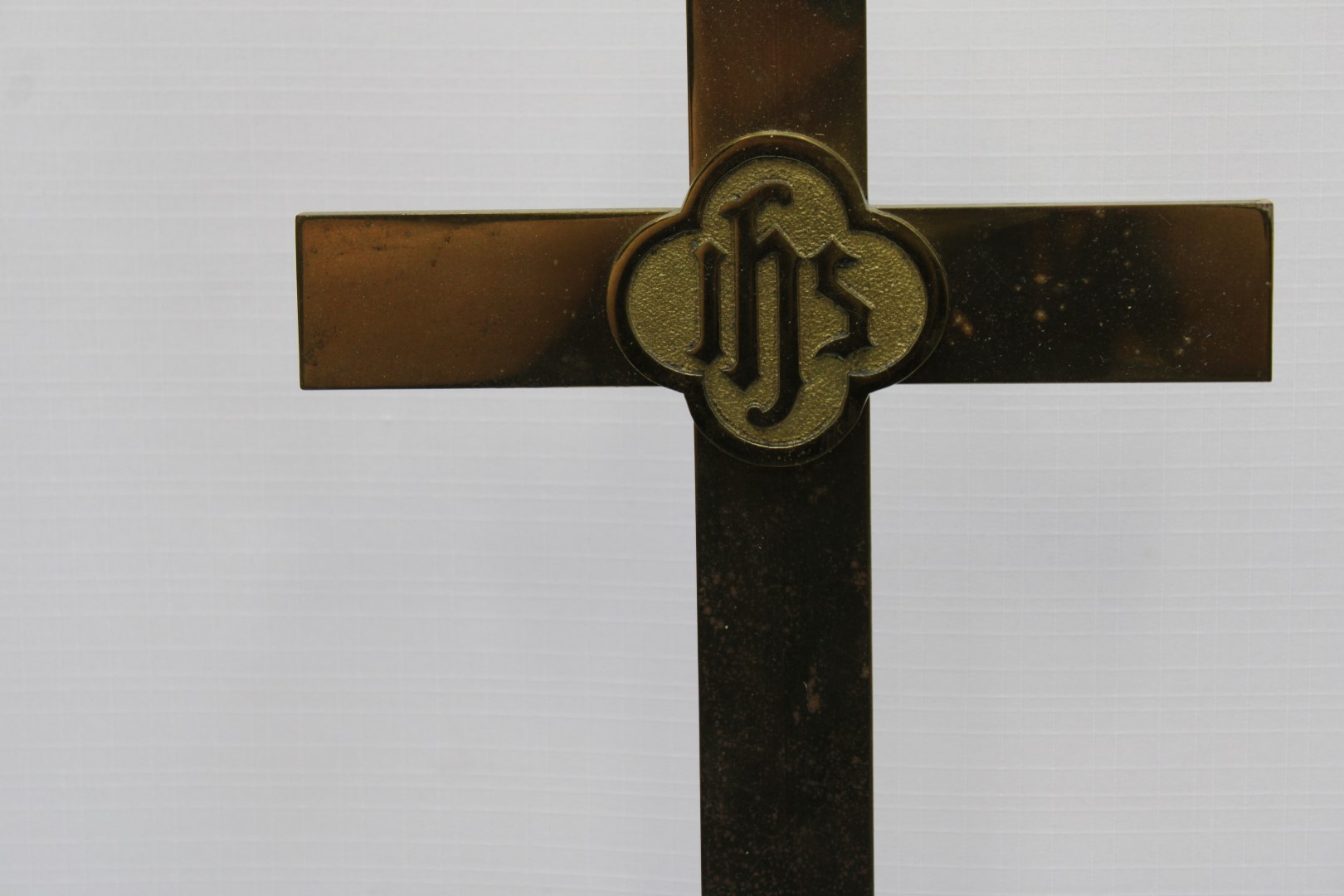 This is a previously owned 18" brass tri-step altar cross. This piece features an IHS in the center and is in good condition.