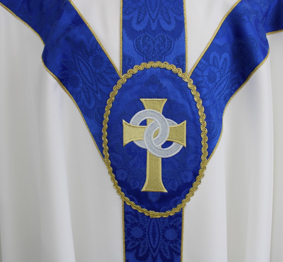 This is a NEW white wedding chasuble featuring a St. Andrew's cross and the interlocking wedding bands. Includes matching stole.