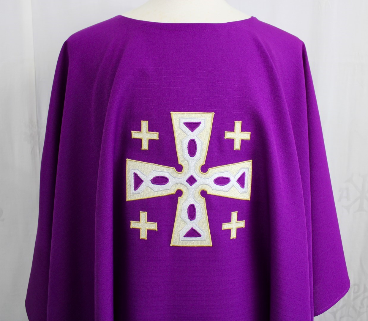 This is a NEW purple chasuble featuring the Cathedral Cross on the chest. Includes matching stole.