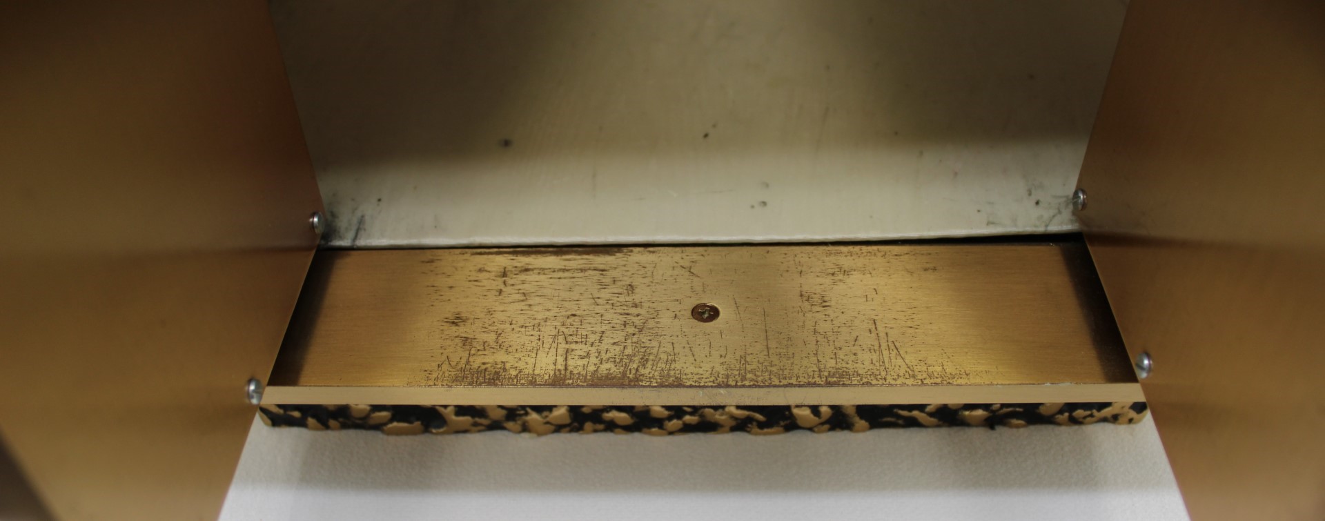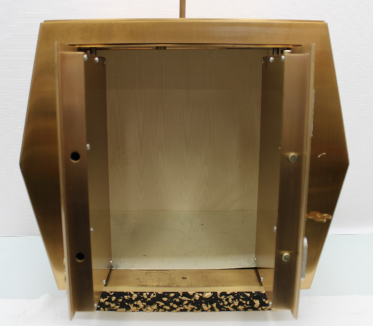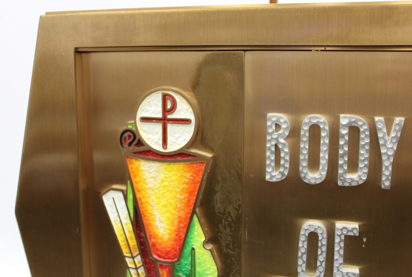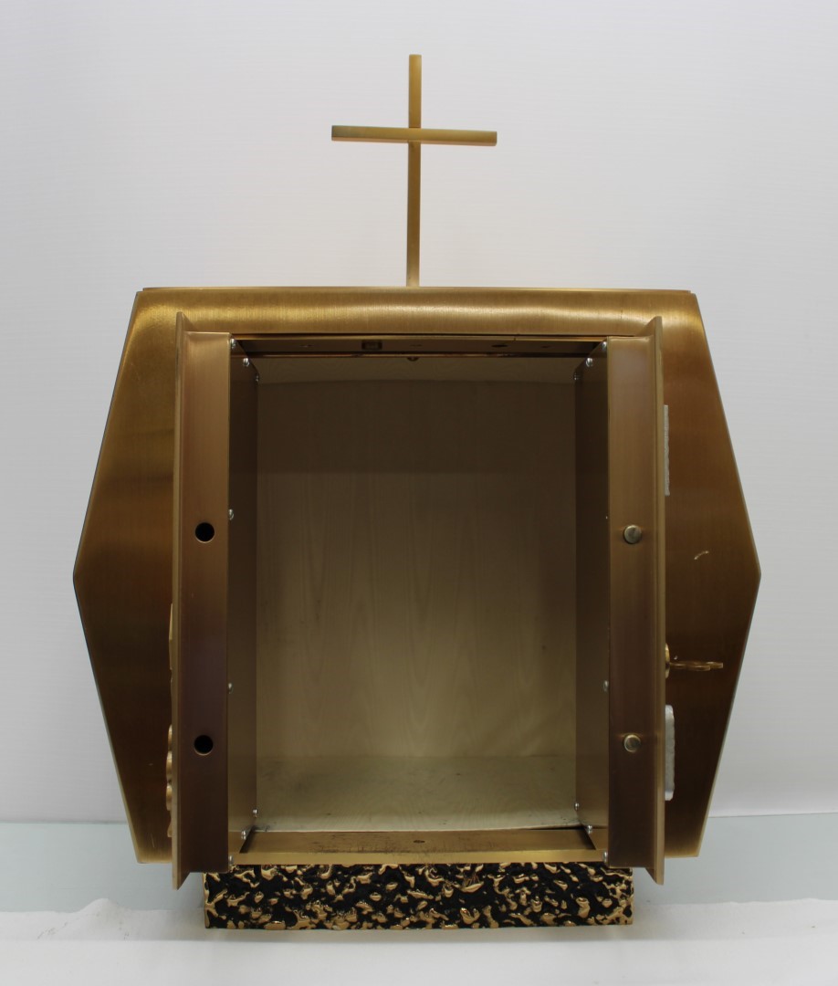 This is a previously owned combination (high polish and satin) finish bronze tabernacle with chalice and grape ornamentation on the door. This piece measures 16 1/2" W x 15 3/4" H x 12 1/2" D. This Tabernacle is in good condition.