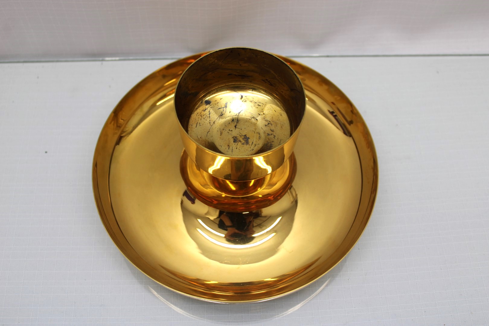 This is a previously used Brass Intinction Set With 7 1/2" Diameter plate. It is in good, usable condition.