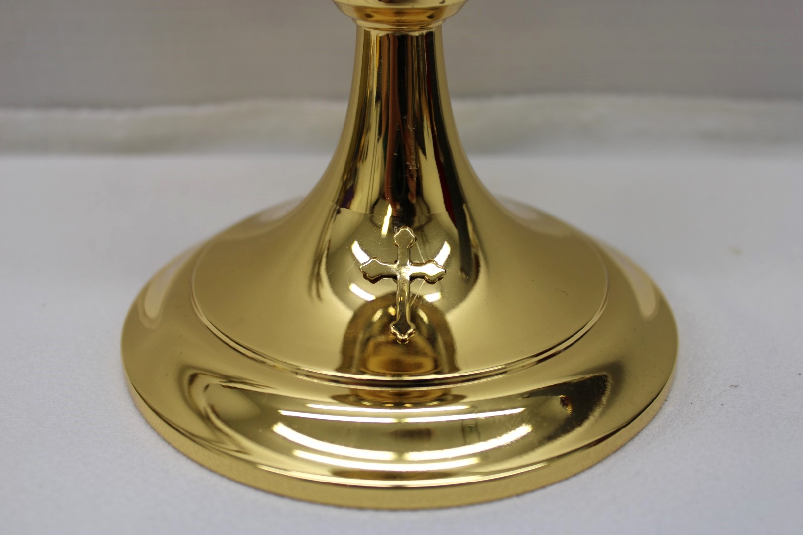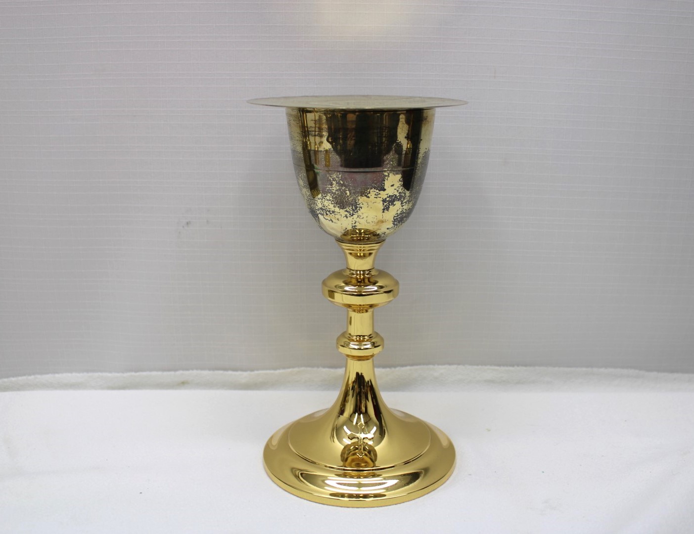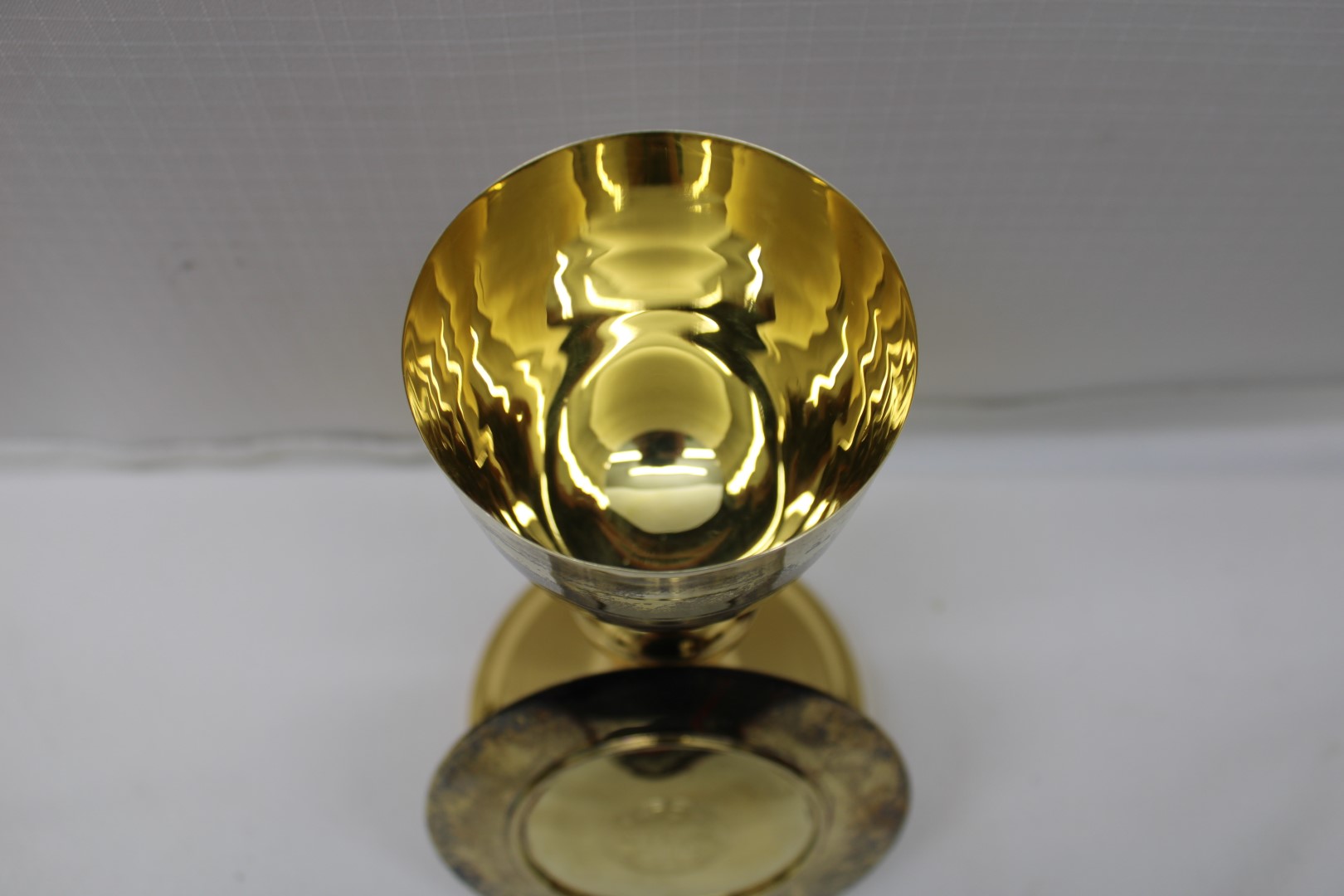 This is a previously used 9" sterling cup chalice w/ sterling paten. This piece is in good condition.