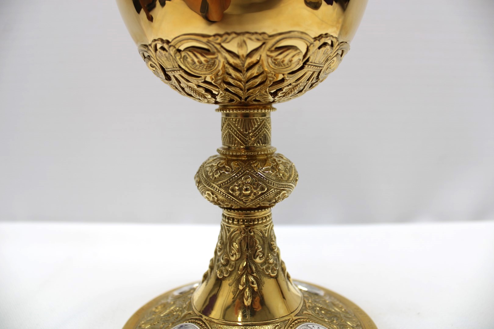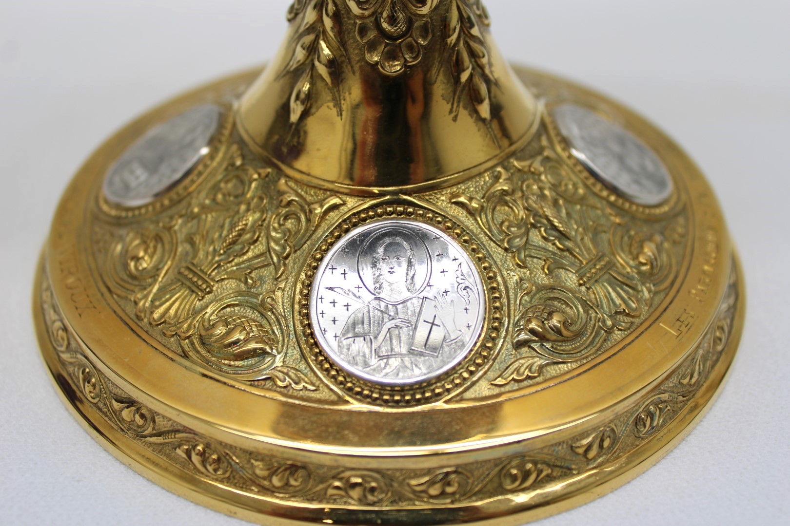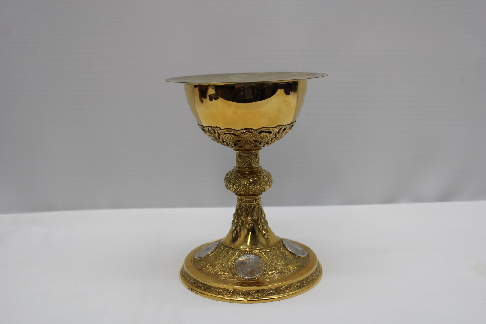 This is a previously owned 7 5/8" .800 sterling silver chalice & paten. This piece features 2-tone medallions of the Four Evangelists. The paten measures 5 7/8" and has an IHS engraving.