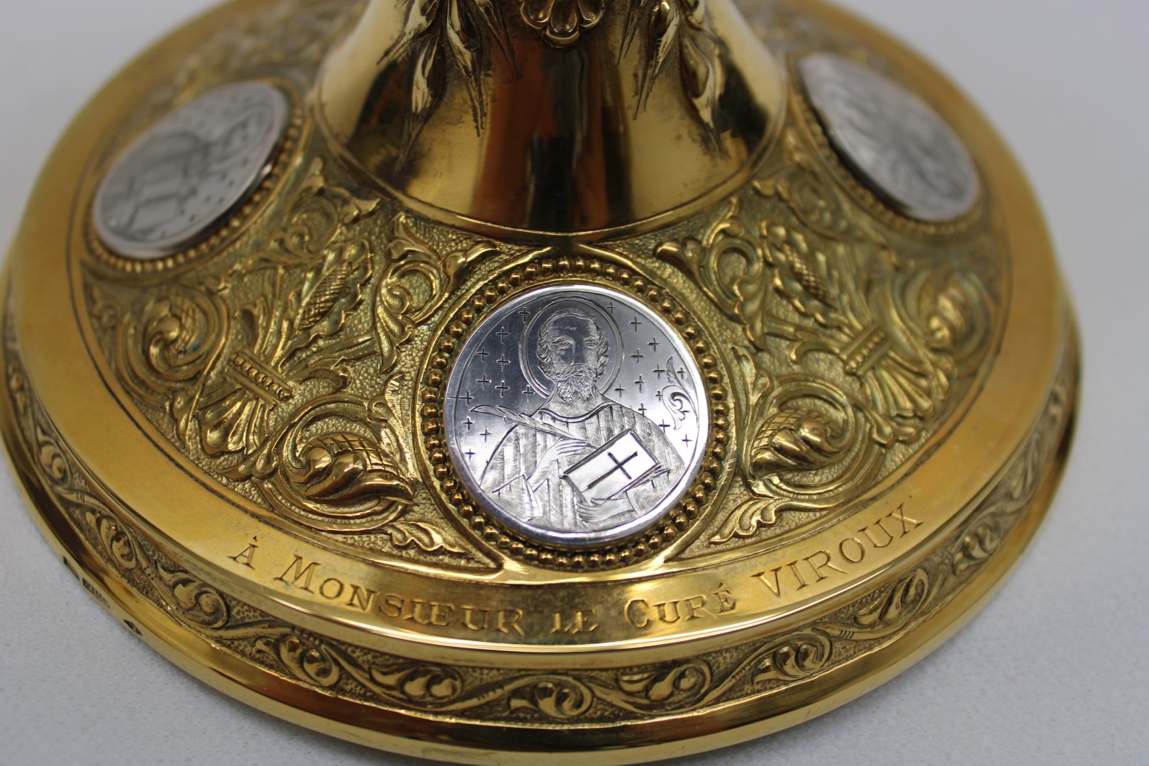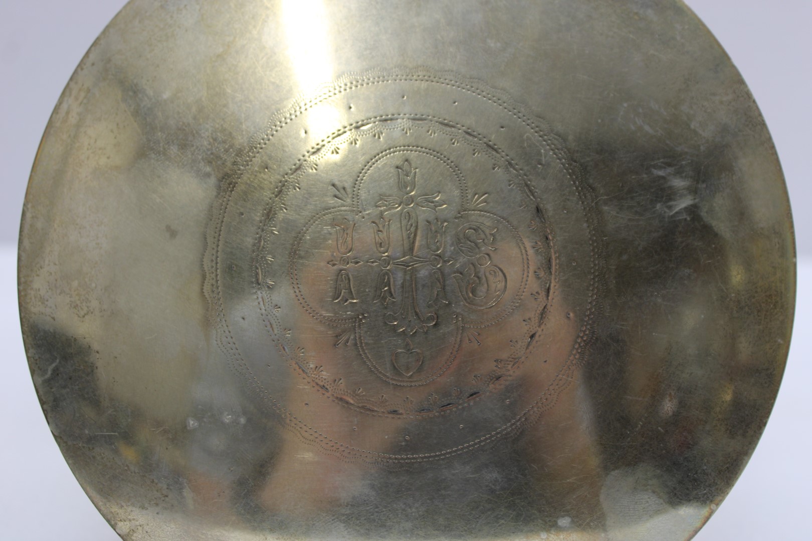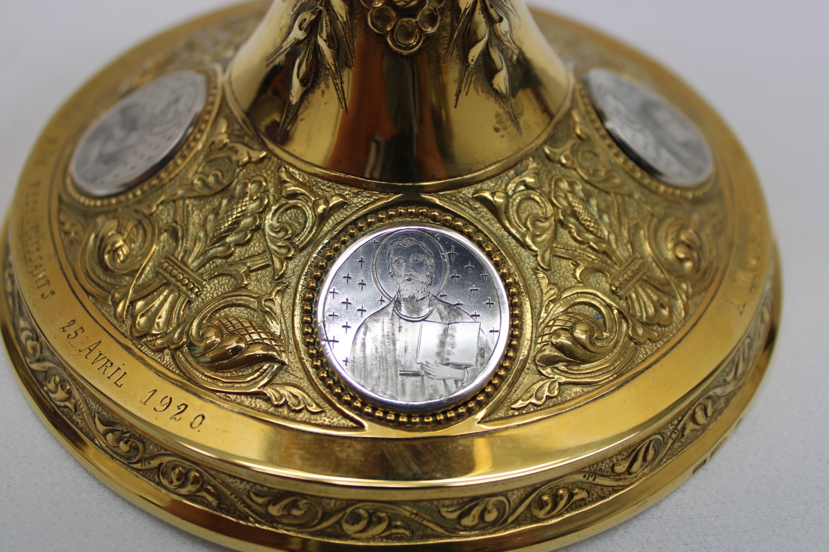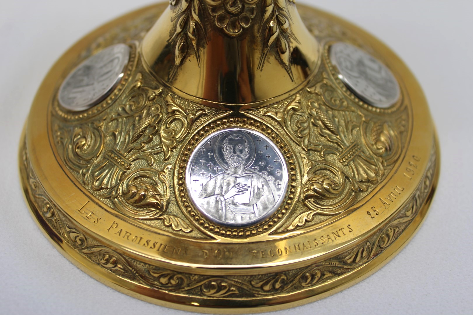 This is a previously owned 7 5/8" .800 sterling silver chalice & paten. This piece features 2-tone medallions of the Four Evangelists. The paten measures 5 7/8" and has an IHS engraving.