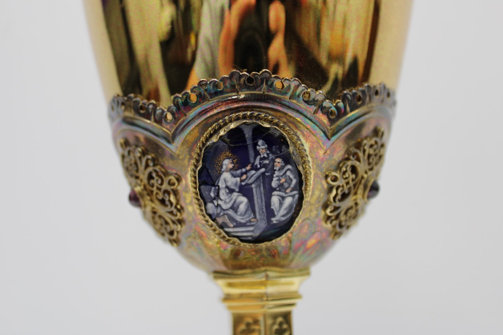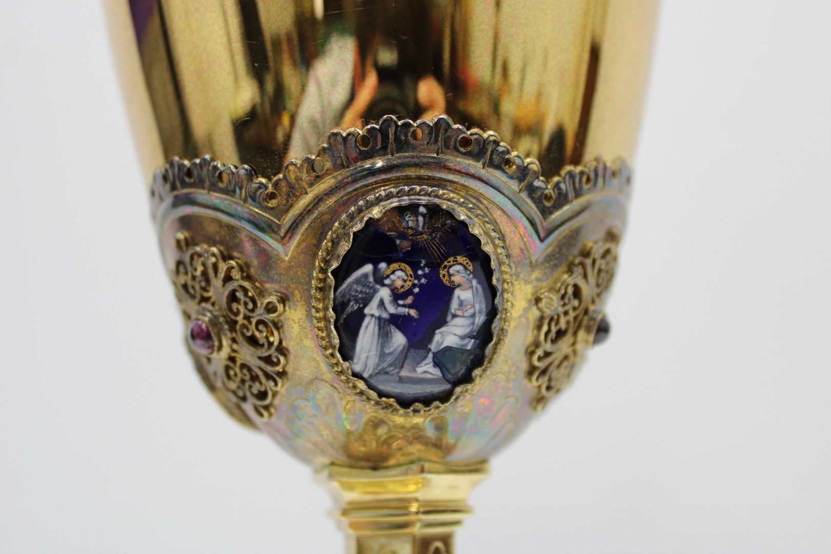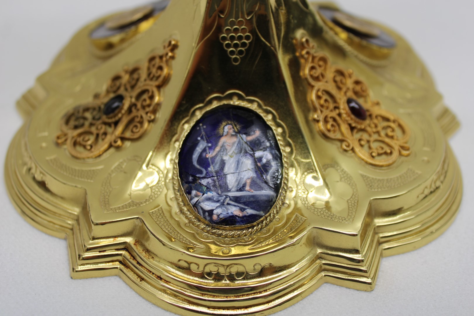 This is a previously owned 10 1/8" French sterling silver chalice. This piece features multiple enamel medallions, all of which have some damage to them, and a beautifully ornate node.