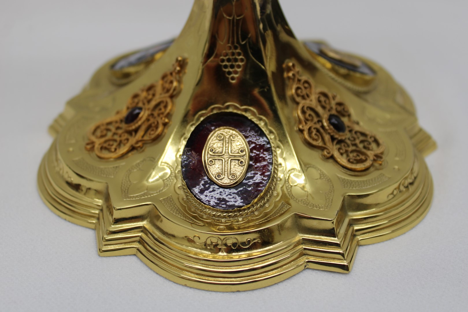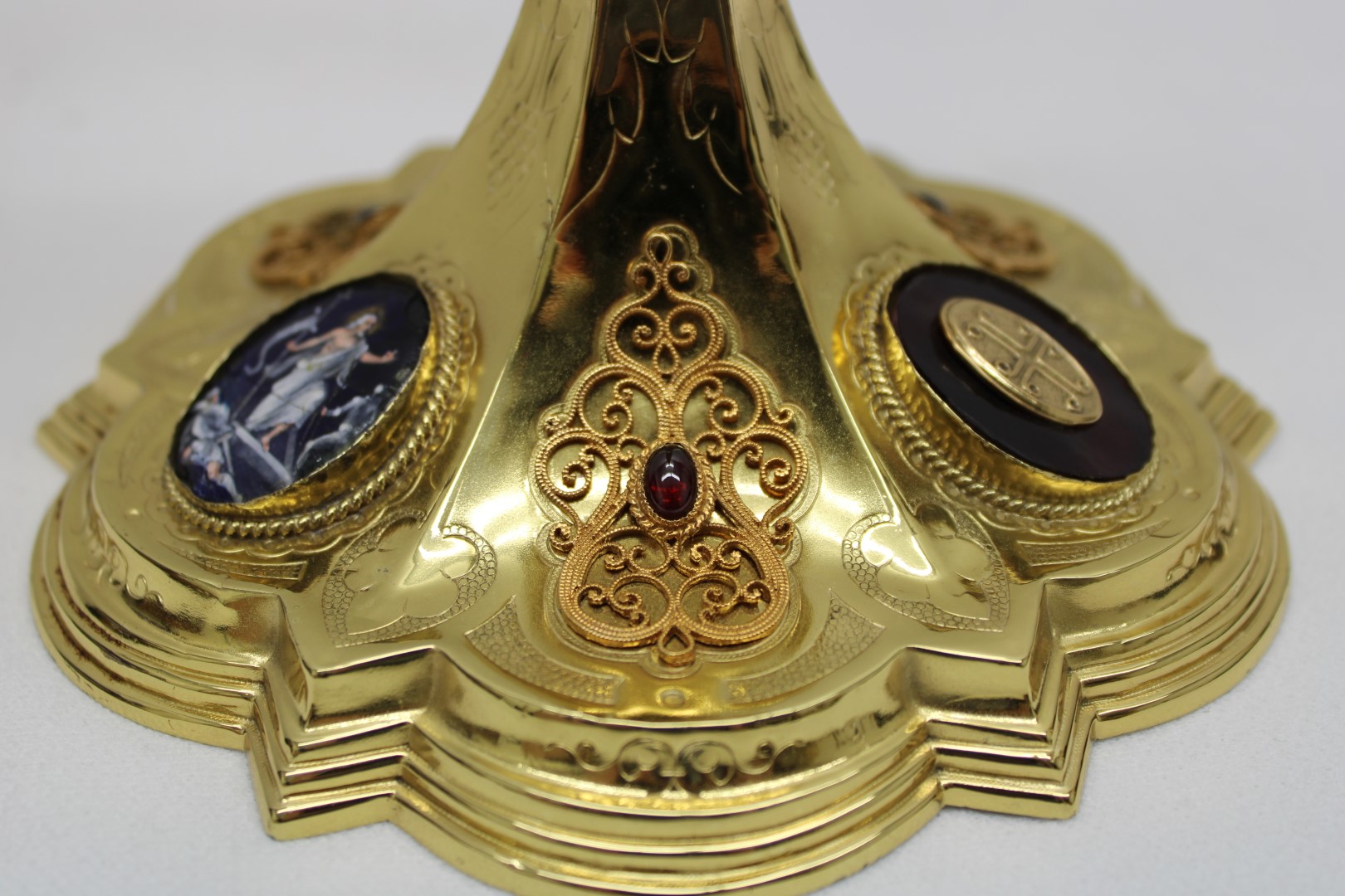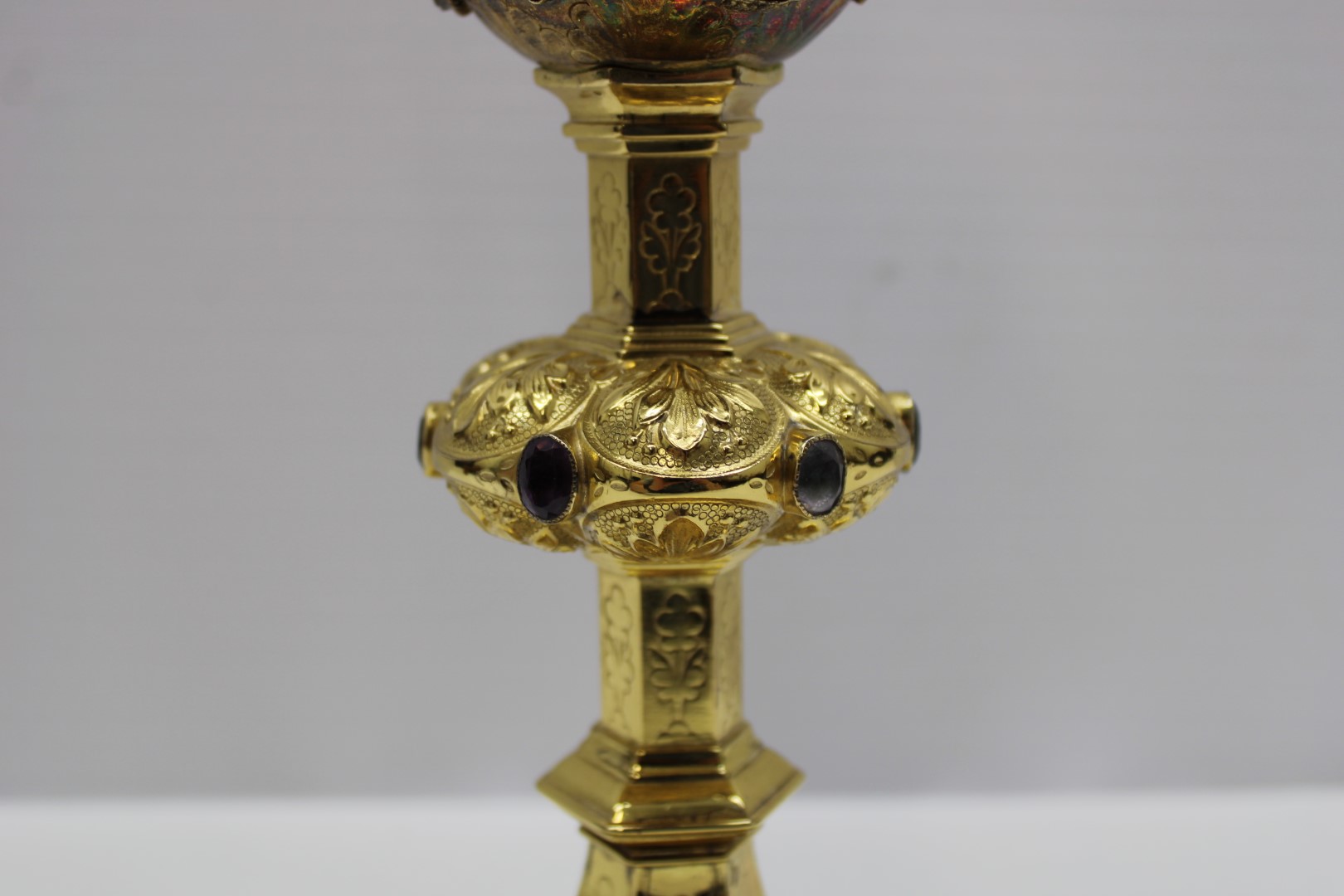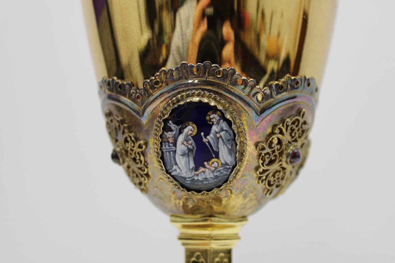This is a previously owned 10 1/8" French sterling silver chalice. This piece features multiple enamel medallions, all of which have some damage to them, and a beautifully ornate node.