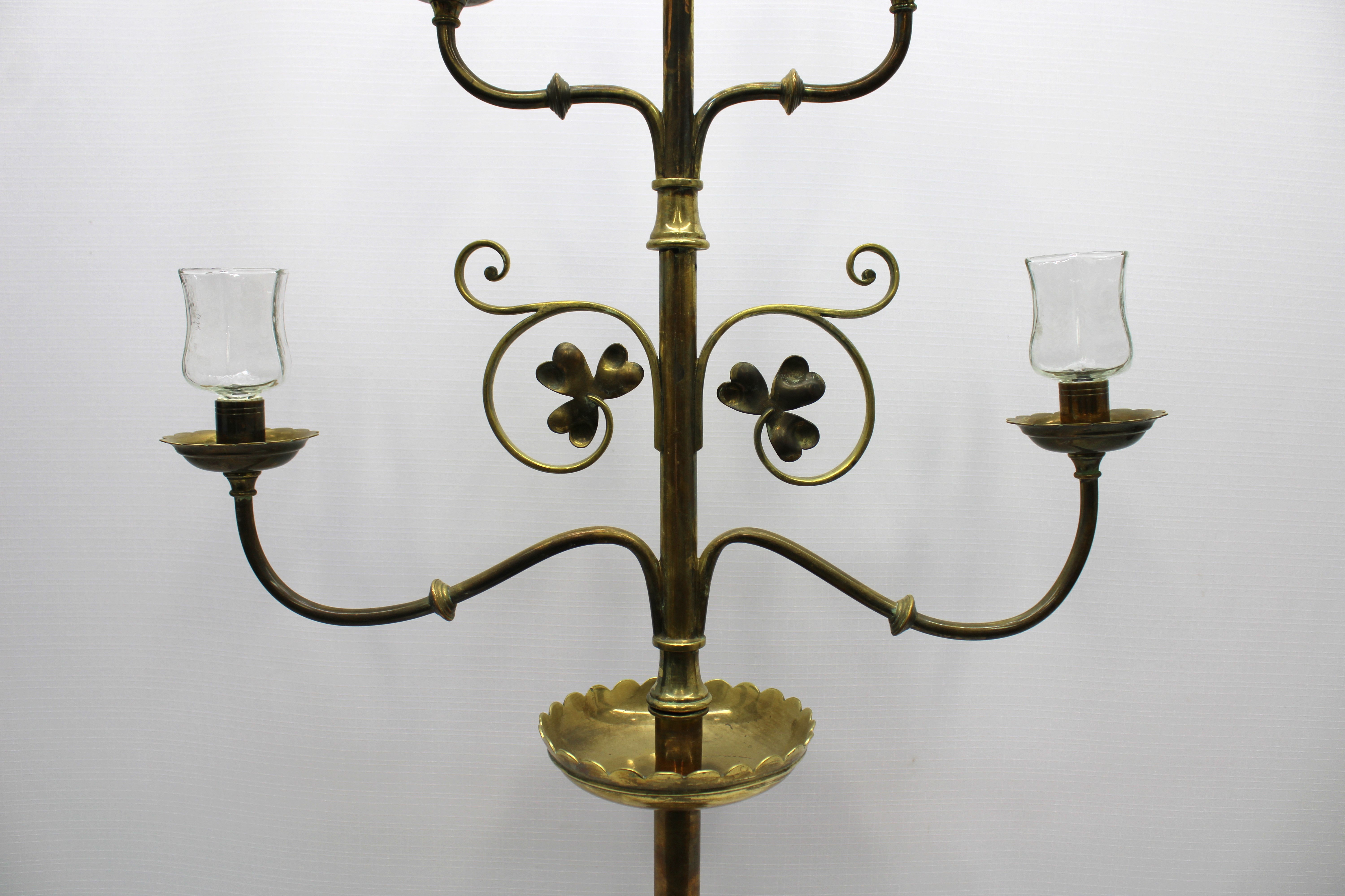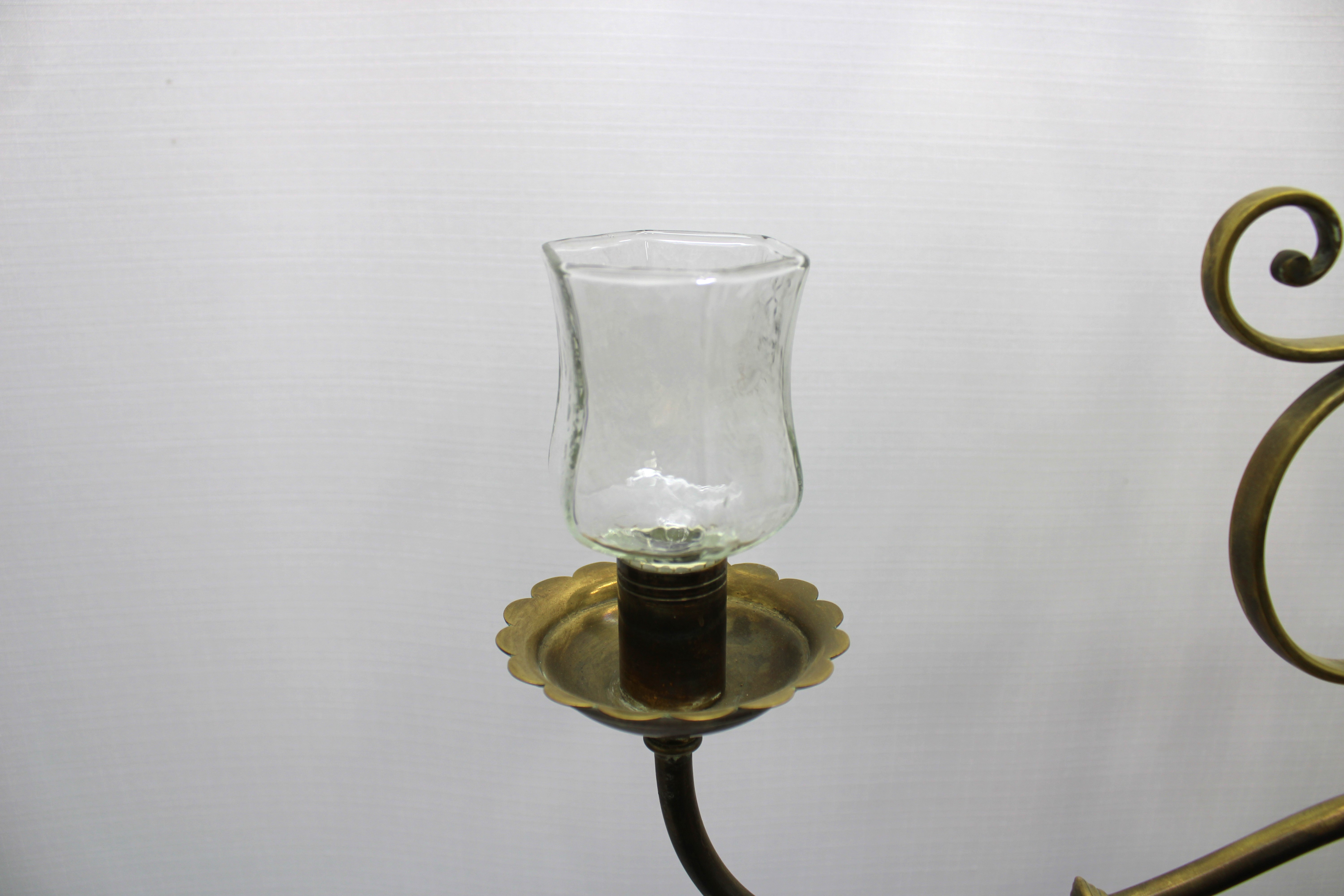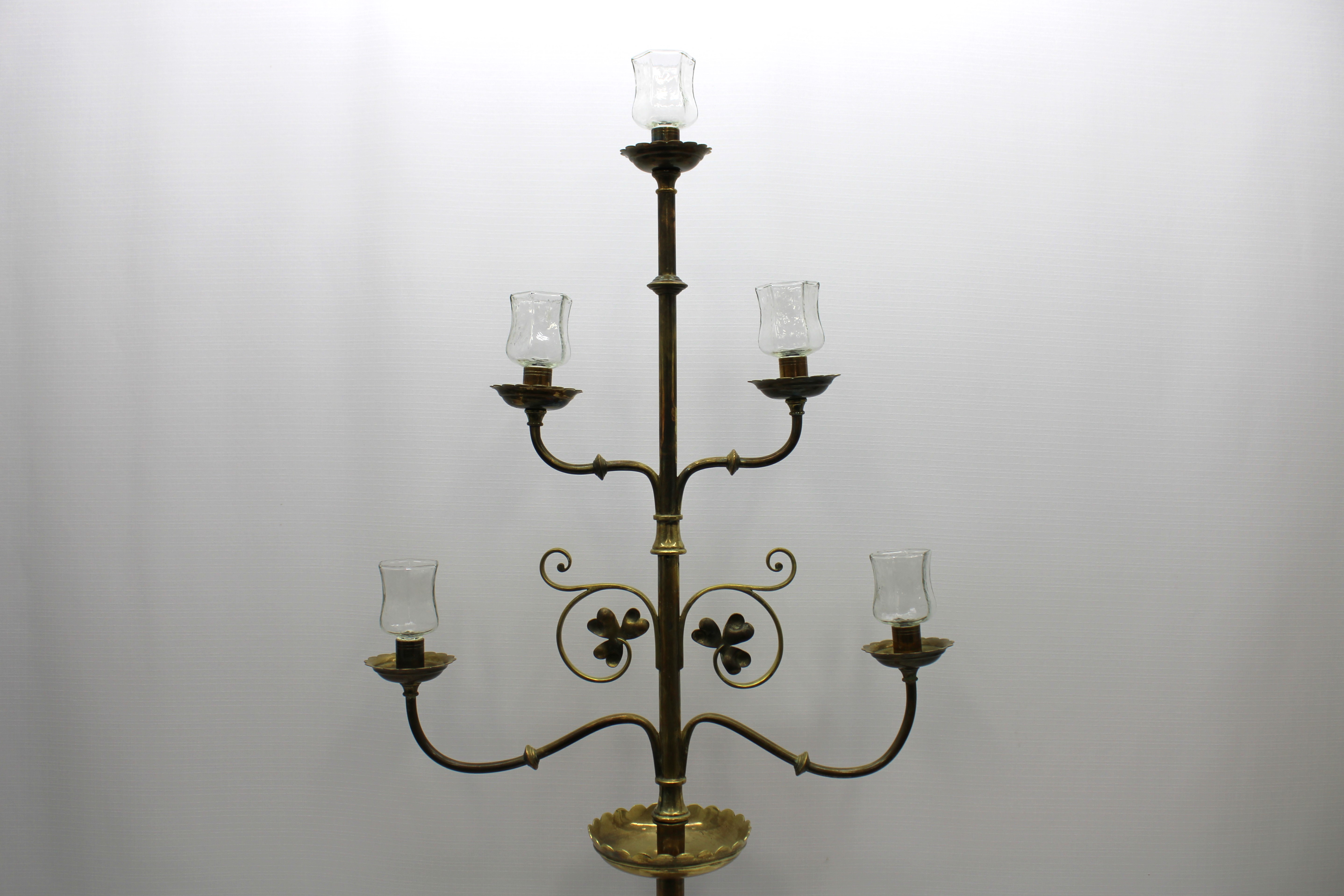 This a previously owned brass 5 lite candelabra with clover ornamentation. This piece is 42" to the top of the glass votive holders, which are included.