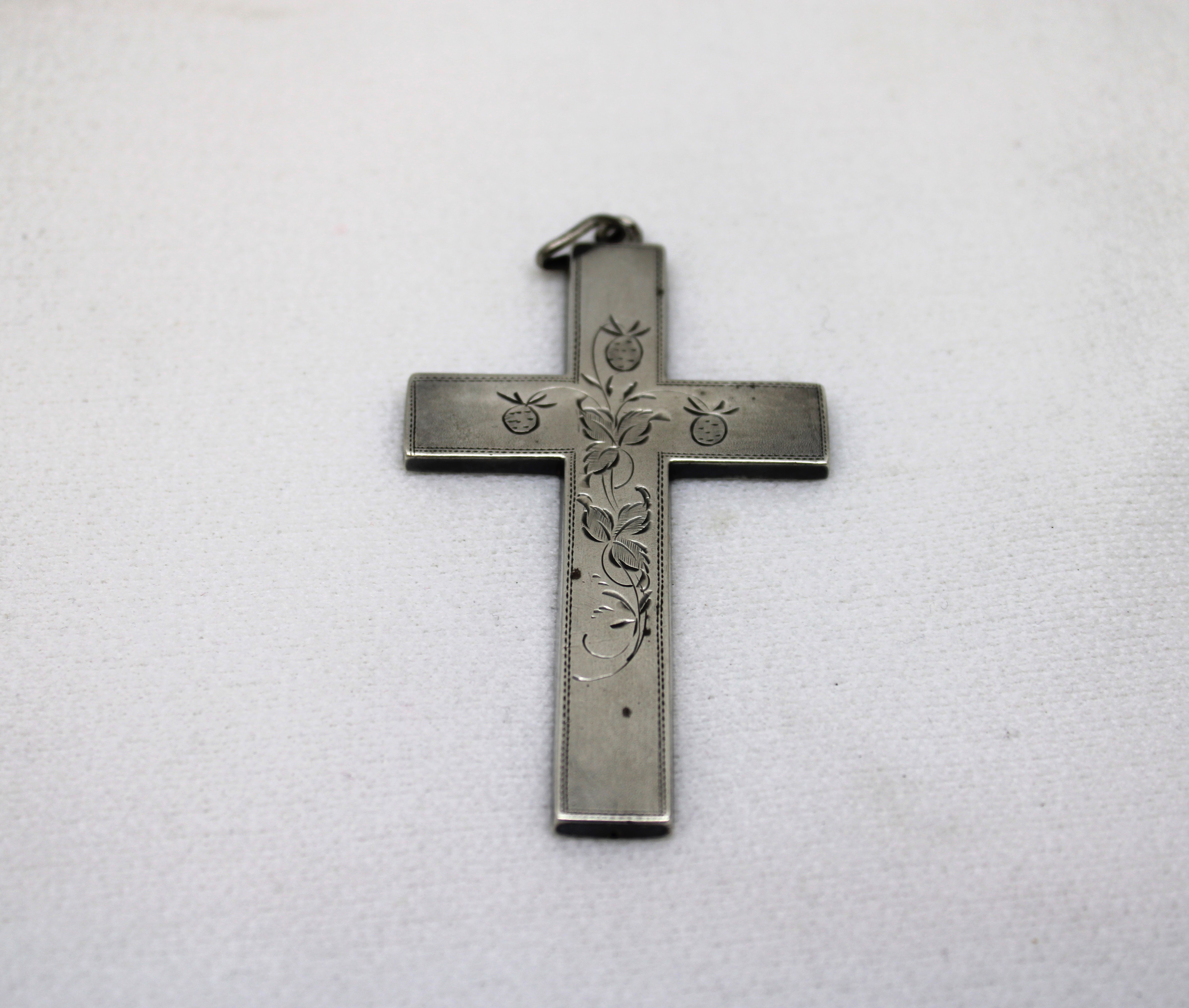 This is an antique sterling silver pectoral cross that measures 3" and features ornate hand-made engravings.