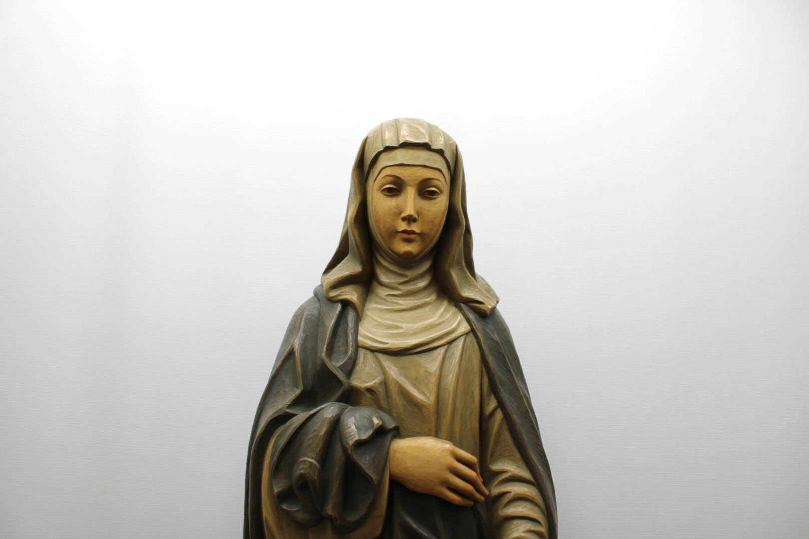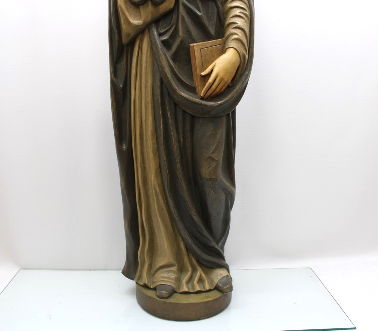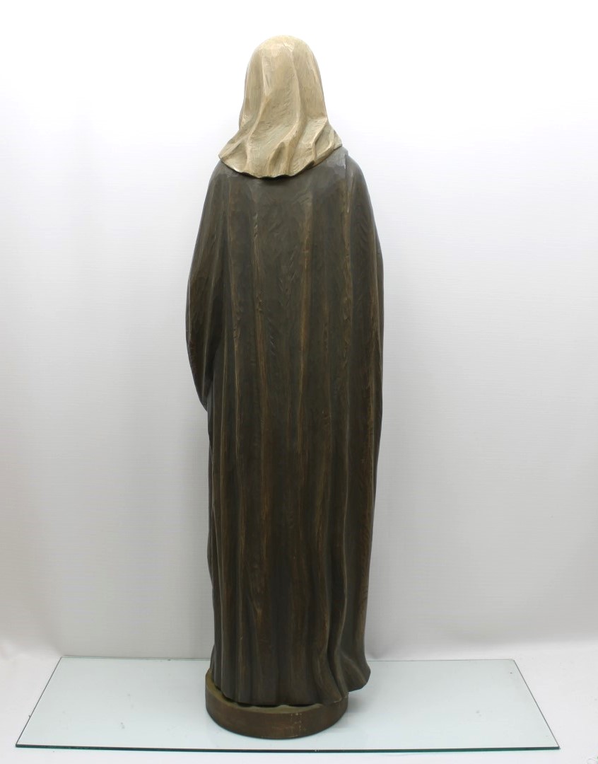 This is a previously owned wood carved statue of St. Catherine of Siena standing 42" tall. This piece is in great shape with only minor paint wear.