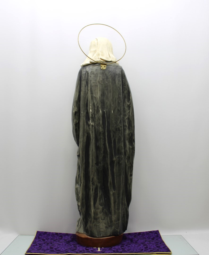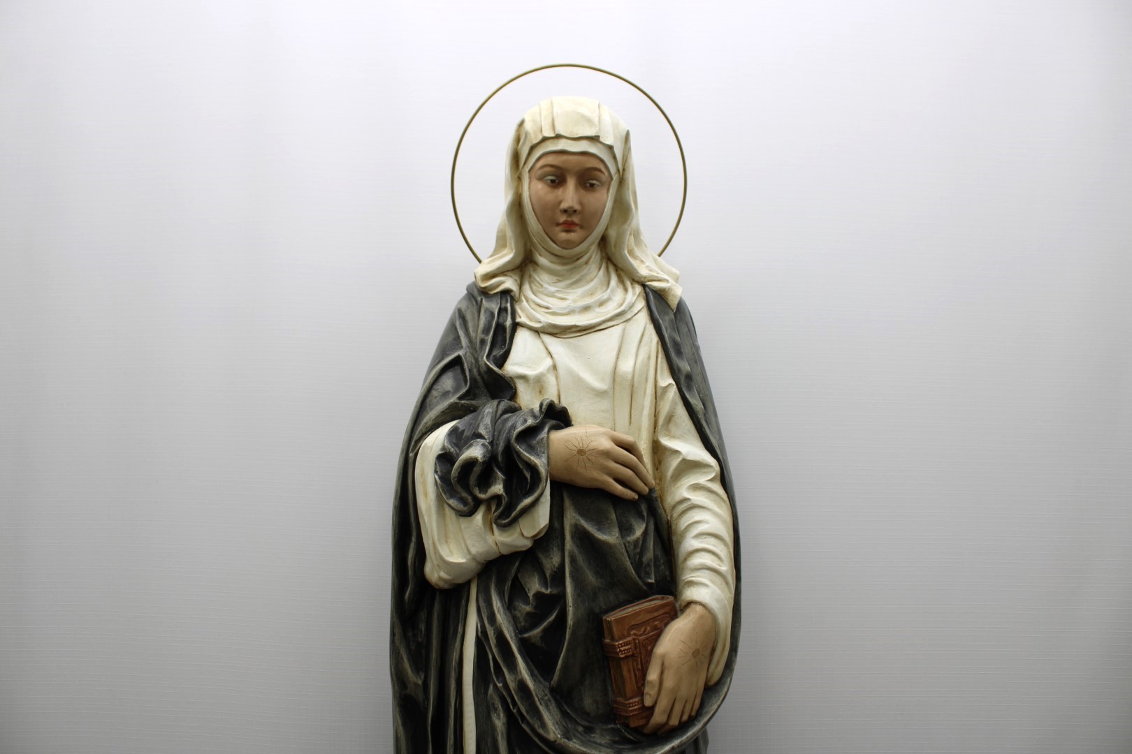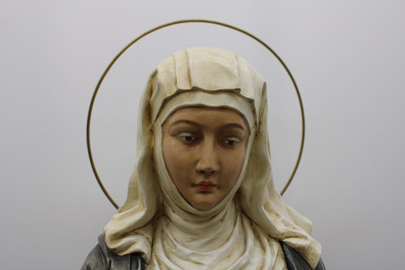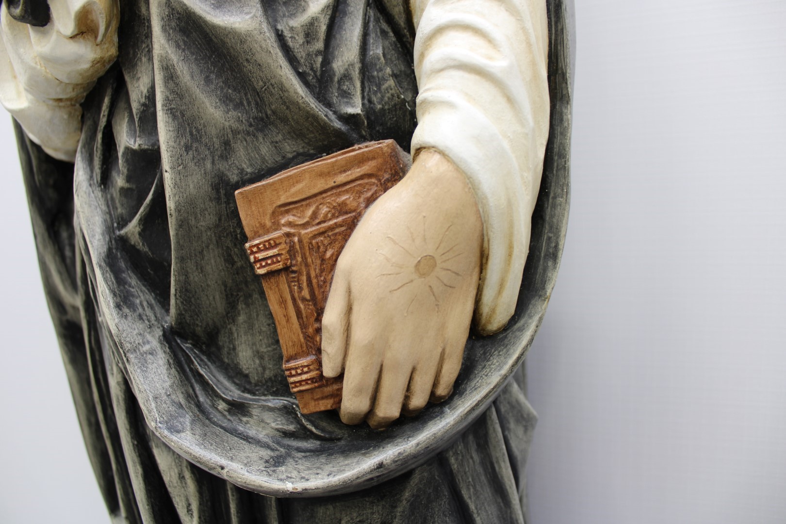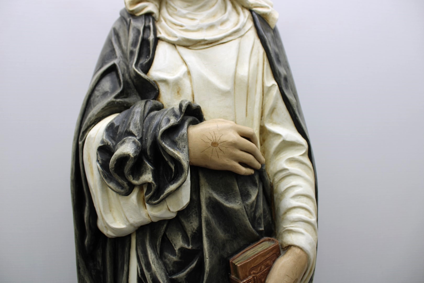 This is a previously owned 40" wood carved statue of St. Catherine of Siena. This piece is in great condition and features a metal halo. There is some minor cracking in the paint.