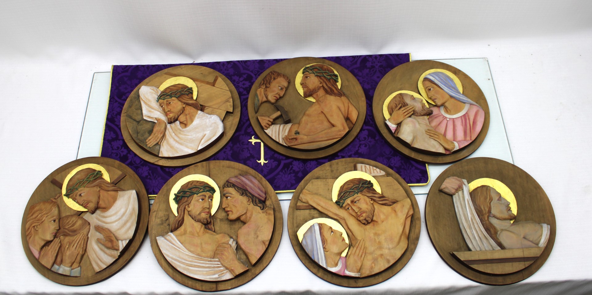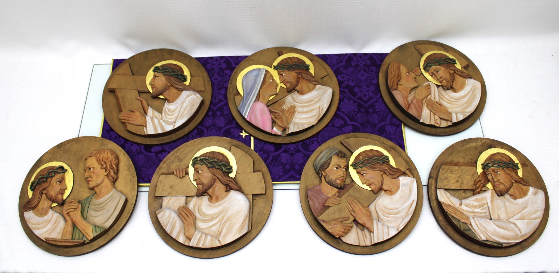 This is a full set of used set of stations of the cross. The rounds are wood carved, measure 9 1/2" diameter, and includes separate numeral rounds.