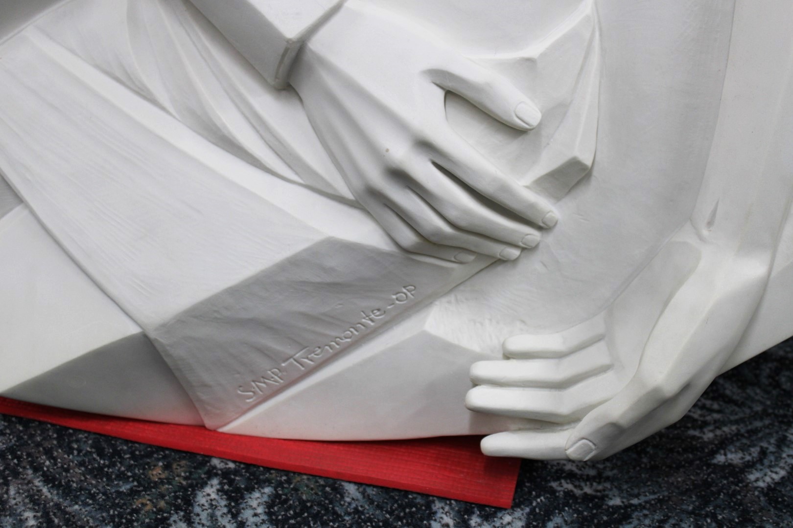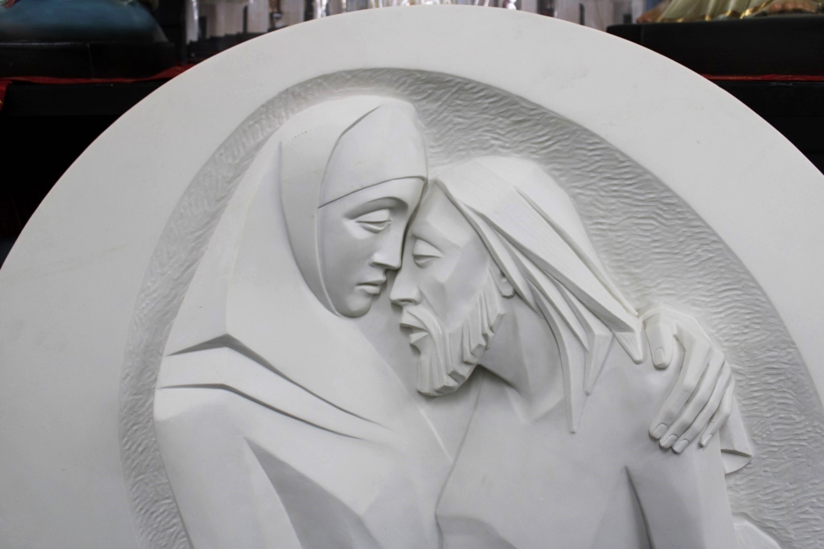 This is a solid marble relief of Pieta, measuring 41" in diameter. This piece works well indoors and outdoor locations such as cemeteries, statue gardens, or hung on the facade of a church.