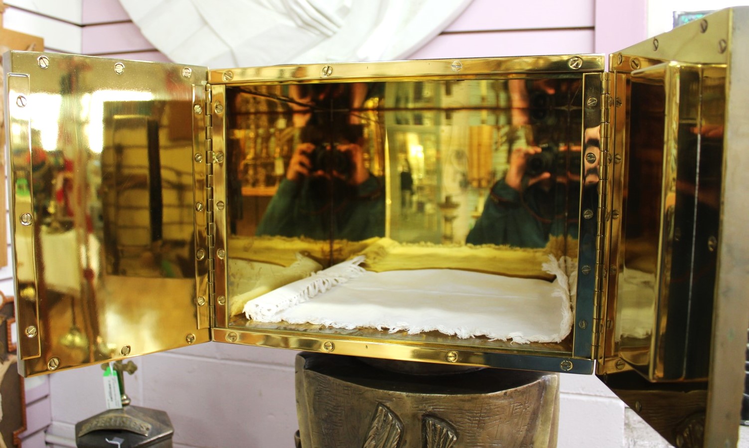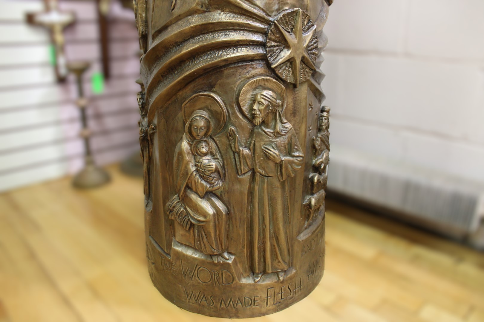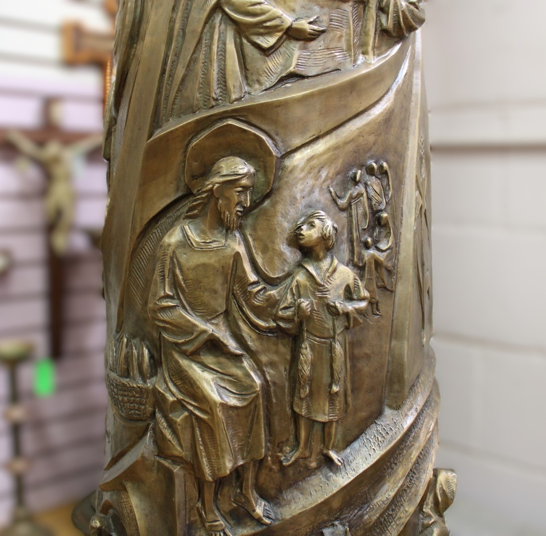 This is a previously owned cast bronze tabernacle standing 62 1/2" tall, with depictions of the life of Christ throughout the base and high polish interior. This is truly a large and magnificent piece.