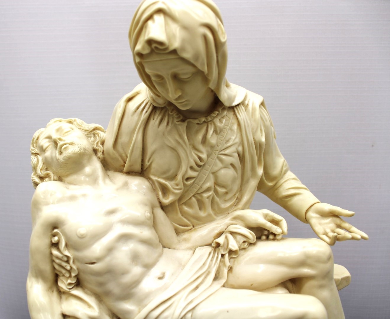 This is a previously owned marble composite statue of the Pieta. This piece stands 17" tall and is in good condition.